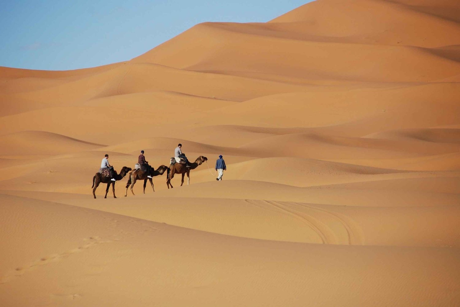 Dag 1: Marrakech - Ait Benhaddou -Ouarzazate - Dades-kløften Afgang fra Marrakech via Tichka-passet i 2260 meters højde, besøg i Kasbah Ait Ben Haddou, frokost i Ouarzazate og besøg i filmstudierne Cinema og Kasbah Ait Benhaddou (hvis der stadig er tid til det), du krydser den storslåede oase Skoura, Kalaat M'gouna og derefter rosernes dal for at nå Dades-kløfterne, hvor du tilbringer en nat på hotellet (halvpension). Dag 2 : Dades-kløften - Merzouga Afgang om morgenen for at komme endnu længere ud i ørkenen til Merzouga, på vejen besøger du de tusind kasbahers dal, Tinghir, Gorges de Todra, Erfoud, Rissani og den storslåede oase Tifilalte, for til sidst at nå erg Chabi i Merzouga. Du tager en kameltur for at beundre solnedgangen og slutter dig derefter til bivuakken, hvor du overnatter under den klare himmel og fuld af stjerner. (Middag på stedet) Dag 3: Merzouga - Marrakech Tidligt om morgenen kan du beundre solopgangen og spise morgenmad. Afgang til Marrakech via Erfoud, Ouarzazate, hvor du spiser din frokost. Retur til Marrakech omkring kl. 19.Includes