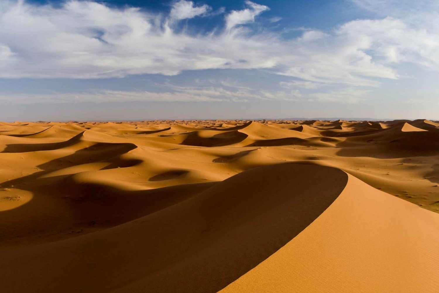 Privat komfortabelt køretøj med aircondition Afhentning og afsætning på hotel Privat service Professionel tosproget chauffør Transportforsikring 3 morgenmad og 3 middage Kameltur i solnedgangen til ørkenen Sandboarding Berber-trommer og musikoplevelse 4WD-transport ved solopgang fra ørkenlejren til mødestedet med chauffør 2 overnatninger i en komfortabel traditionel riad eller på hotel med privat badeværelse 1 overnatning i en luksuriøs lejr i Merzouga-ørkenen med privat badeværelse Varme brusere og toiletter WifiImportant Information