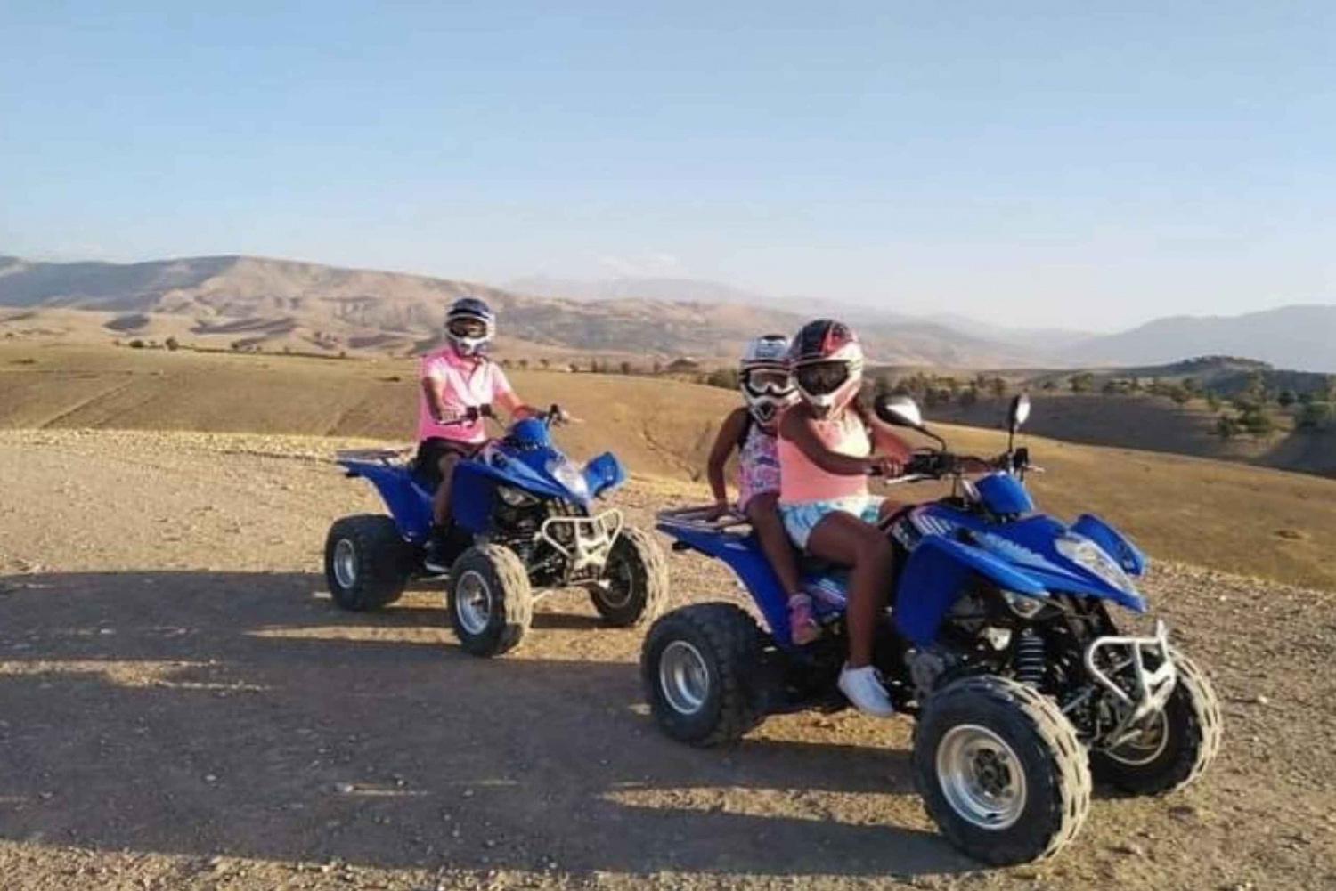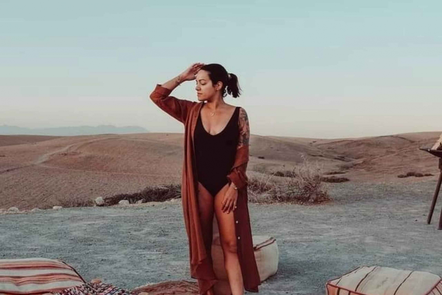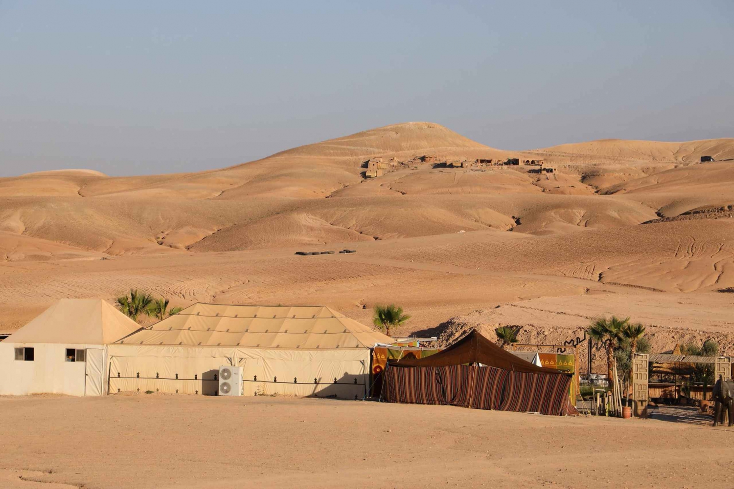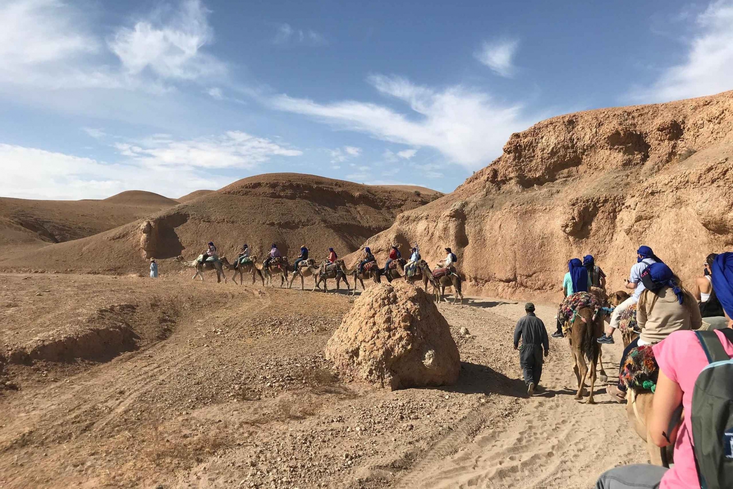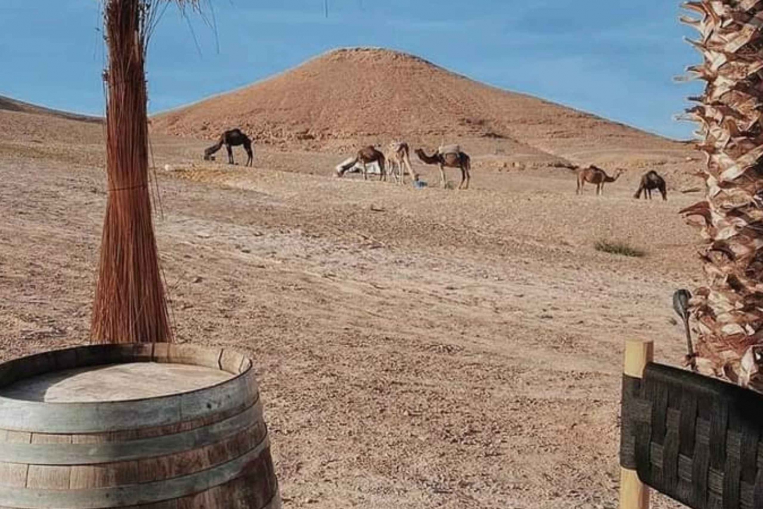 - Turen starter kl. 16:00; afhentning begynder omkring kl. 15:30. Retur til Marrakech kl. 20:30-21:30. Vi henter dig på dit hotel eller riad i Marrakech. Hvis det ikke er tilgængeligt i bil, skal du ikke bekymre dig, vi aftaler et mødested i nærheden, kun en kort gåtur væk. Du får oplysninger om afhentning via Whtsp (hovedkontakt) og e-mail (backup) inden turen starter. Hvis du booker efter kl. 13.30, skal du ikke bekymre dig, vores team følger op kort efter med oplysninger om afhentning. Under bookingen: Hvis din indkvartering ikke vises på afhentningslisten, betyder det sandsynligvis, at den ligger uden for vores standard afhentningszone. Bare rolig - vores team vil arrangere et centralt mødested i Marrakech by eller tilbyde en privat afhentning mod et mindre ekstra gebyr. Denne tur inkluderer en kameltur og middagsforestilling. Rejsetiden er ca. 1 time hver vej med toiletbesøg og besøg i et berberkooperativ. Du vil tilbringe ca. 3 timer i Agafay-ørkenen, inklusive en 20 minutters kameltur, derefter 1 time til middag og 1 time og 30 minutter til berbermusik og ildshow.