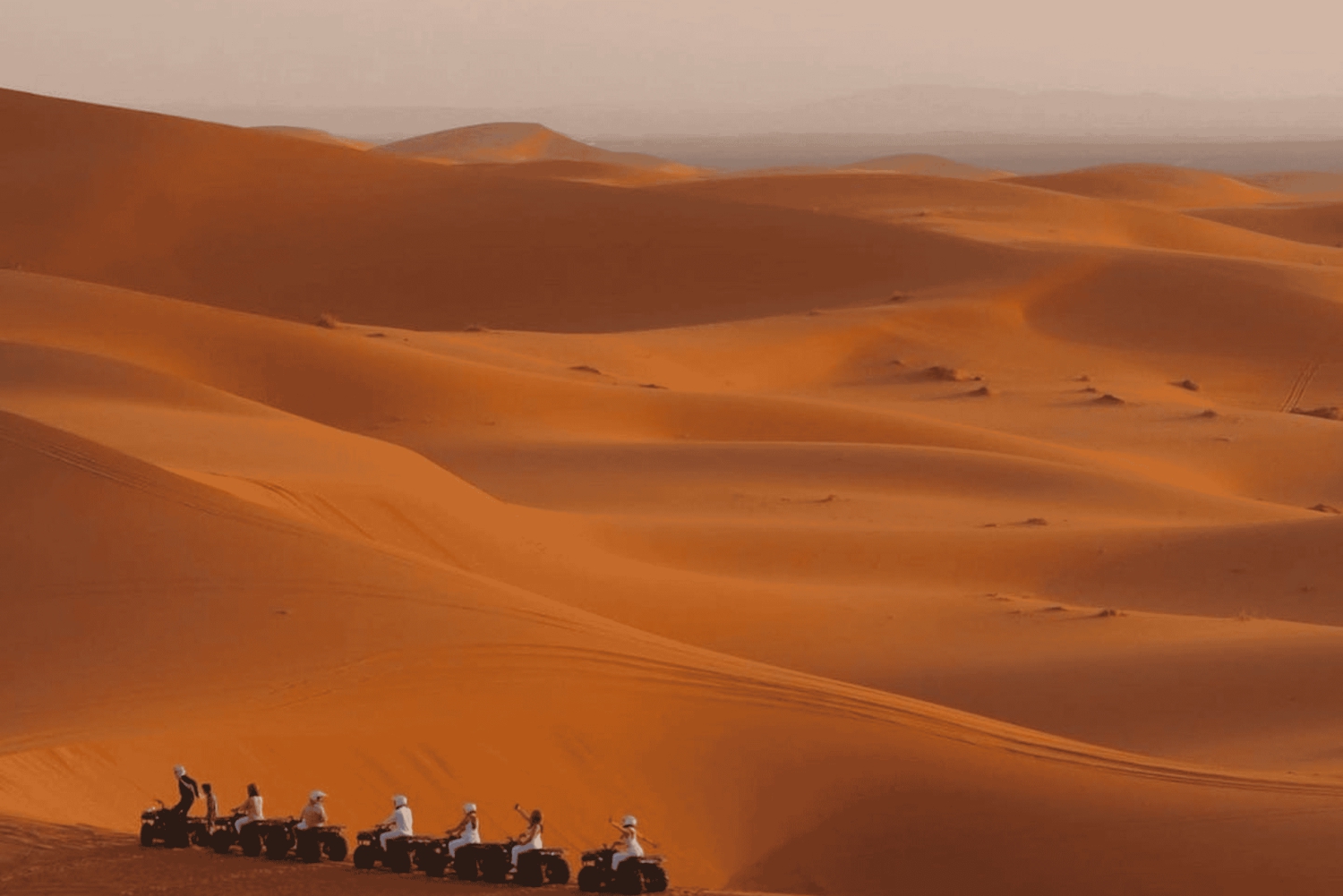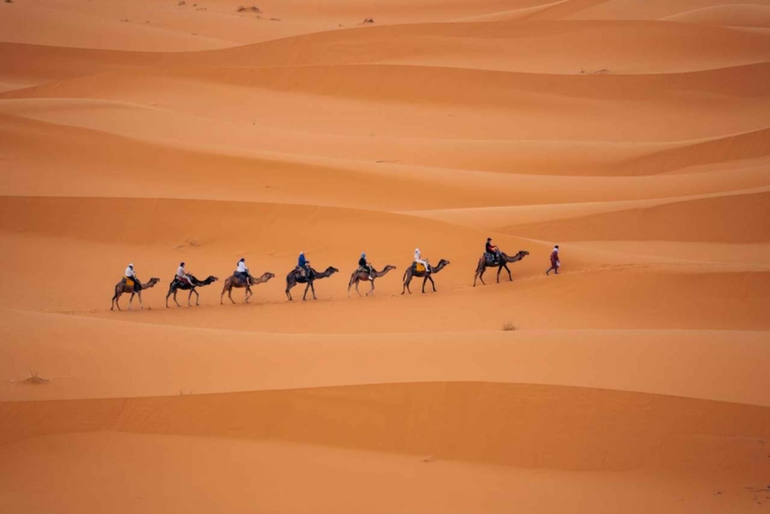 Begib dich auf eine 3-tägige Wüstentour von Agadir nach Marrakesch und entdecke die vielfältigen Landschaften und Kulturen Marokkos. Genieße Kamelritte, übernachte in einem luxuriösen Wüstencamp und erlebe atemberaubende Sonnenuntergänge, Sonnenaufgänge und Sternenhimmel. Tag 1: Agadir - Ait Ben Haddou - Rosental - Tinghir Beginne dein Abenteuer um 7:00 Uhr mit der Abholung von deiner Unterkunft in Agadir. Fahre nach Ait Ben Haddou, einer UNESCO-Welterbestätte und einem berühmten Filmdrehort, um dort zu Mittag zu essen und die Stadt zu erkunden. Anschließend fährst du auf der Straße der Tausend Kasbahs durch das Rosental und das Dades-Tal. Übernachtung in einem Hotel/Riad in Tinghir. Tag 2: Tinghir - Todra-Tal - Wüste Sahara Nach dem Frühstück fährst du in Richtung Merzouga und durchquerst das Todra-Tal mit seinen Berbergemeinden und Palmenhainen. Erkunde die Todra-Schlucht mit ihren hoch aufragenden Klippen. Weiter geht es durch Berberdörfer wie Tinjdad, Melaab und Erfoud. Wenn du die Sanddünen von Erg Chebbi erreichst, machst du einen Kamelritt zu deinem luxuriösen Wüstencamp. Genieße einen atemberaubenden Sonnenuntergang, traditionelle Berbermusik am Lagerfeuer und eine sternenklare Nacht. Übernachtung im Wüstencamp. Tag 3: Merzouga - Rissani - Nkoub - Draa-Tal - Hoher Atlas - Marrakech Wache früh auf, um einen spektakulären Sonnenaufgang über den Dünen zu erleben. Nach dem Frühstück kehrst du nach Merzouga zurück und beginnst deine Reise zurück nach Marrakesch. Du fährst durch Rissani, Alnif, Tazarine und N'kob und genießt die malerische Fahrt durch das Draa-Tal mit seinen historischen Kasbahs und Berberdörfern. Halte zum Mittagessen in Ouarzazate, bevor du das Hohe Atlasgebirge überquerst. Am Abend kommst du in Marrakesch an und beendest deine Tour mit der Rückfahrt zu deiner Unterkunft.Includes