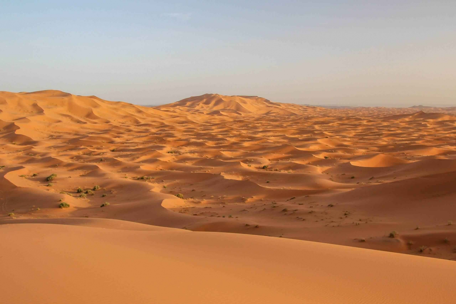 Entdecke ein 5-tägiges Wüstenabenteuer von Marrakesch nach Merzouga. Tag 1: Marrakesch – Ait ben Haddou – Draa-Tal – Zagora Tinfou Abfahrt am Morgen von deinem Hotel/Riad in Marrakesch in Richtung Hoher Atlas und Tichka-Pass (2260 m). Anschließend fährst du auf der alten Karawanenstraße zum wunderschönen Ort der Kasbah von Ait Ben Haddou, eine UNESCO-Welterbestätte. Nachdem du Ait Ben Haddou mit einem ortskundigen Guide erkundet und ein Mittagessen mit Aussicht genossen hast, überquerst du das Anti-Atlas-Gebirge nach Zagora. Probier Sandboarding auf den Dünen aus, schau dir einen atemberaubenden Sonnenuntergang in der Wüste an und verbring eine magische Nacht unter dem Sternenhimmel mit lokaler Musik am Lagerfeuer. Nach dem Frühstück in Zagora fahren wir nach Merzouga. Zuerst halten wir an, um die historischen Sehenswürdigkeiten von Tamgroute zu erkunden, und brechen dann auf, um Tafilalet und die mineralische Weite des Bougafer-Massivs zu durchqueren, um Tazarin zu erreichen und in Alnif zu Mittag zu essen. Wir fahren über Rissani und nehmen dann einen Sandweg, um Merzouga zu erreichen. Dort kannst du einen Kamelritt machen, bevor du den Sonnenuntergang über den Dünen bewunderst und traditionellen Minztee probierst. Tag 3: Erkundung der Region Merzouga Früh morgens aufstehen ist ein Muss, um den wunderschönen Sonnenaufgang mitten in der Wüste zu bewundern. Nach dem Frühstück in aller Ruhe kehrst du auf Kamelen nach Merzouga zurück, wo der Fahrer wartet. Den Tag widmen wir der Erkundung der Region Merzouga. Wir setzen unsere Reise im Dorf Khamlia fort, wo wir Gnaoua-Musik und Tanzvorführungen genießen. Die Einwohner stammen aus Ländern südlich der Sahara wie Mali, Sudan und Niger. Freie Zeit zum Mittagessen in einem Restaurant. Danach machen wir einen Spaziergang im Palmenhain und fahren dann ein paar Kilometer weiter, um den wilden See von Merzouga zu sehen, der auch Flamingosee genannt wird. Abendessen und Übernachtung im Hotel. Tag 4: Erg Chebbi – Erfoud – Todra-Schlucht – Dades-Schlucht Nach dem Frühstück und einer Dusche fahren wir in Richtung Boumalne Dades, mit einem Zwischenstopp in Erfoud (bekannt für seinen Dattelmarkt), dann durch die kleinen Oasen Touroug und Tinejdad, bis wir die berühmte Todra-Schlucht erreichen, wo wir zu Mittag essen. Nach einem kurzen Spaziergang in dieser geologischen Felslandschaft machen wir uns wieder auf den Weg zum wunderschönen Dades-Tal und den Schluchten. Abendessen und Übernachtung. Tag 5: Dades-Schluchten – Tal der Rosen – Ouarzazate – Marrakesch Am Morgen nach dem Frühstück fahren wir über Ouarzazate (unser Hollywood) auf der Straße der tausend Kasbahs in Richtung Marrakesch (die Perle des Südens). Du siehst das wunderschöne Tal der Rosen in Kelaat M'Gouna (der Hauptstadt der Rosen), die Kasbah von Taourirte und machst Mittagspause in Ouarzazate, bevor es weiter durch das Hohe Atlasgebirge nach Marrakesch geht. Deine Wüstentour endet gegen 18 Uhr in Marrakesch.Includes