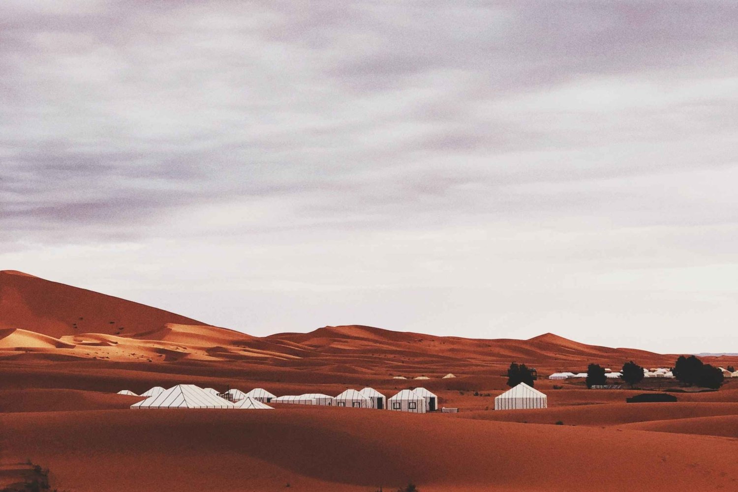 Tag 1:Deine Reise beginnt am Treffpunkt in Merzouga, wo du dein Auto auf einem sicheren Parkplatz abstellen kannst. Von dort aus wirst du mit dem Geländewagen zu den Kamelen gebracht. Euer Gepäck wird mit dem Jeep zum Camp gebracht. Ihr trefft euren Guide und brecht zu einer Kameltour durch die goldenen Dünen von Erg Chebbi auf. Während ihr sanft auf eurem Kamel schwankt, erstreckt sich vor euch die weite, wellige Sandlandschaft und vermittelt ein Gefühl von Ehrfurcht und Ruhe. Das rhythmische Tempo der Kamelkarawane entführt euch aus dem Trubel des Alltags in eine andere Welt. Wenn die Sonne untergeht und die Wüste in ein warmes Licht taucht, kommst du in deinem abgelegenen Wüstencamp an. Eingebettet zwischen den Dünen bietet dein beheiztes Zelt im Berberstil einen gemütlichen Rückzugsort, der traditionelle Einrichtung mit modernem Komfort verbindet. Entspanne dich und lass die Seele baumeln, während sich der Wüstenhimmel in ein funkelndes Sternenzelt verwandelt, eines der klarsten und atemberaubendsten Naturschauspiele, die du je erleben wirst. Genieße ein köstliches marokkanisches Abendessen unter dem Sternenhimmel mit schmackhaften Tajines, frischen Salaten und warmem Brot. Anschließend versammelst du dich am Lagerfeuer zu einem Abend mit traditioneller Musik und Geschichtenerzählen, während lokale Berber-Musiker ihre Kultur durch Gesang und Rhythmus vermitteln. Tag 2:Steh früh auf, um den Sonnenaufgang in der Wüste zu erleben, ein wahrhaft magischer Moment, wenn das erste Licht des Tages die Dünen in sanfte Rosa- und Orangetöne taucht. Nach einem herzhaften Frühstück steigst du wieder auf dein Kamel oder in deinen Geländewagen und fährst gemütlich zurück zum Parkplatz, wo dein Wüstenabenteuer endet.Includes