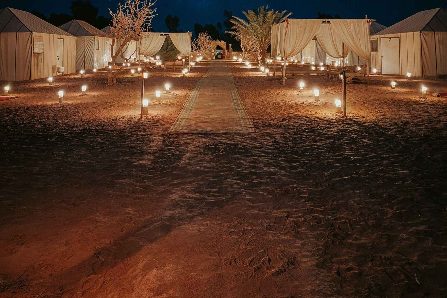 Kostenloses Parken 4x4 Abholung auf der Hin- und Rückfahrt Gepäcktransfer Jedes Kamel Privates Zelt mit eigenem Bad und heißer Dusche Abendessen Wasser zu den Mahlzeiten Trommelparty FrühstückEasy cancellation