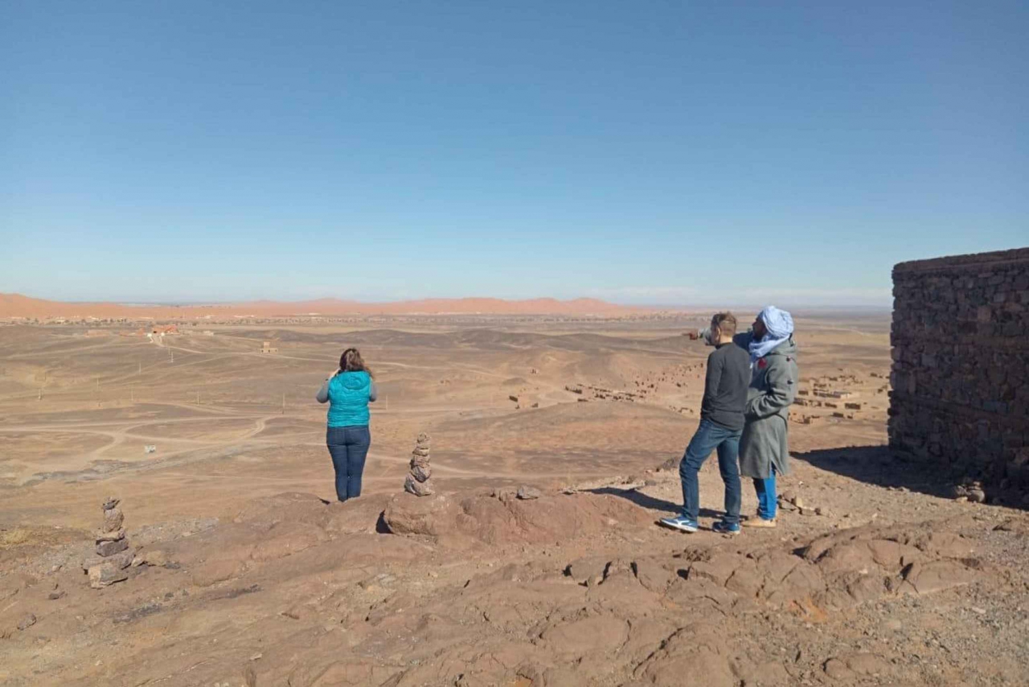 Tag 1: Ouarzazate nach Merzouga Du startest am Morgen in Ouarzazate und fährst nach Ait Ben Haddou, um die UNESCO-Welterbestätte, ein altes befestigtes Dorf, zu besuchen. Verbringe etwa eine Stunde mit der Erkundung. Dann geht es weiter ins Draa-Tal, vorbei an wunderschönen Palmenhainen und traditionellen Berberdörfern wie Agdz und Nkob (wo du ein traditionelles marokkanisches Mittagessen zu dir nehmen kannst). Weiter geht es nach Merzouga zu den Erg Chebbi-Dünen, wo du dich dem Team anschließt und deinen Kamelritt beginnst. Abendessen und Übernachtung im Camp. Tag 2: Merzouga nach Dades Die Tour beginnt am frühen Morgen, um den atemberaubenden Sonnenaufgang über den Dünen zu beobachten. Dann genießt du dein Frühstück, bevor du aufbrichst. Dein erstes Ziel ist Rissani, wo du den lokalen Markt und das Mausoleum von Moulay Ali Cherif, dem Gründer der Alaouiten-Dynastie, besuchst. Dann geht es weiter zur Todra-Schlucht, wo du einen kurzen Spaziergang durch die Schlucht machen kannst. Anschließend fährst du weiter zum Dades-Tal, das für seine wunderschönen Felsformationen und Kasbahs bekannt ist. Check-in in Dades für Abendessen und Übernachtung. Tag 3: Dades nach Marrakech Nach dem Frühstück fahren wir nach Marrakesch durch das Tal der Rosen und die Oase Skoura mit ihren Kasbahs. Nach einer Mittagspause setzen wir die Fahrt über den malerischen Tizi n'Tichka-Pass fort, halten für Fotos an und genießen den Panoramablick. Ankunft in Marrakesch am frühen Abend zum Abschluss der Tour.Includes