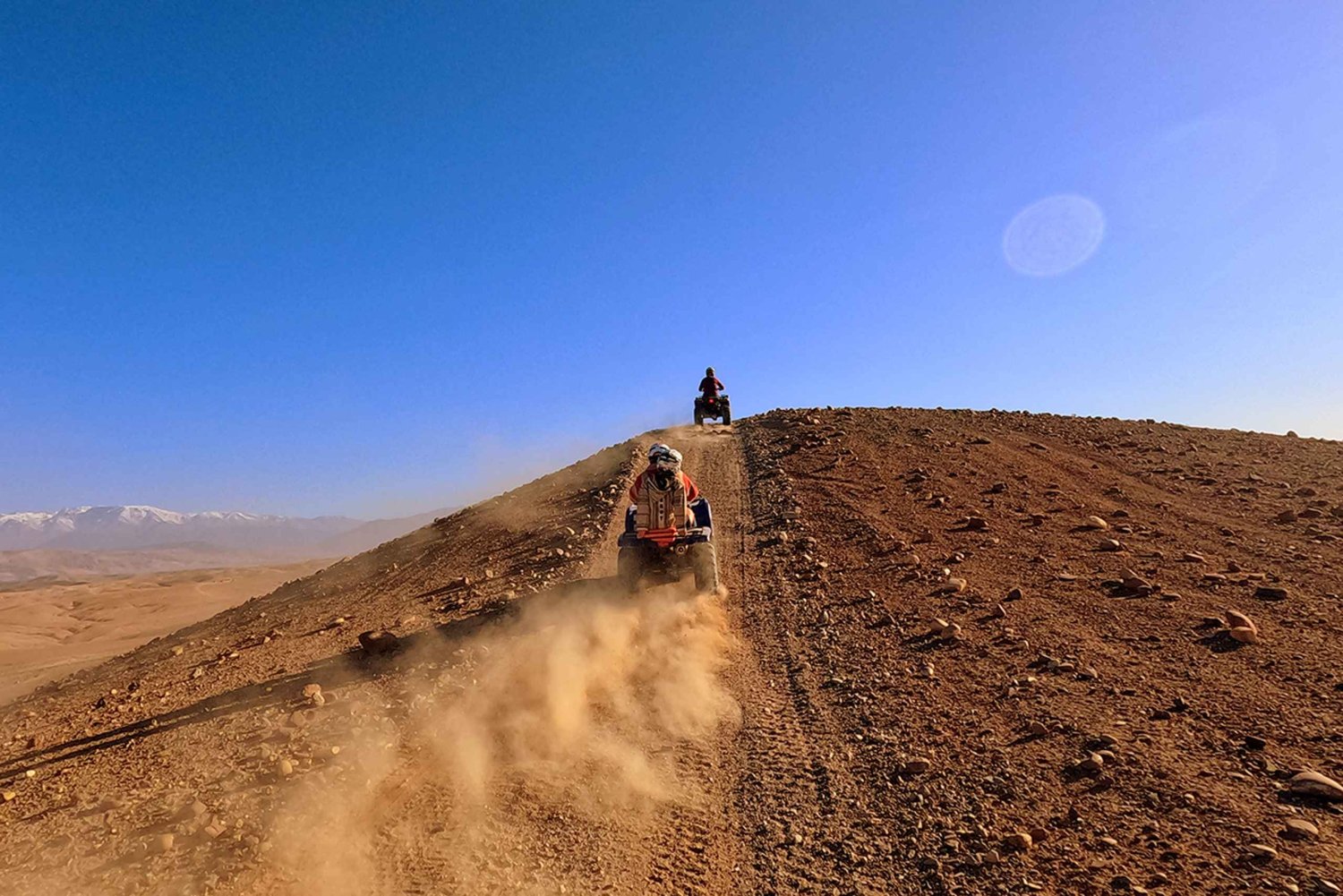 Embárcate en una emocionante aventura de un día, ¡combinando experiencias en camello y en quad! Te recogeremos en tu hotel de Marrakech y te presentaremos a nuestro amable equipo, que te guiará por el programa del día. Disfruta de un paseo en camello, saborea un delicioso tajine o cuscús marroquí, y súbete a un quad para una excursión cargada de adrenalina. Nuestro equipo especializado garantiza tu seguridad y te proporciona unas vacaciones inolvidables. Explora los áridos paisajes del sur de Marrakech, pasando por wadis, pueblos locales y el impresionante desierto de Agafay, todo ello con las magníficas montañas del Atlas como telón de fondo. Siéntete como un auténtico aventurero, ataviado con un cheich (pañuelo nómada) para el paseo en camello, y equipado con casco, pasamontañas y gafas para la excursión en quad. Sumérgete en el corazón de Marruecos, donde un mundo diferente te espera más allá de la bulliciosa ciudad de Marrakech. Experimenta el auténtico encanto de esta excursión superventas, que capta la esencia de Marruecos. Acompáñanos en un viaje inolvidable a un universo encantador. Esperamos ansiosos tu llegada.Includes