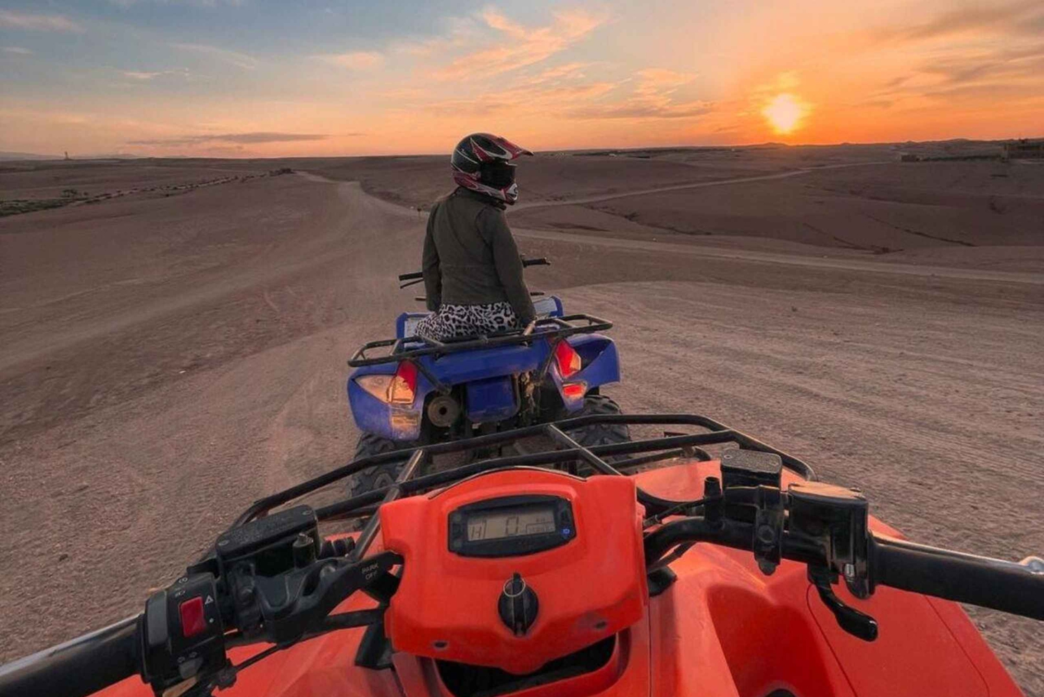Embárcate en un viaje inolvidable con un cómodo servicio de recogida del hotel en Marrakech, viajando hacia el impresionante desierto de Agafay. Empieza el día sumergiéndote en las tradiciones marroquíes con una visita a la Cooperativa de Mujeres del Aceite de Argán. Aquí tendrás la oportunidad de conocer a artesanas apasionadas y presenciar el intrincado proceso centenario de elaboración a mano del aceite de argán. A continuación, experimenta la tranquilidad del desierto con un pintoresco paseo en camello por las suaves dunas. Haz coincidir tu paseo con la impresionante puesta de sol en el desierto, ya que el cielo se pinta de bellos tonos naranja, rosa y morado. La aventura se intensifica cuando te subes a un quad por el vasto terreno desértico, levantando arena dorada mientras corres por las dunas. Al caer la noche, disfruta de una cena tradicional bajo las estrellas, acompañada por los ritmos de la música en directo. Déjate cautivar por las actuaciones de los bailarines bereberes tradicionales y los deslumbrantes bailarines del fuego, que añaden un elemento de magia a la velada. Por último, relájate mientras te llevan de vuelta a Marrakech, reflexionando sobre los recuerdos de un día lleno de aventura, cultura y experiencias únicas. El viaje incluye - Tour guiado - Transporte de ida y vuelta (servicio de recogida y regreso) - Paseo en camello - Cena - Música y espectáculo bereber - Experiencia en quad - Sin costes adicionales: todo está incluidoIncludes