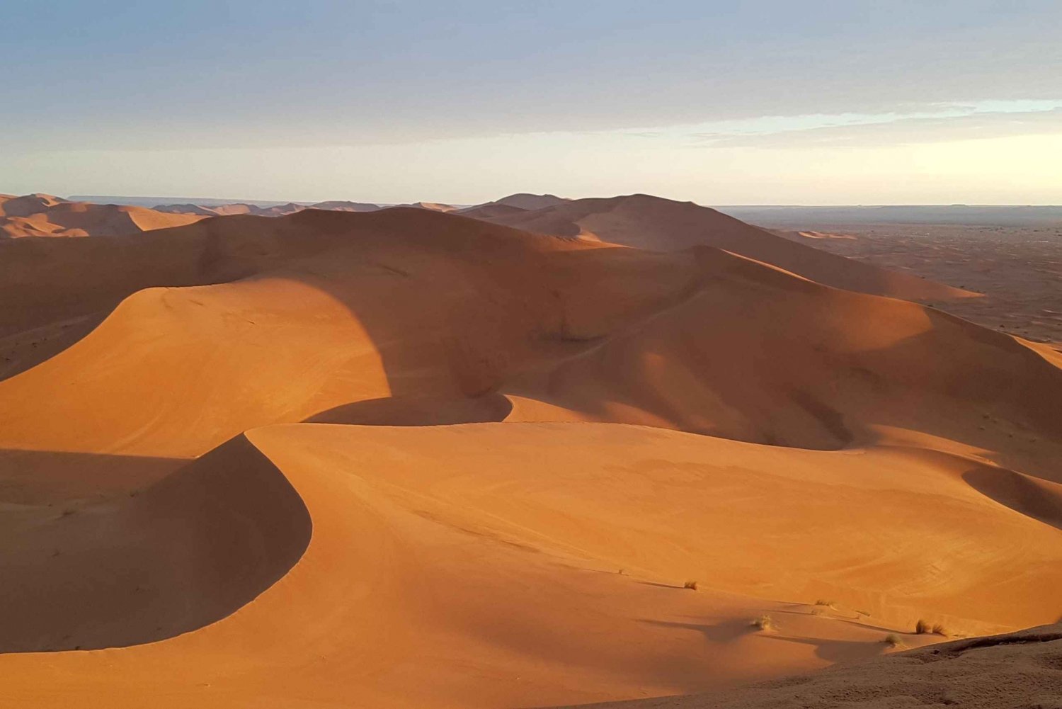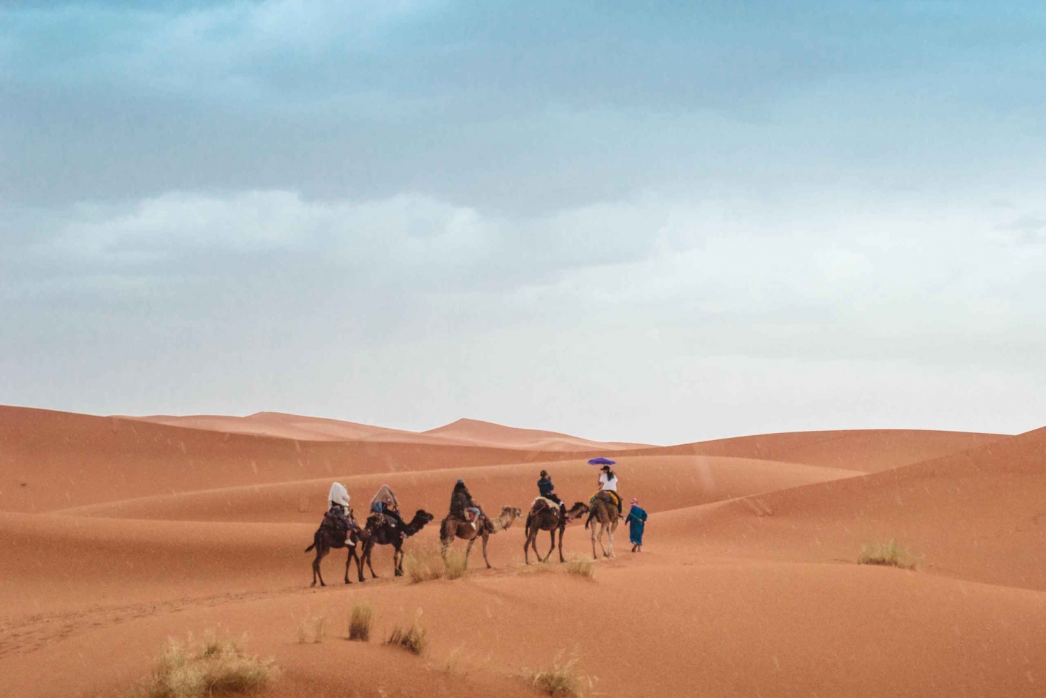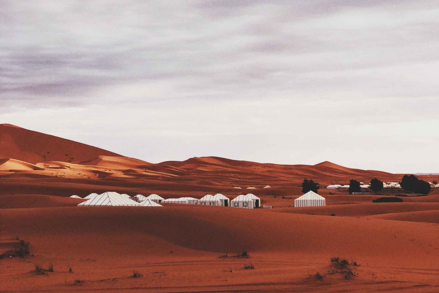 Programa: Día 1: Fez >> Ifrane >> Azrou > Bosques del Ceder > Midelt >> Erfoud >> Merzouga A las 8:00, comenzarás tu viaje imperial por el desierto de Fez a Marrakech, de 3 días de duración, a través del desierto del Sahara. De camino a Midelt, atravesarás la cordillera del Atlas y los bosques de cedros del Atlas Medio. Pasarás por Ifrane, una encantadora estación de esquí, y por Azrou, un importante centro artesanal especializado en trabajos en madera de cedro. En los bosques de cedros de Azrou, harás una parada para descansar y pasar un rato libre con los juguetones monos del bosque. El almuerzo será en Midelt, la capital de las manzanas. Por la tarde nos dirigiremos a Erfoud y nos adentraremos en el desierto. Al llegar a las dunas de Erg Chebbi, un corto trayecto en todoterreno te llevará al borde de las dunas doradas, donde los camellos esperan tu llegada. Cargarán tu equipaje en un coche 4x4 y lo llevarán al campamento, para que puedas dar un encantador paseo en camello por las dunas de arena. En medio de las majestuosas dunas doradas de Merzouga cárgate de energía positiva y disfruta de la magnífica puesta de sol. También puedes practicar sandboard y esquí en la suave arena. El paseo en camello para llegar a tu campamento dura 1 hora en cada sentido. El camellero te llevará al mejor lugar donde podrás hacer fotos y disfrutar de la mejor puesta de sol de tu vida. En el campamento, te recibirán con té, dátiles y las hermosas sonrisas de los bereberes. Tras una taza de té a la menta, te mostrarán tus tiendas privadas de lujo con baño y ducha privados. Tu tienda estará equipada con todas las comodidades y camas confortables. Mientras se prepara la cena, puedes relajarte y ducharte con agua caliente o dar un paseo explorando la zona. Después de la cena, empezará el festín. Estaréis sentados alrededor de una hoguera bajo una noche estrellada. Bailarás, cantarás e intercambiarás pensamientos y cultura con los bereberes. Después del festín, puedes dar un breve paseo por las dunas y disfrutar del cielo brillante; esperamos que veas una estrella fugaz :) Día 2: Merzouga- Regreso a Fez Levántate temprano para presenciar el impresionante amanecer en Erg Chebbi y tomar un delicioso desayuno. A continuación, prepárate para salir del campamento hacia tu fez de distinación con algunas paradas en el camino. (Pausa para comer por tu cuenta). Te dejaremos cerca de tu alojamientoIncludes