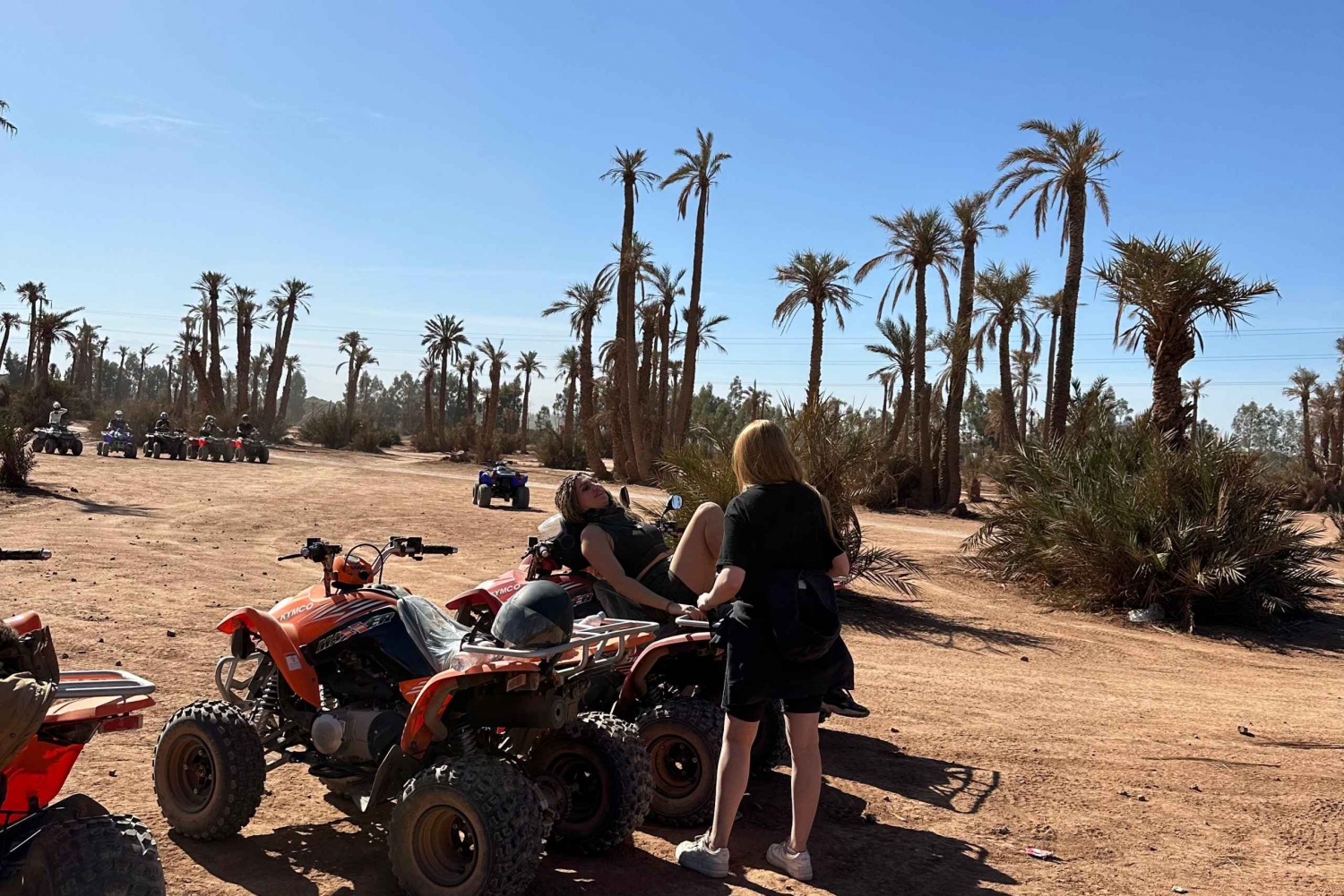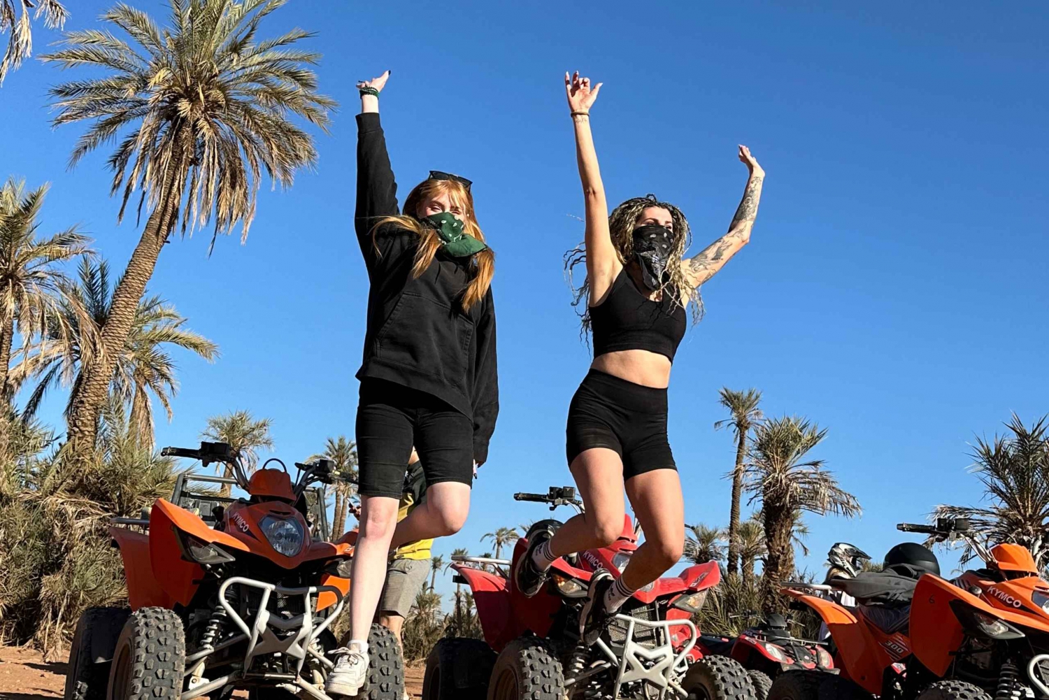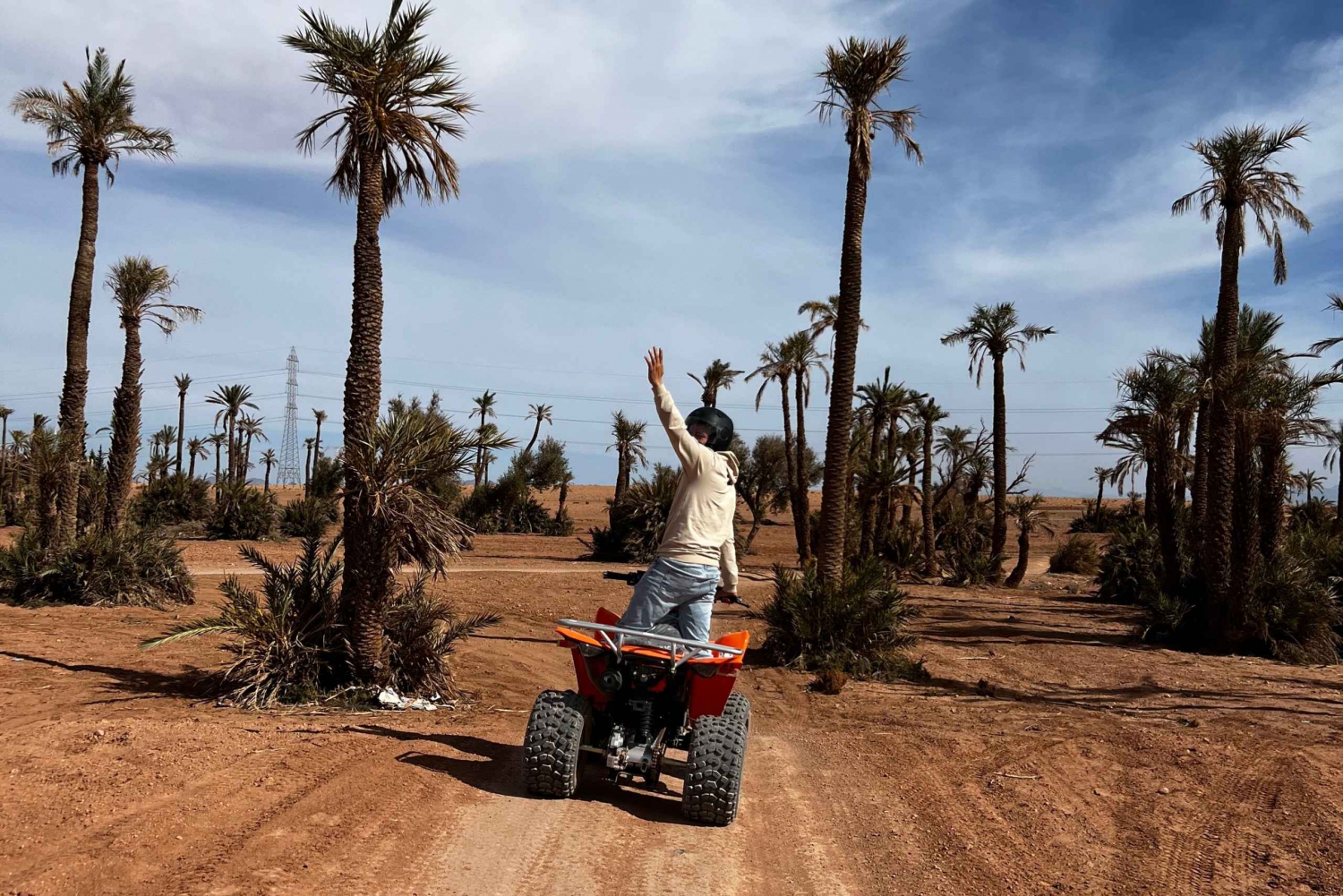 Prepárate para una estimulante aventura mientras te embarcas en una experiencia de 2 horas en quad por el cautivador Desierto de las Palmeras. Esta actividad promete un viaje lleno de adrenalina por los impresionantes paisajes del Oasis, proporcionándote una experiencia inolvidable y emocionante. Al llegar al punto de partida, serás recibido por nuestros experimentados y amables guías, que te proporcionarán un completo briefing de seguridad e instrucciones sobre el manejo de los quads. No se requiere experiencia previa, por lo que esta actividad es adecuada tanto para principiantes como para pilotos experimentados. Una vez que estés preparado, súbete a tu quad y emprende una emocionante exploración del Palmeral. Siente la adrenalina mientras navegas entre las palmeras, sumergiéndote en la impresionante belleza de los alrededores del Oasis. La vasta extensión del desierto ofrece un telón de fondo único y sobrecogedor para tu aventura. Mientras cabalgas por el desierto, tendrás la oportunidad de contemplar los impresionantes paisajes naturales, con vistas panorámicas que se extienden hasta donde alcanza la vista. Capta la belleza del desierto con tu cámara o simplemente tómate un momento para empaparte de la tranquilidad y serenidad del entorno. Nuestros experimentados guías te guiarán por las mejores rutas, garantizando una experiencia segura y agradable. También compartirán contigo datos e historias interesantes sobre el desierto, añadiendo profundidad a tu viaje y mejorando tu comprensión del entorno local. Tras un emocionante paseo, volverás al punto de partida, donde podrás relajarte y reflexionar sobre la increíble experiencia que acabas de vivir. Nuestro equipo estará a tu disposición para ayudarte con cualquier pregunta o duda que puedas tener. Al final de la actividad, tienes la opción de que te dejen en tu hotel, lo que te permitirá relajarte y rememorar tu aventura. Alternativamente, si te encuentras en un lugar céntrico, puedes seguir explorando la zona y aprovechar al máximo tu tiempo en el Palmeral de Marrakech. No te pierdas esta emocionante experiencia en quad por el Palmeral. Reserva ahora y prepárate para la aventura de tu vida.Includes
