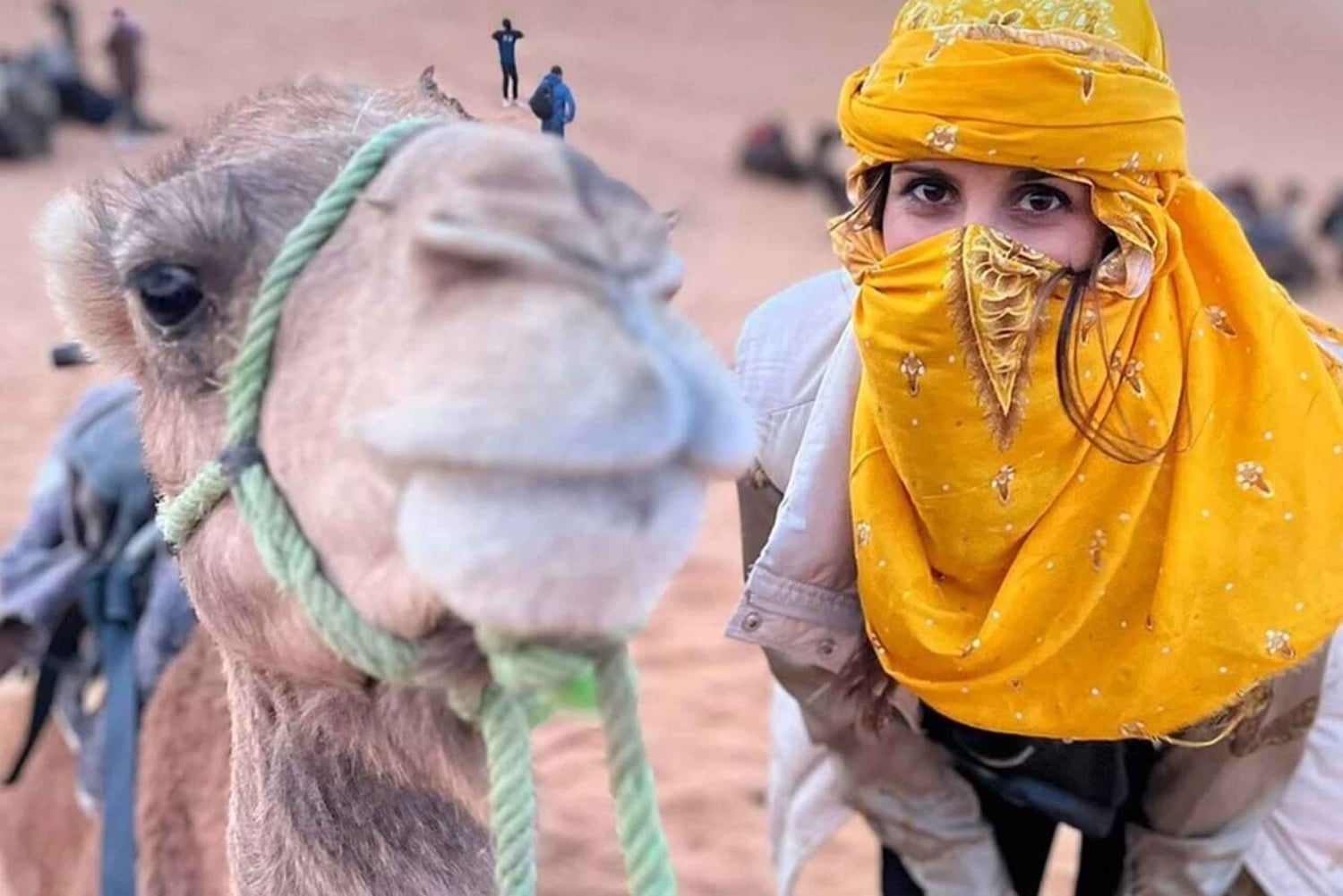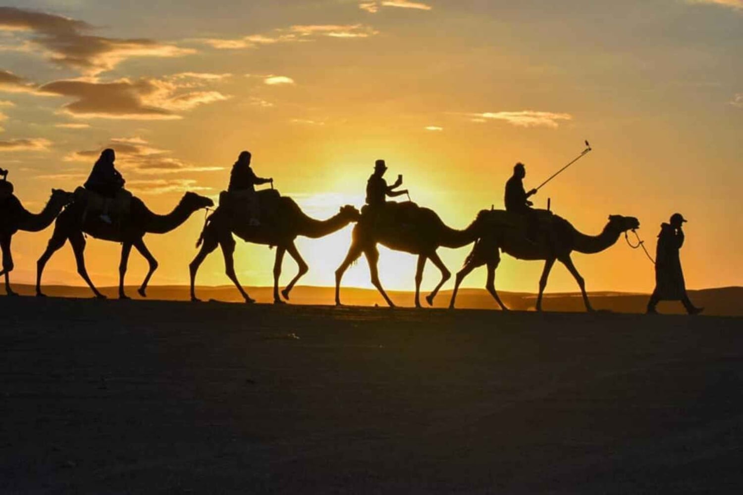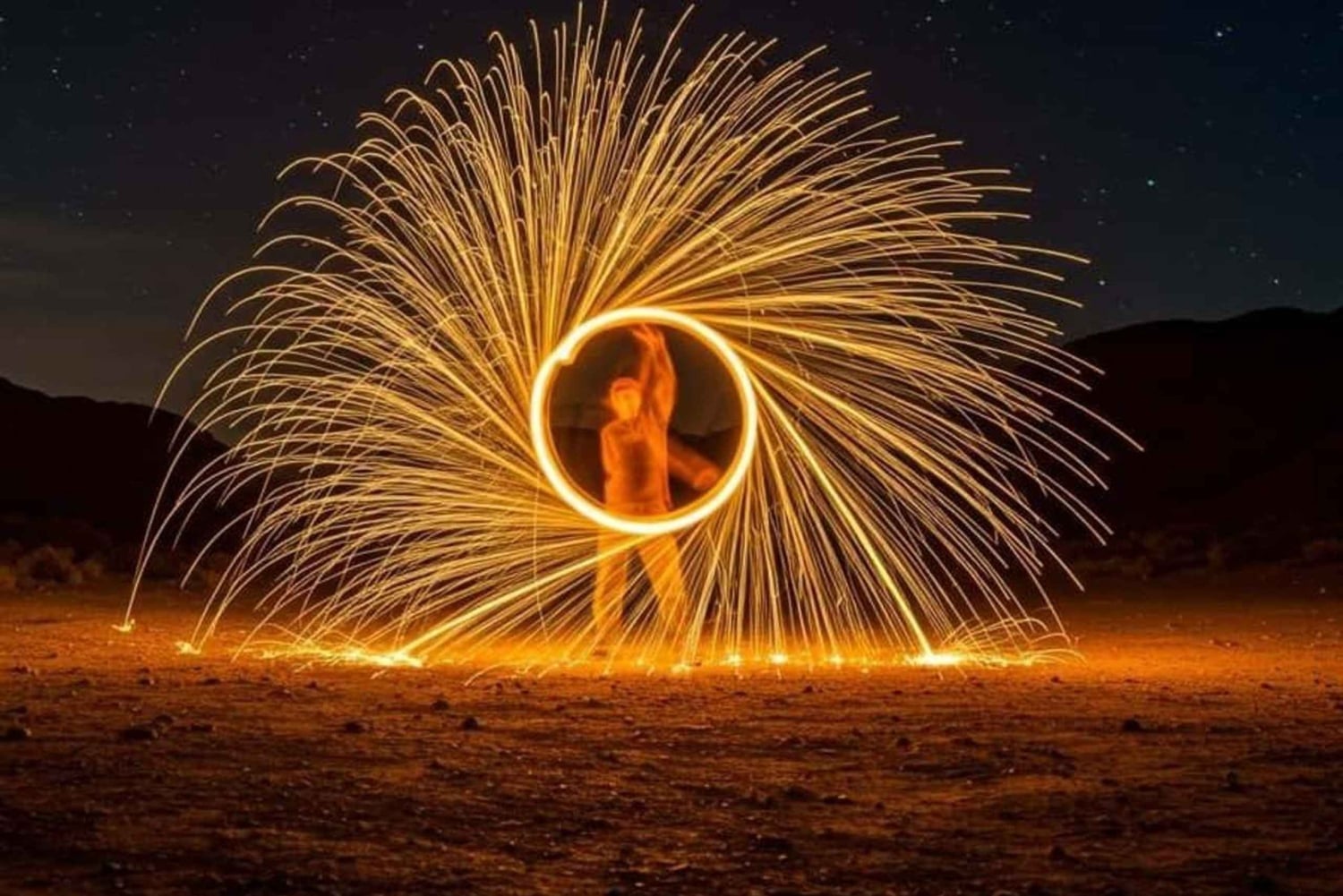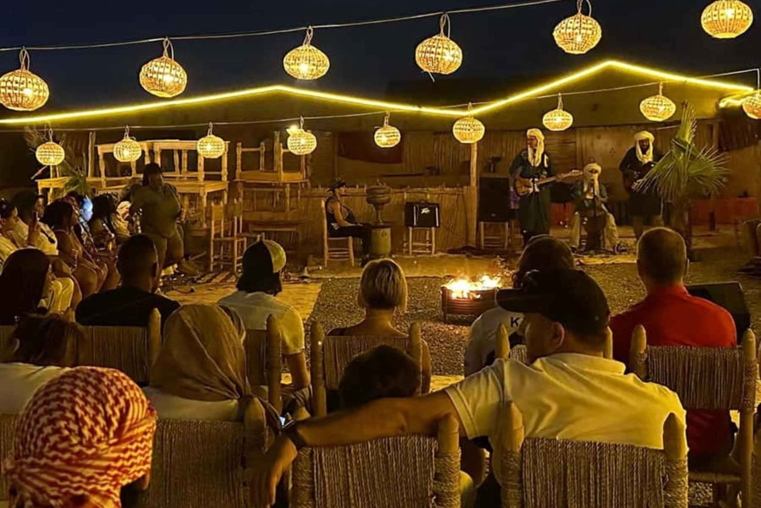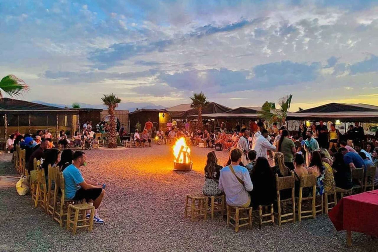 Cambia el bullicio urbano por la tranquilidad del reino dorado del desierto de Agafay, un lugar tranquilo a las afueras de Marrakech, donde el tiempo se detiene. El sol comienza a ponerse en el horizonte, tiñendo el cielo de suaves colores. El silencio pacífico, solo interrumpido por los suaves pasos de los camellos, te permitirá vivir una experiencia que recordarás siempre. Las linternas cobran vida a tu alrededor y una suave luz comienza a bailar sobre la arena. Con el día dando paso a la noche, el desierto se convierte en un mundo mágico. La música en directo impregna el aire cuando los músicos locales comienzan a tocar instrumentos históricos. El ritmo de los tambores y las melodías de las cuerdas se funden en un ritmo que te hace sentir como si formaras parte de algo histórico y sagrado. Podrás relajarte, sentarte o incluso levantarte y participar en el ritmo. La cena se sirve bajo las estrellas. No se trata de una simple comida, sino de un auténtico festín marroquí. Disfrutarás de carnes tiernas, tajines cocinados a fuego lento, ensaladas frescas y verduras ricamente especiadas, todo ello preparado con esmero y según la tradición. Los sabores son auténticos y memorables, de esos que perduran en la memoria mucho después de que la velada haya terminado. Y justo cuando pensabas que no podía mejorar, llega el espectáculo de fuego. Excelentes artistas iluminan la noche con movimientos impresionantes, giros, bailes y juegos con fuego con una gracia increíble. Las chispas vuelan por los aires como pequeñas estrellas y el ambiente es electrizante. Esto es más que una excursión, es una oportunidad de sumergirse en el espíritu de Marruecos de una forma que pocos visitantes consiguen. Sea cual sea la composición de tu grupo, ya sea en pareja, con un grupo de amigos o con tu familia, esta noche en el desierto promete recuerdos para toda la vida, una estrecha conexión con el estilo de vida local y muchas oportunidades para hacer fotos. ¿Buscas una noche mágica? Únete a nosotros en esta exclusiva aventura en el desierto. Las plazas son limitadas, reserva ahora y forma parte de una noche mágica que permanecerá en tu corazón para siempre.Includes