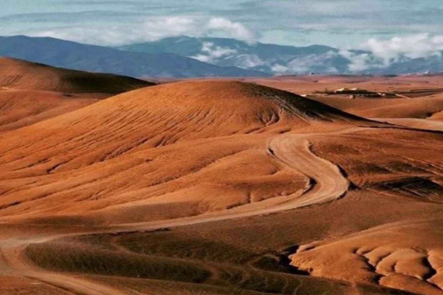 Escápate de Marrakech y visita una cooperativa de aceite de argán. Aprende cómo se muelen las nueces a mano para producir el aceite y luego continúa hacia el desierto de Agafay para tomar una refrescante taza de té a la menta. Disfruta de tiempo libre para admirar la colorida puesta de sol mientras el cielo se tiñe de naranja, rosa y morado. Saborea una cena tradicional marroquí con platos bereberes y árabes bajo las estrellas. Durante la velada, sumérgete en la música bereber y tuareg en directo, que mezcla ritmos del desierto con melodías nómadas conmovedoras, acompañadas de un atractivo espectáculo de danza y fuego. Esta auténtica actuación ofrece una visión de las ricas tradiciones culturales de las tribus del desierto. Al final de esta velada inolvidable, relájate en tu traslado de regreso a Marrakech.Includes