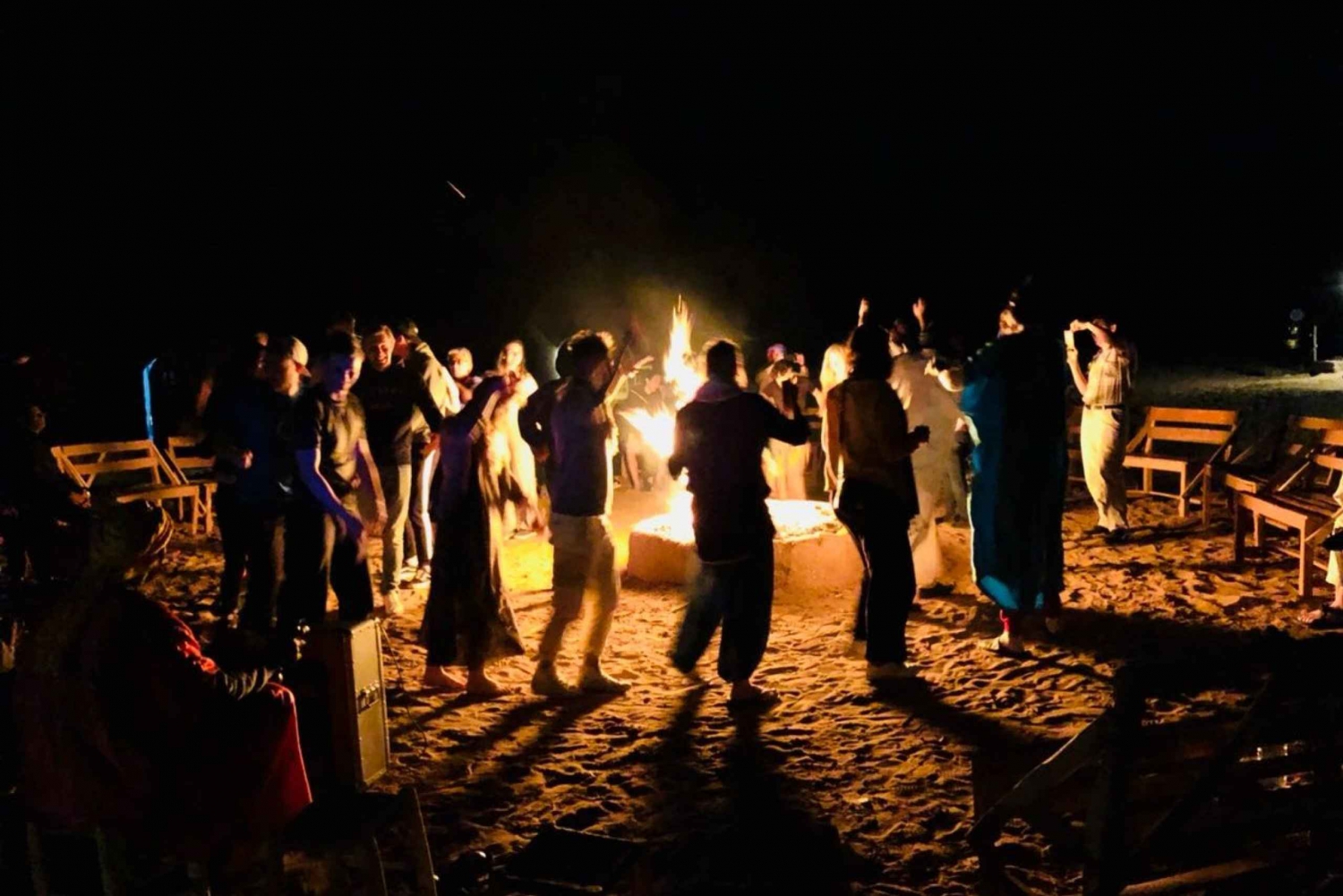 Pickup and drop-off at hotels/riads in Marrakech Round-trip transportation in an air-conditioned minibus or van Bilingual driver Camel ride in the dunes of Zagora at sunset and sunrise Entertainment around a campfire Standard accommodation in a Berber camp in the desert Access to shower and toilet Dinner Breakfast