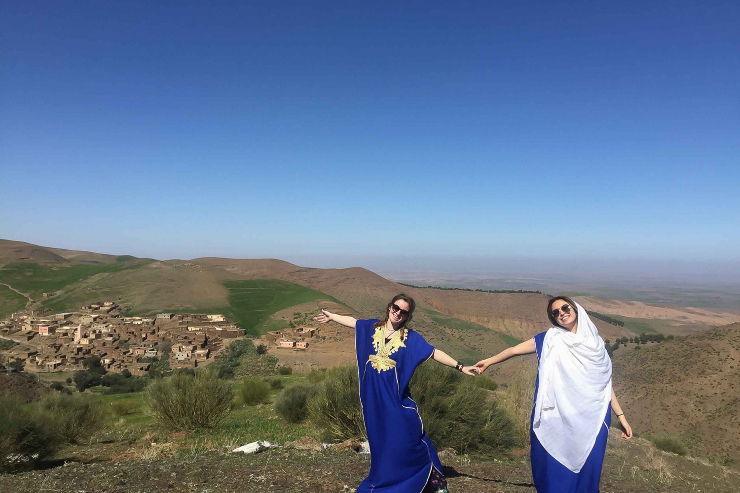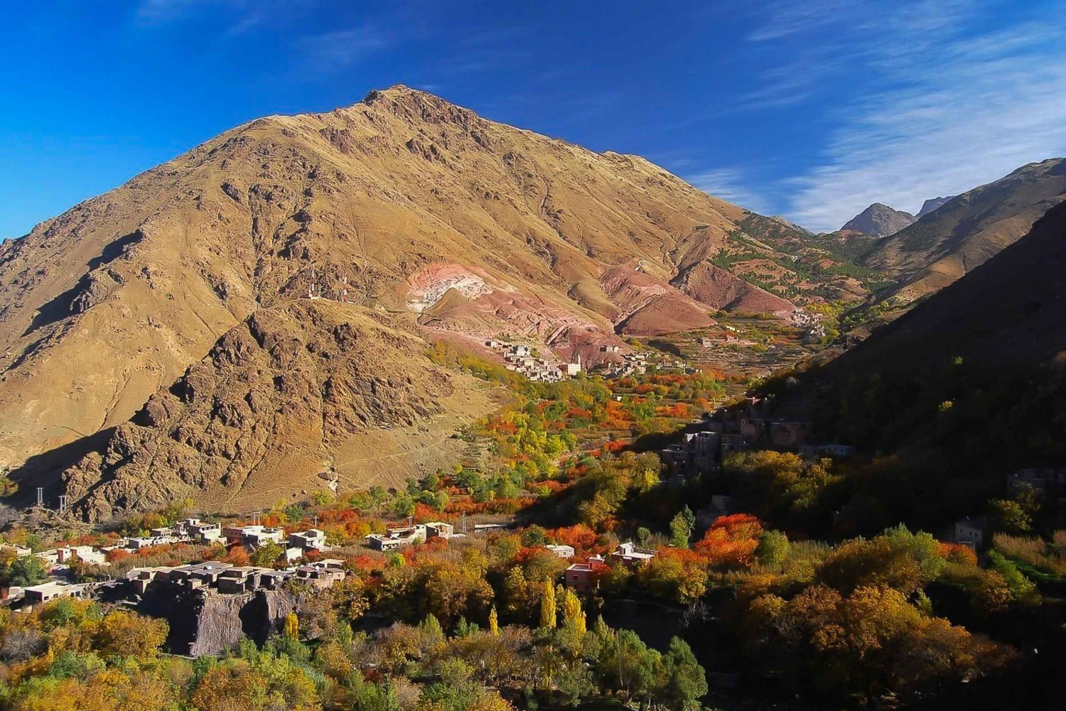 Depart from Marrakech and enjoy a guided day trip through the High Atlas Mountains to learn more about Berber culture and traditions. Admire scenic landscapes, learn about local traditions and industry, and enjoy some local food and drinks. Meet your guide at your accommodation and start the transfer to Imlil. On your way, pass through the town of Tahnaout. Stop at an Argan Oil Cooperative to learn how women of the cooperative turn the Argan nut into many different Argan oil-based products which Morocco is famous for.  Continue on through Asni where, on Saturdays, a traditional Berber Souk and market can be visited. Once you arrive in Imlil, enjoy a welcome glass of mint tea and meet your guide before commencing your tour of the local area. Make your way to the largest and highest village in Imlil Valley. Your journey will take you past waterfalls and the hamlets of Ait Mizan, Targa, and Imoula. Stop off in Tamatert and have the opportunity to take in the views of ancient irrigated terraced fields of barley, corn, and vegetables, surrounded by cherry and walnut trees.  Your guide will point out things of interest and talk to you about the Berber culture and heritage along the way.  Travel down through the village of Ait Souka and afterwards enjoy a traditional Moroccan lunch in a Berber family guest house. Once you are rested, begin your return trip down the other side of the valley to Taourirt to board your vehicle. Go through the Moulay Brahim Gorges, before arriving at the main trailhead with streams and paths branching out in all directions. Here, enjoy a camel ride through picturesque landscapes. Finally, make your journey back to Marrakech, with drop-off in the early evening.