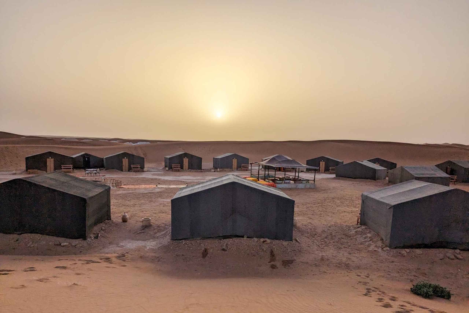 For Private Bookings: Day 1: Pickup in Marrakech. Drive through the Atlas Mountains: (Tizi n’Tichka Pass, the highest in North Africa). Guided Tour of Ait Ben Haddou (UNESCO World Heritage site) w/ licensed local guide. Lunch in Ait Ben Haddou/along route (not included). Drive to Ouarzazate: known for the Moroccan film industry. Options: Atlas Movie Studios (additional cost), Kasbah Taourirt (additional cost). Drive to Agdz: Draa Valley, picturesque palm groves & traditional Berber villages. Dinner & Overnight Stay in Agdz. Appr. Time Driving: 5 hrs Day 2: Breakfast at Your Accommodations in Agdz. Travel through Zagora: iconic sign 'Timbuktu 52 days.' Visit Tamegroute: famous for its green pottery & historic Quranic library. Travel to Mhamid & Lunch (not included). Off-Road Adventure to Erg Chegaga. Camel Ride at Sunset. Arrive at Berber-Style Camp in Erg Chegaga: Dinner, Berber Drum Experience & overnight. Appr. Time Driving: 5 hrs 30 mins Day3: Breakfast at Your Desert Camp. Choice of Desert Activities: Relax in the Dunes, Sandboarding, Camel Trek into dunes for Picnic Lunch, Quad Biking in the Dunes: (additional cost). Dinner, Music & Overnight at Camp. Appr. Time Driving: 0 hrs Day 4: Early Breakfast at Your Camp. Drive Through Lake Iriki: once a large lake, now a dramatic landscape. Short break in Foum Zguid. Drive to Tazenakht with scenic views of the changing landscapes; Visit a Cooperative for Berber Rugs in Tazenakht: observe the intricate craftsmanship & learn about the traditional techniques. Lunch along route (not included). Drive Through Atlas Mountains to Marrakech. Appr. Time Driving: 8 hrs 30 mins *Routes are estimated & may change based on your preferences for activities. For Shared Bookings: Day 1: Pickup in Marrakech. Drive through Atlas Mountains: (Tizi n’Tichka Pass, the highest in North Africa). Optional Guided Tour of Ait Ben Haddou (not included). Lunch in Ait Ben Haddou/along route (not included). Drive through Ouarzazate: known for the Moroccan film industry & Draa Valley, picturesque palm groves & traditional Berber villages. Camel ride to Berber-style camp in Zagora, dinner & overnight stay. Appr. Time Driving: 6-7 hrs Day 2: Breakfast at Your camp. Travel through Zagora: iconic 'Timbuktu 52 days' sign; visit Tamegroute: famous for its green pottery. Travel to Mhamid and Lunch (not included). Off-Road Adventure to Erg Chegaga. Camel Ride at Sunset. Arrive at Berber-Style Camp in Erg Chegaga: Dinner, Berber Drum Experience & overnight. Appr. Time Driving: 4 hrs 30 mins Day3: Breakfast at Your Desert Camp. Depart and follow sam route back to Zagora. Dinner, Music and Overnight at Camp (Option for a local hotel or Riad in Zagora). Appr. Time Driving: 4 hrs 30 mins Day 4: Early Breakfast at Your Camp. Return to Marrakech along same route. Lunch along route (not included). Drive Through the Atlas Mountains to Marrakech Appr. Time Driving: 6-7 hrs *Routes are estimated and may change.Includes