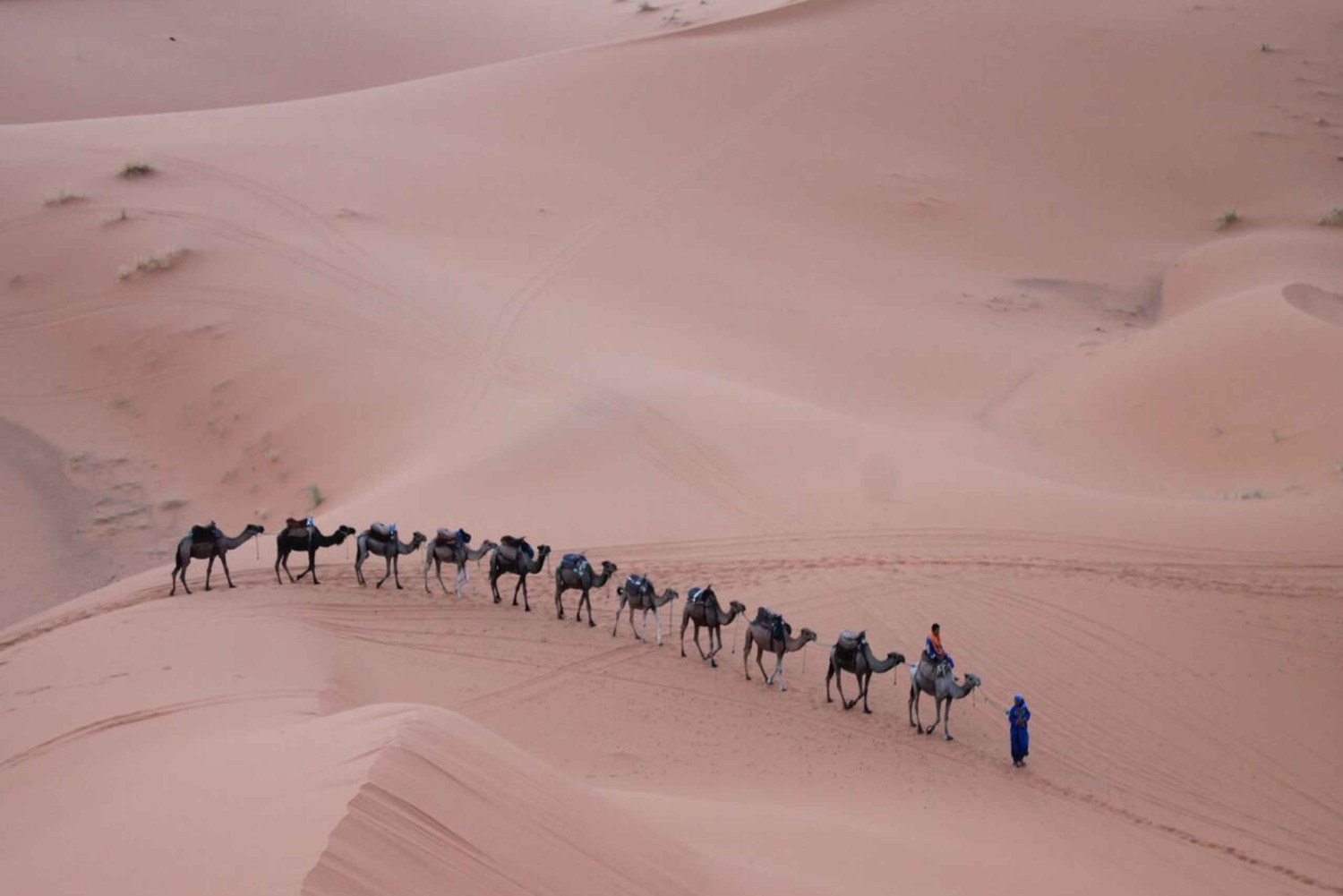 Marrakech Hotel pickup and drop-off. Transport. English speaking guide, and cook (Mountain trek). Muleteers and mules for assistance (Mountain trek). Full board on trek + mineral water, coffee and tea (Mountain trek). 4x4 or Mini-bus during Desert tour. 2 overnight in hôtels at Dades & Ait Benhaddou ( dinner & breakfast ). 1overnight camping on Dunes of Erg chebbi (Dinner & breakfast). Camel Ride on Dunes.Easy cancellation