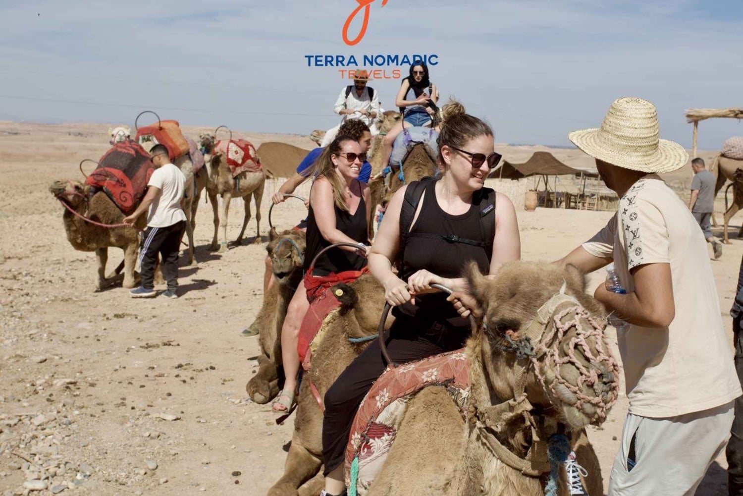 Discover the magic of the Agafay Desert with a full evening of adventure, culture, and dining under the stars. Begin with pickup from Marrakech and journey across vast desert landscapes to a charming camp, where you’ll be welcomed with Moroccan tea and local pastries. Cool off in a serene desert pool before sunset, then choose one of two unforgettable adventures: • Camel Ride – A peaceful journey through the desert trails at golden hour. • Quad Bike Ride – A 40-minute adrenaline-filled adventure across rugged terrain on a shared double quad (2 riders per vehicle). As the sun sets, admire the breathtaking glow of the Agafay Desert. Your evening continues with a traditional Moroccan buffet dinner under the stars—fresh salads, a flavorful tagines. Enjoy a magical evening dining outdoors beneath the Moroccan sky. Around the campfire, enjoy live traditional music and an exhilarating fire show. End your magical evening with a relaxing drive back to Marrakech, carrying memories of desert adventures, Moroccan flavors, and cultural performances.Includes