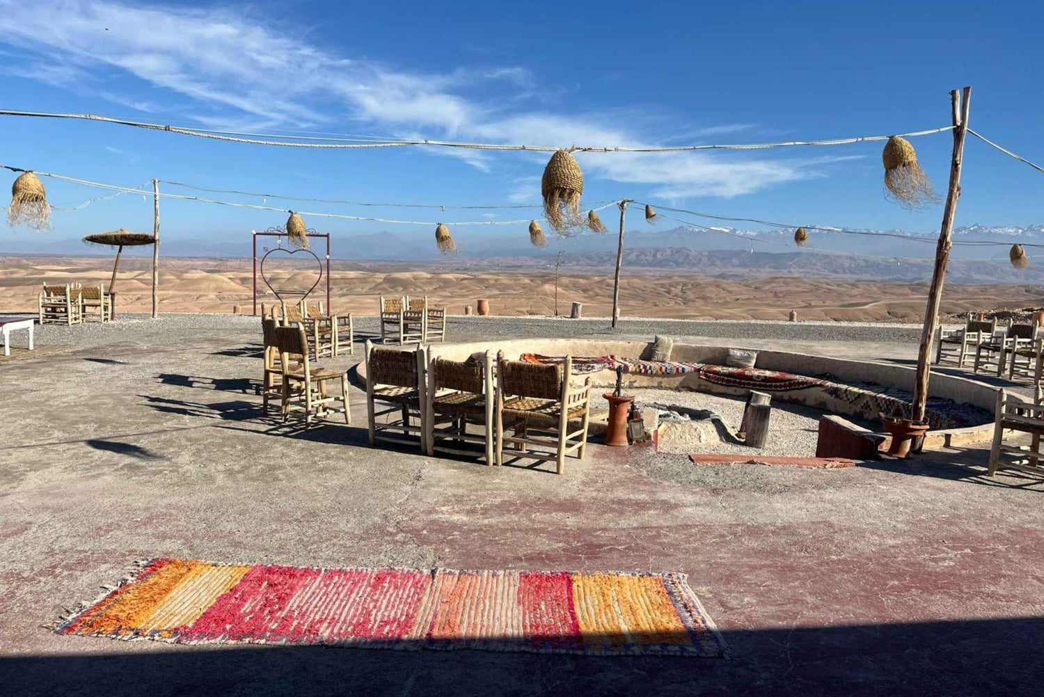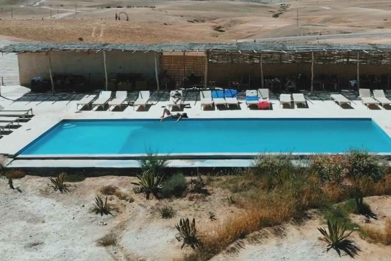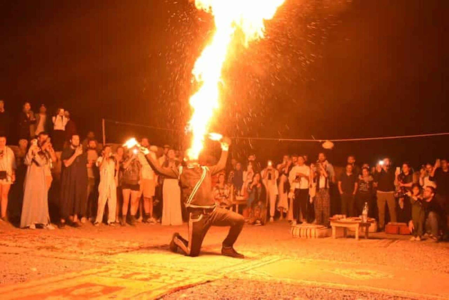 Pickup and drop-off from Marrakech. Welcome tea and traditional Moroccan pastries at the desert camp. Traditional Moroccan dinner under the stars (salads, chicken or vegetable tagine, dessert). Live traditional music and fire show performance. Access to the tranquil desert pool at the camp. Choose one: Camel ride at golden hour or 40-min double quad biking adventure. Professional local guide and staff.Important Information