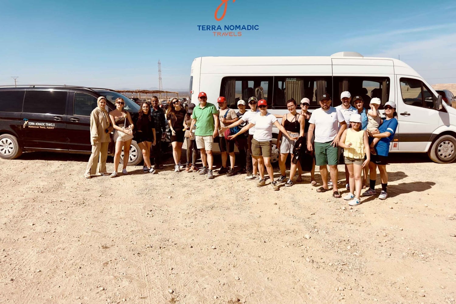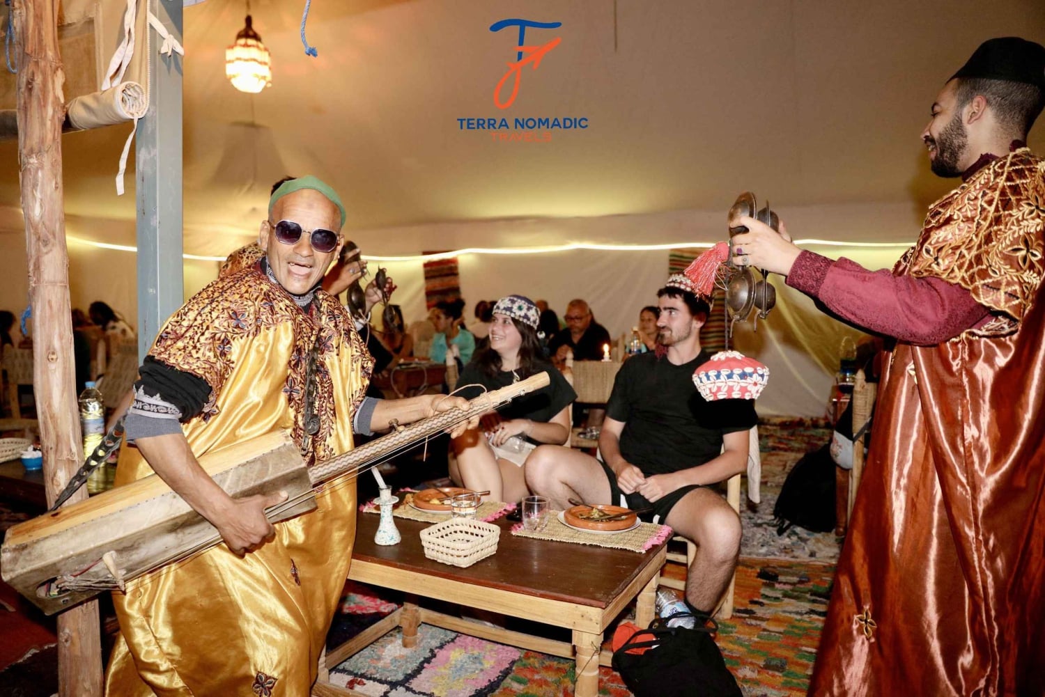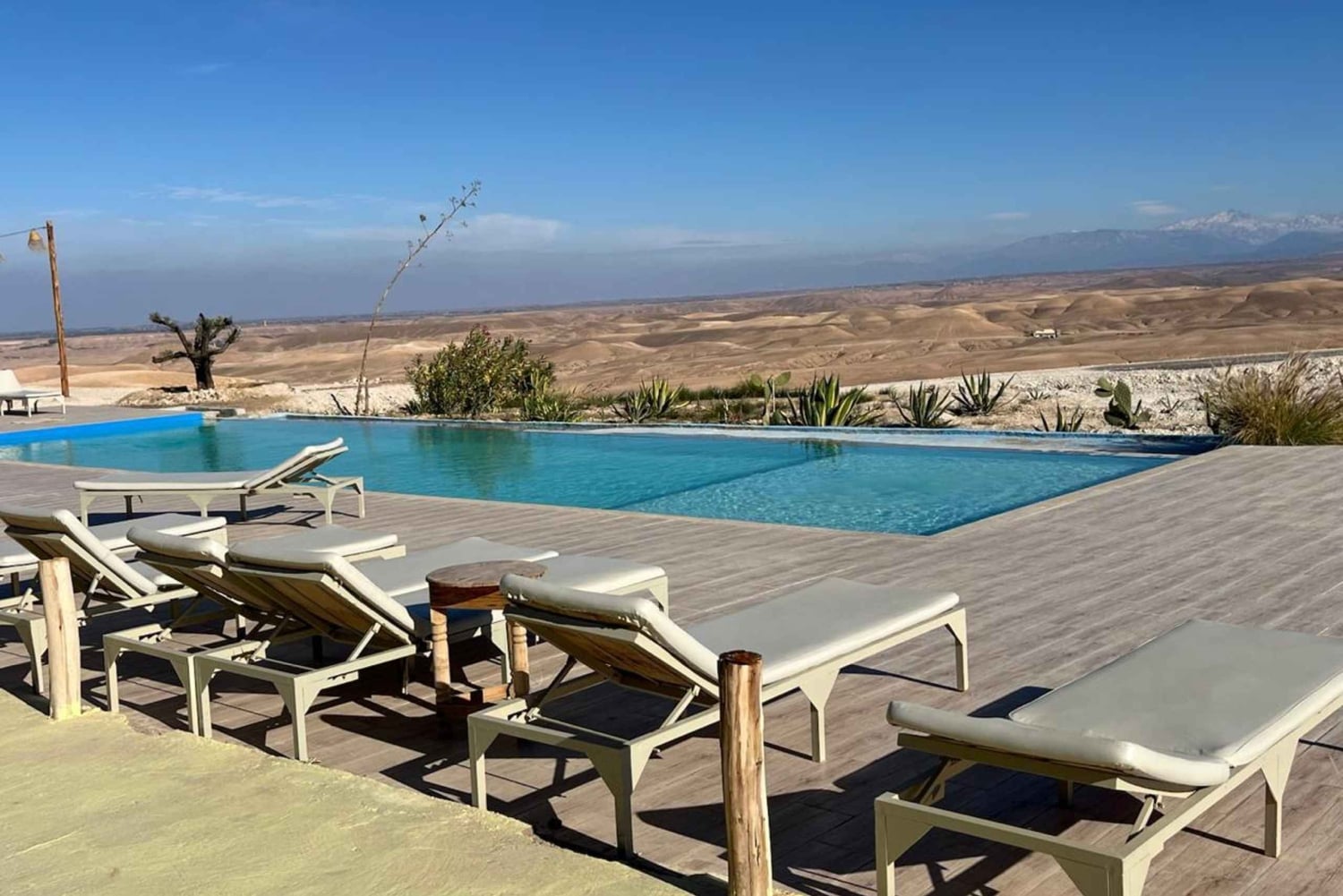 Pickup and drop-off from Marrakech. Welcome tea and traditional Moroccan pastries at the desert camp. Traditional Moroccan dinner under the stars (salads, chicken or vegetable tagine, dessert). Live traditional music and fire show performance. Access to the tranquil desert pool at the camp. Choose one: Camel ride at golden hour or 40-min double quad biking adventure. Professional local guide and staff.Important Information