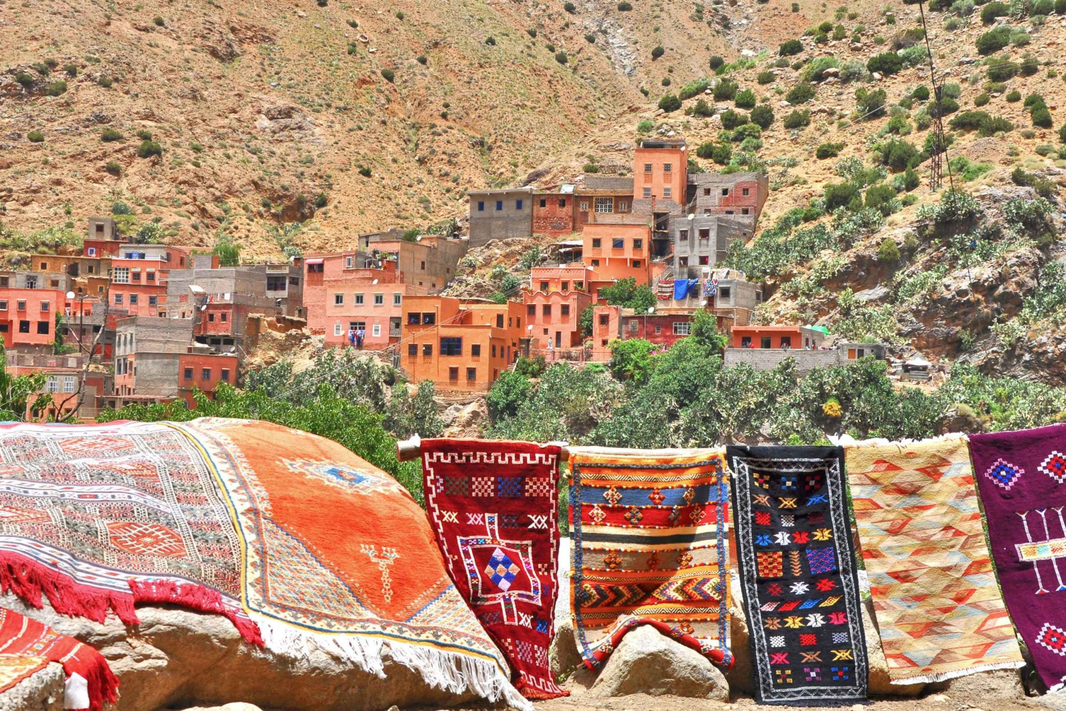 Gain a deeper understanding of Berber culture as you embark on an unforgettable guided scenic day trip to the Atlas Mountains. Encounter enchanting countryside, get the chance to take a ride on a camel or horse, and meet locals in the villages of the Imlil Valley. Start your day with pickup and meet your friendly local guide, who lives in one of the surrounding Berber villages. During your journey to the Atlas Mountains region, your guide will tell you about the rich culture and heritage of the Berber people as you hike between villages. Arrive in Tahnaout and visit a women-managed argan oil co-operative. Discover how the argan nut is pressed to make the famed argan oil products of Morocco. Receive a warm welcome in Imlil with a glass of mint tea before traveling past stunning waterfalls and small Berber settlements. Pause in Tamatert to take in the views of ancient irrigated terraced fields, surrounded by cherry and walnut trees. Feast on a traditional Moroccan meal in Ait Souka at the home of a Berber family. Relax with scenic valley views from a sun-bathed rooftop terrace. After some rest, board your vehicle and travel through the scenic Kik Plateau, with spectacular 360-degree views. Gaze in awe at the magnificent High Atlas Mountains as you pass through stone desert, barren light brown plateaus, oases, and rolling hills. Enjoy the serene surroundings of the Agafay Desert where you can take an optional camel or horse ride. Or, simply relax with some Moroccan mint tea for the perfect end to your day, before heading back to Marrakech.Includes