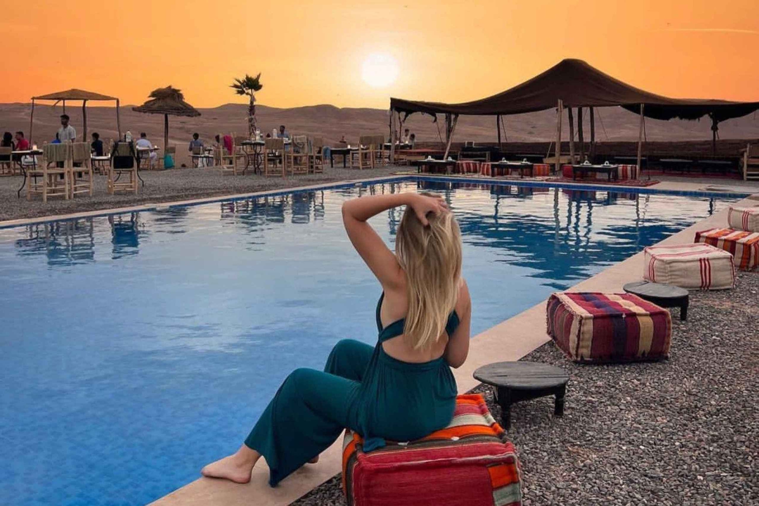 Drive from your hotel in Marrakech to the Agafay Desert. Take in the view of the Atlas Mountains and then sit down inside a tent. Enjoy a traditional Moroccan dinner. Then, gaze at the stars in the night sky and soak up the tranquil atmosphere. Return to your hotel at the end. Embark on an enchanting journey that will sweep you away to a realm of natural wonders and celestial splendor. Brace yourself for an unforgettable evening as you're whisked away from the bustling city of Marrakech to the mystical Agafay Desert, a hidden gem just a short 30-minute drive away. Once you arrive at this spellbinding location, immerse yourself in the breathtaking scenery of the Atlas Mountains, which paint a majestic backdrop to the golden desert. Here, in the midst of this picturesque haven, awaits a cozy and inviting tent, where you'll be seated for a truly magical dinner. Prepare your taste buds for an explosion of flavors as you savor a delectable traditional Moroccan feast. Savor the rich aroma of exotic spices and experience authentic local food in the calm environment of the dessert. Enjoy eating underneath the dazzling stars and moonlight. Witness the fiery hues of the setting sun as it paints the sky in a palette of orange, pink, and gold, bidding farewell to the day in a blaze of glory. But the spectacle doesn't end there. As darkness descends upon the desert, the night sky becomes a dance floor, with countless twinkling stars. Lose yourself in the vastness of the universe above as you lay back and gaze up at the bewitching canopy of stars. Far from the city lights, the brilliance of the constellations shines with unparalleled clarity, inviting you to ponder the mysteries of the cosmos and your place within it. Under the velvet embrace of the night, let the desert's ancient wisdom seep into your soul, leaving you with a profound sense of connection to the earth and the universe. It's a moment of tranquility and awe, a reminder of the immense beauty that exists beyond the boundaries of your everyday lives. So, come and join us for a truly extraordinary experience, a dinner that unites the splendor of a desert sunset with the celestial wonders of the night sky. Allow yourself to be captivated, to be transported, and to be forever enchanted by the Agafay Desert's timeless allure.Includes