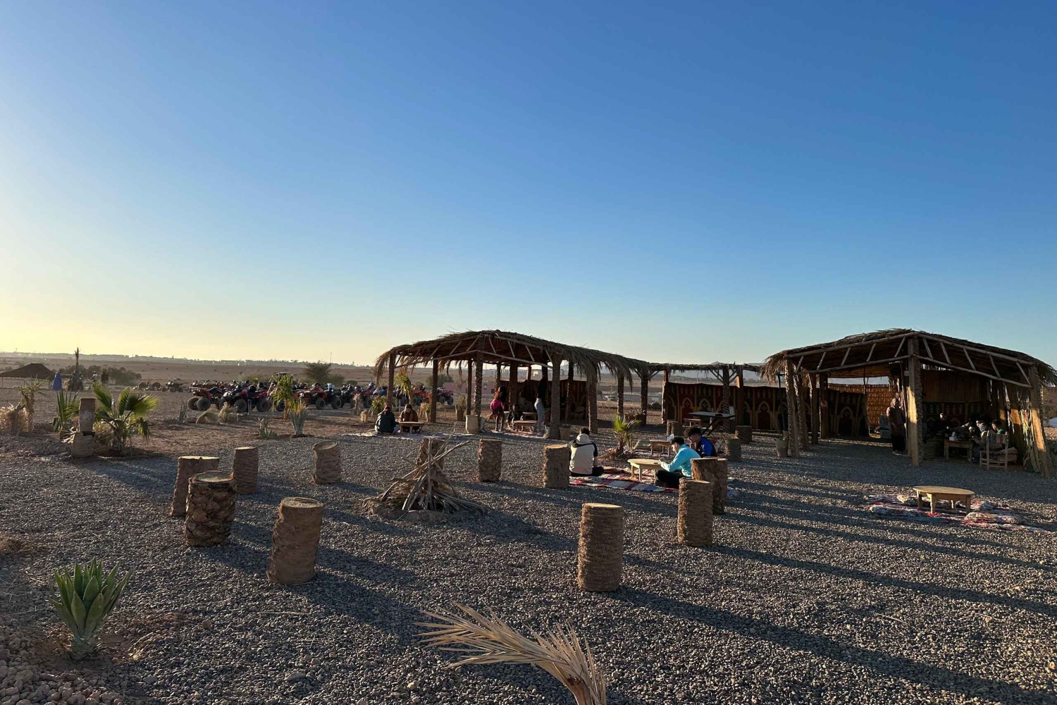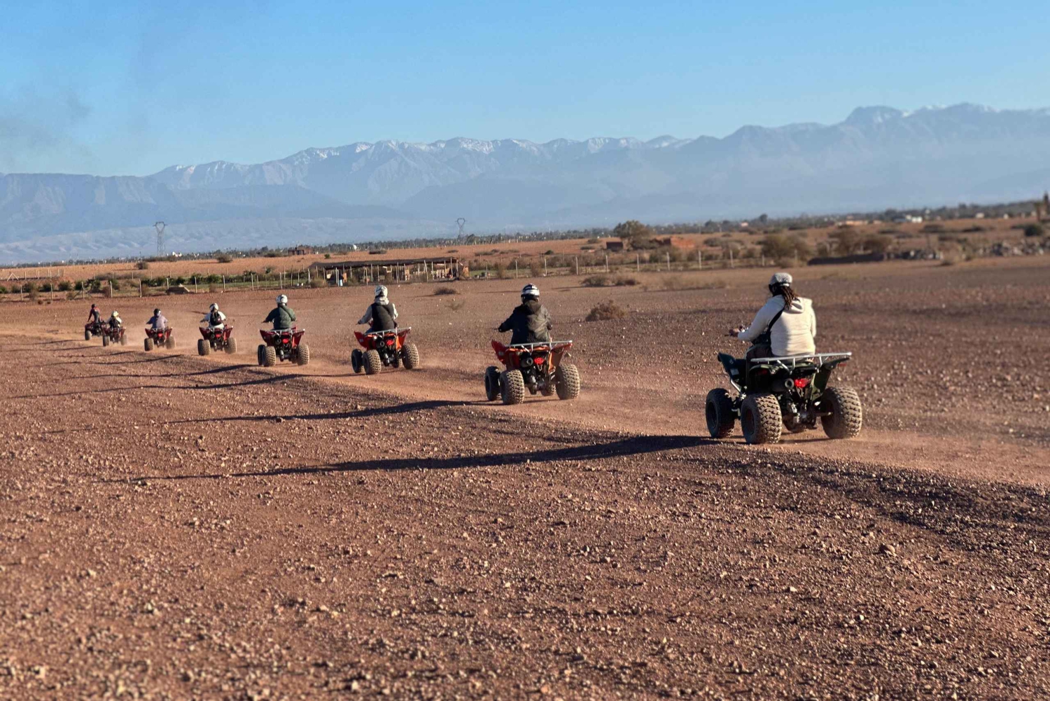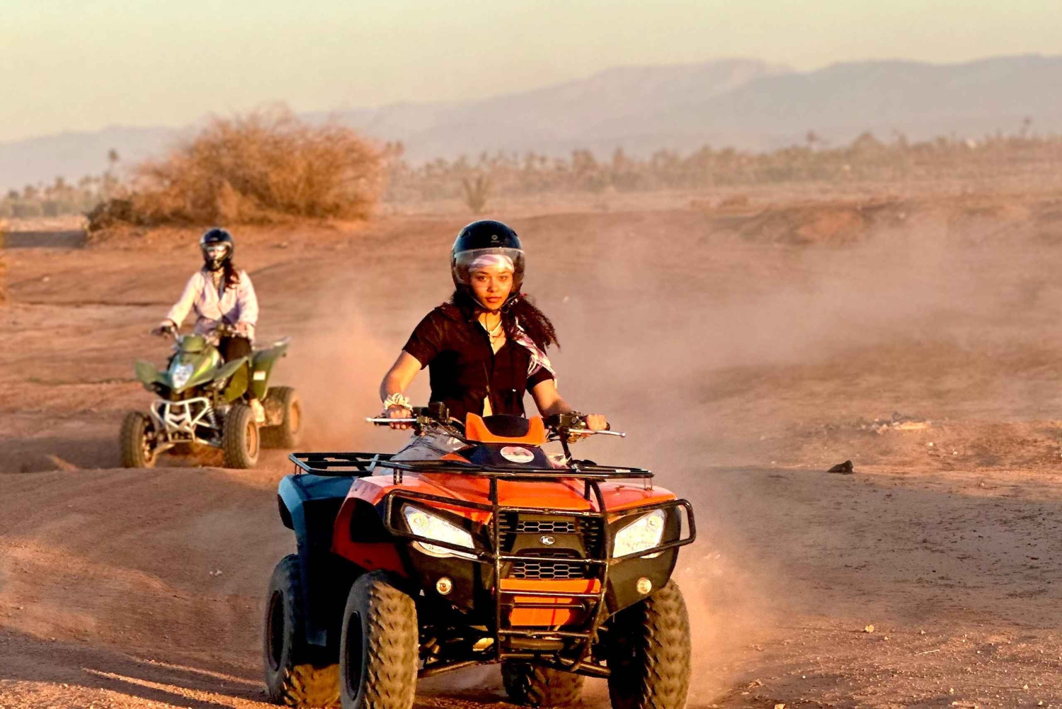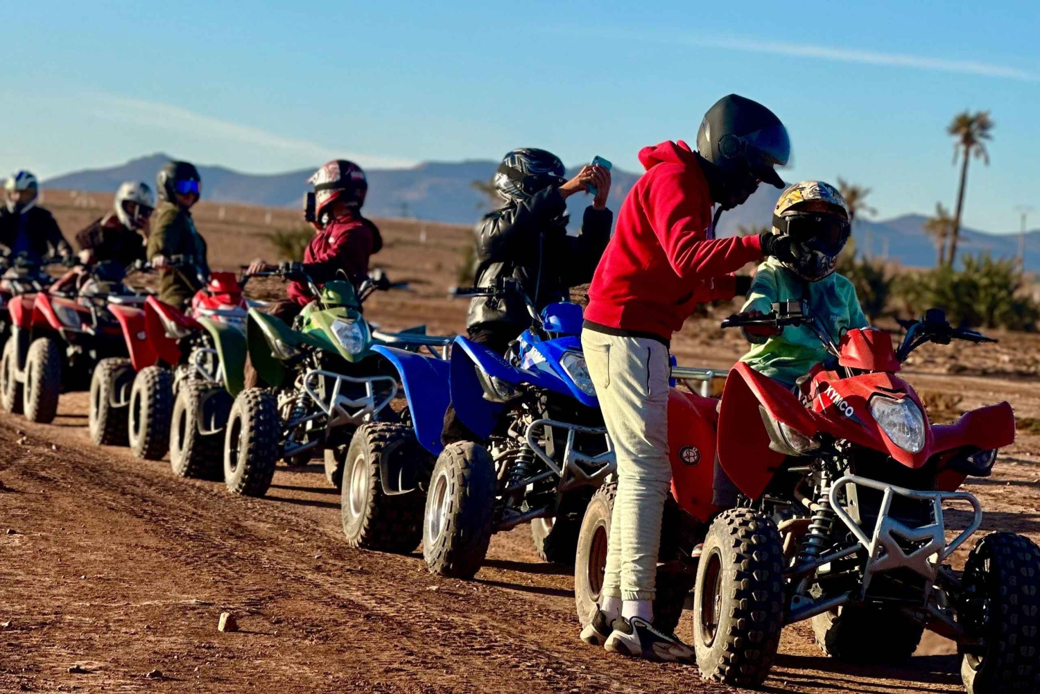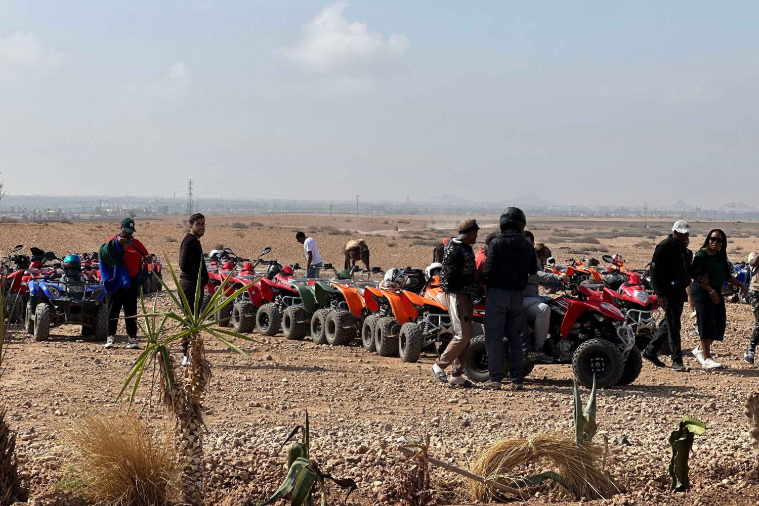 Immerse yourself in a sensational getaway in the heart of the dunes of the Palmeraie of Marrakech with our exclusive quad tour. From the start, our transfer service picks you up from the hotel, ensuring complete comfort. On arrival, you will be equipped with a sturdy quad bike for an adrenaline-filled adventure. Cross breathtaking landscapes, from rolling dunes to verdant palm groves. Our experienced guides will lead you through exciting trails, providing a safe and unforgettable experience. In the middle of the excursion, a well-deserved break awaits you, with a tasting of authentic Moroccan tea. Soak up the local culture in this desert setting and relax while enjoying Moroccan hospitality. After this thrilling adventure, our transfer service will take you back to your hotel in comfort. Enjoy every moment of this complete experience, combining the power of quads, the natural beauty of the dunes and the warmth of the Moroccan welcome. A tour that will remain engraved in your memories.Includes