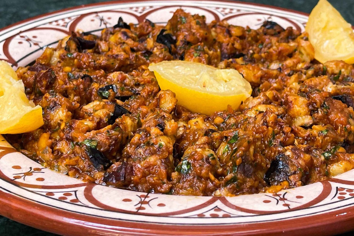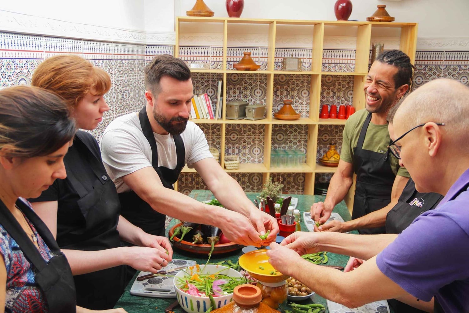 After meeting at our meeting point, we will have a short tour of a local market near our house to buy vegetables and all the other ingredients we will need to cook. Afterwards, we go home, and start with a tea ceremony where you learn the traditional way of making Moroccan mint tea. And of course, we drink tea while we get to know each other. The next step is to start the cooking process, where participants learn new techniques for peeling, chopping, and seasoning the Tagines with the right spices, as our grandmothers and mothers do at home. And we usually make 6 dishes in one session depends on how big is the group so that you learn more things in one single class. While we are cooking, we will talk in depth about Moroccan cultures, traditions, and history. A list of dishes we usually make: . Beef with prunes tagine . Chicken with preserved lemon tagine . Vegetables tagine . Meatballs with tomato sauce and eggs (Kefta) . Shakshouka (sweet peppers) . Fried or grilled aubergine salad (Zaalouk) Sometimes we can add 1 or 2 more side dishes depends on participants dietary restirctions and group size. The food is served as a buffet at the end of the class so that you can taste from each dish. The list of dishes we make can be less than 6 sometimes if the number of participants is less that 8 participants but don't worry about this because we always have enough people for making all these dishes. Participants will work together as one team to make different dishes, and this helps them learn more dishes than just one specific dish by using different spices and we also cook vegan, vegetarian, and glutin-free food. The cooking class lasts 4 hours from the time we meet to the time you eat, and of course, as you are on holiday, we are not stressed with the time; you feel like you are home. At the end of the class, it is time to taste and eat what you have cooked, and usually in the evening we share a link to our website where you can find recipes for the dishes we make and many other dishes. Please note: The class is bilingual (English & French) when guests speak different languages. Otherwise, it’s held in one language when everybody speak same language.Includes