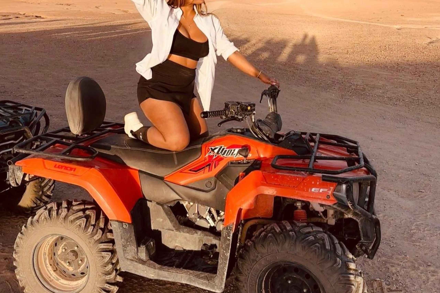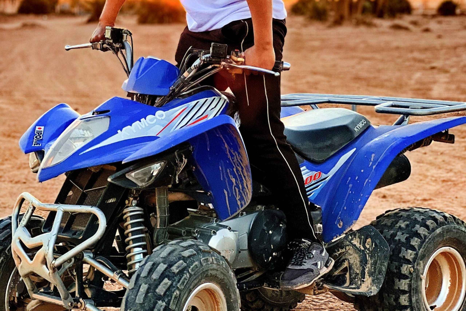 Begin your adventure with a convenient pickup from the meeting point, where you'll be warmly welcomed by your tour guide. Board a comfortable, air-conditioned minibus and embark on a scenic drive towards the Agafay Desert. Along the way, marvel at the breathtaking views of the Atlas Mountains, a landscape of stunning beauty with its rugged peaks and picturesque valleys. Your first stop will be at a cooperative store specializing in argan oil, where you'll enjoy a refreshing tea break and have access to restroom facilities. This stop not only provides a chance to stretch your legs but also to learn about the production of argan oil, a local specialty. After this visit, continue your journey to the Agafay Desert, where a magical afternoon awaits. Upon arrival, you'll be prepared for an exhilarating quad biking activity. Equipped with helmets and glasses, and guided by a professional, you'll set off on a one-hour adventure, exploring the unique terrain of the Agafay Desert. As you navigate the desert, your guide will capture videos and photos, ensuring you have lasting memories of this exciting experience. The vast, open landscapes of the desert, combined with the thrill of quad biking, make for an unforgettable adventure. After the ride, relax and soak in the tranquility of the desert before returning to your starting point. After that you enjoy a delicious lunch with swimming pool and music to make you relax and feel every moment in your tour. Then wee come back to marrakech at the meeting point.Includes