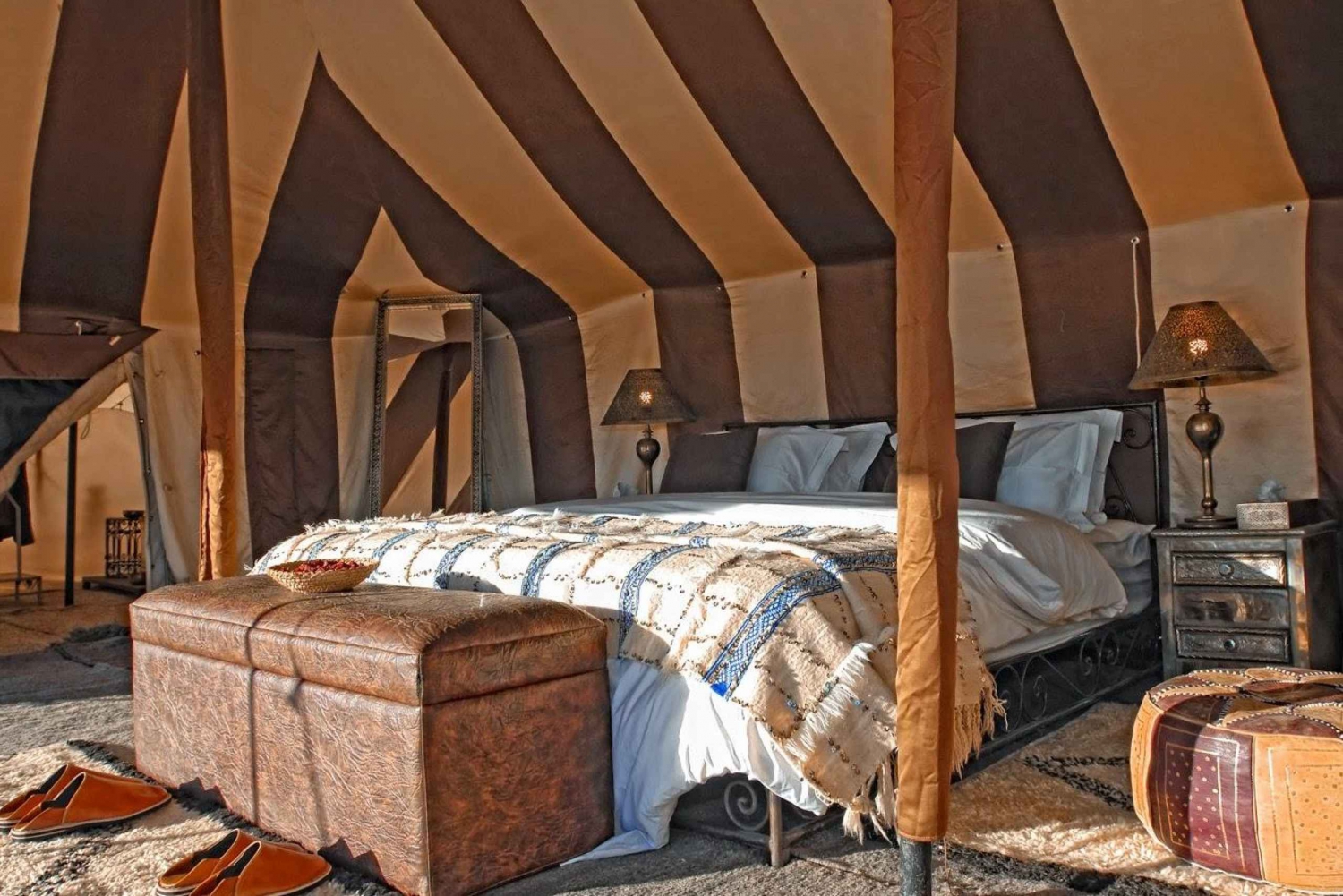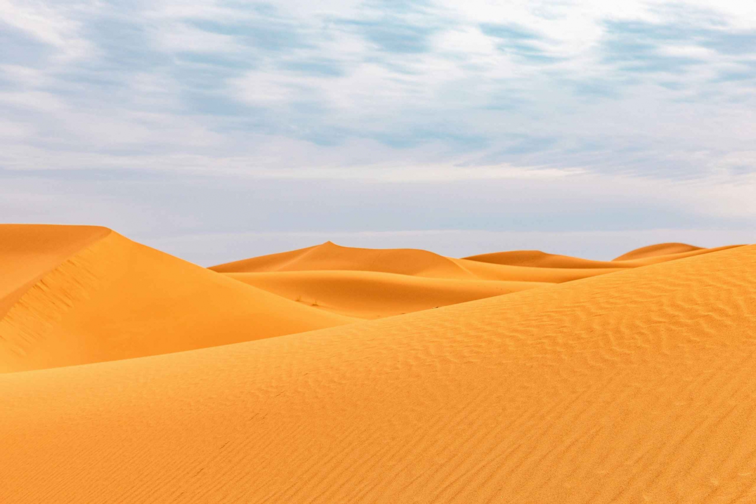 Lähde jännittävälle 4 päivän aavikkoretkelle Marokkoon: Marokko: Matka ajan ja dyynien halki Päivä 1: 7-8 AM: Nouto Marrakechista 8-12 PM: Ajo Atlasvuorten läpi: - Tizi n'Tichkan sola, Pohjois-Afrikan korkein. 12-13 PM: Ait Ben Haddoun opastettu kierros: - Unescon maailmanperintökohde Ait Ben Haddou. - Lisensoitu paikallinen opas 1-2 PM: Lounas Ait Ben Haddoussa - lounas sisältyy hintaan 2-3 PM: Ajo Ouarzazateen: tunnettu marokkolaisesta elokuvateollisuudesta. 3-4:30 PM: Tutustuminen Ouarzazateen Vaihtoehtoja: - Atlas Movie Studios (lisämaksu) - Kasbah Taourirt (lisämaksu) 16:30-18 PM: Agdziin: - Draan laakso, viehättävät palmuviljelmät ja perinteiset berberikylät. 18.00: Saapuminen Agdziin ja sisäänkirjautuminen - Illallinen ja yöpyminen Agdzissa sisältyvät hintaan. Päivä 1 Arvioitu ajoaika: 5 tuntia Päivä 2: 8 AM: Agdz: Aamiainen majoituspaikassasi Agdzissa - Aamiainen sisältyy 9-11 AM: Matka Zagoraan - pysähdyksiä maisemien katseluun 11-12 PM: Tutustu Zagoraan - ikoninen kyltti 'Timbuktu 52 päivää'. 12-1 PM: Tamegrouten vierailu - joka on kuuluisa vihreästä keramiikastaan ja historiallisesta Koraanikirjastostaan. 1-2 PM: Matka Mhamidiin ja lounas (sisältyy hintaan). 14-55 PM: Maastoseikkailu Erg Chegagassa 5-6 PM: Kameliratsastus auringonlaskun aikaan (sisältyy hintaan). 19.00: Saapuminen ylelliseen berberileiriin 19.30: Illallinen ja berberirumpukokemus (sisältyy hintaan). Yöpyminen Erg Chegagan ylellisessä leirissä (sisältyy hintaan). Päivä 2 Arvioitu ajoaika: 5 tuntia 30 minuuttia Päivä 3: PÄIVÄ 3: 8 AM: Aamiainen ylellisessä leirissäsi (sisältyy hintaan). 9 AM - 12 PM: Aavikkoaktiviteettien valinta - Rentoutuminen dyyneillä - Hiekkalautailu - Kameliretki syrjäiseen kohteeseen piknik-lounasta varten (sisältyy hintaan). - Mönkijäpyöräily dyyneillä: (lisämaksusta). 12-13 PM: Piknik-lounas (jos valittu kameliretkeilyvaihtoehto). 13-15 PM: Aavikkoaktiviteettien jatkaminen 5-6 PM: Paluu luksusleiriin - virkistäydy ja rentoudu, nauti kuppi perinteistä marokkolaista minttuteetä. 19.00: Illallinen ja musiikkia tähtien alla (sisältyy hintaan). Yöpyminen Erg Chegagan ylellisessä leirissä (sisältyy hintaan). Päivä 3 Arvioitu ajoaika: 0 tuntia Päivä 4 7 AAMULLA: Aamiainen leirissä (sisältyy hintaan) 8-10 AM: Iriki-järven läpi - Aikoinaan suuri järvi, nyt dramaattinen maisema. 10 AM: Saapuminen Foum Zguidiin - Lyhyt tauko jalkojemme venyttelyyn ja kahvin tai välipalan nauttimiseen paikallisessa kahvilassa. KLO 11-12:30: Ajo Tazenakhtiin - maisemien vaihtelua, kun jätämme aavikon taaksemme ja suuntaamme kohti vuoria. 12:30-1:30 PM: Vierailu Tazenakhtissa sijaitsevassa berberimattojen osuuskunnassa. - tarkkaillaan taidokasta käsityötä ja tutustutaan perinteisiin tekniikoihin. 13:30-2:30 PM: Lounas Tazenakhtissa (sisältyy hintaan). 14:30-18:30 PM: Matka Atlasvuorten läpi Marrakechiin. 18:30-19:00: Saapuminen Marrakechiin 4. päivä Arvioitu ajoaika: 8 tuntia 30 minuuttia *Kaikki ajat ovat arvioituja, ja ne voivat muuttua seikkailun edetessäsi mieltymystesi mukaan.Includes