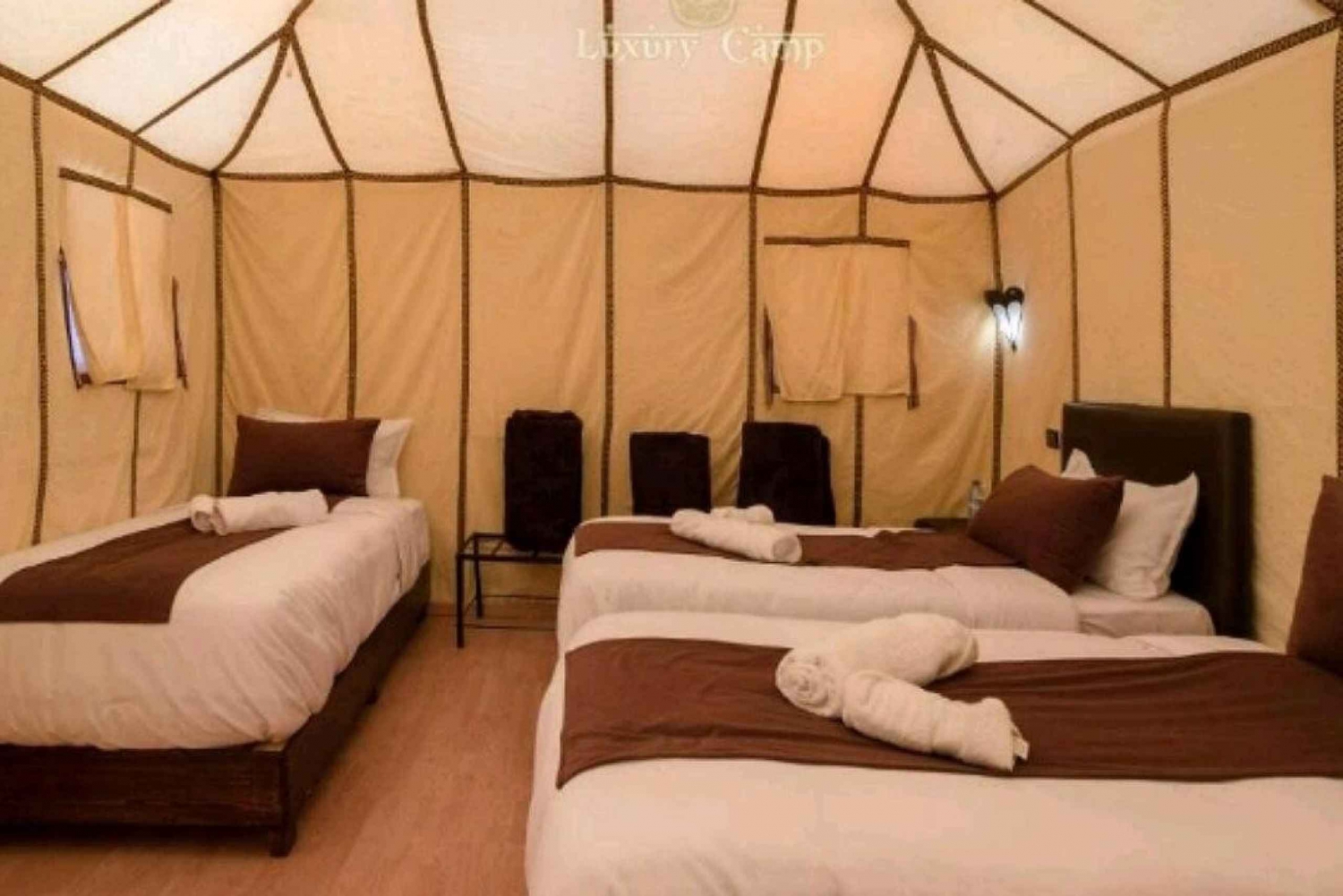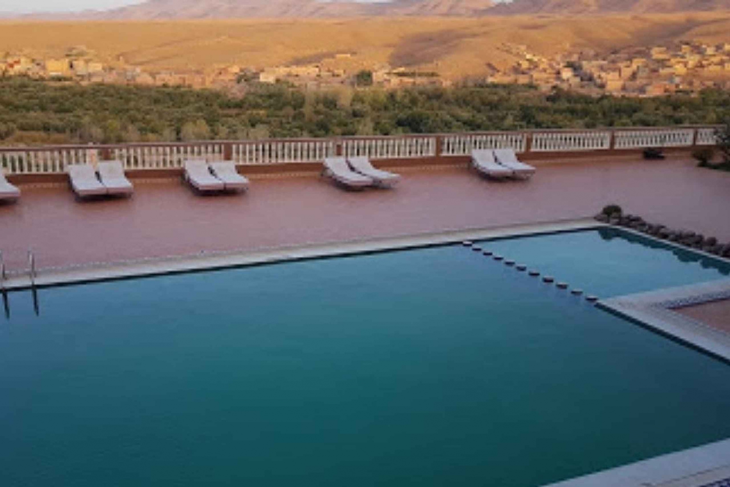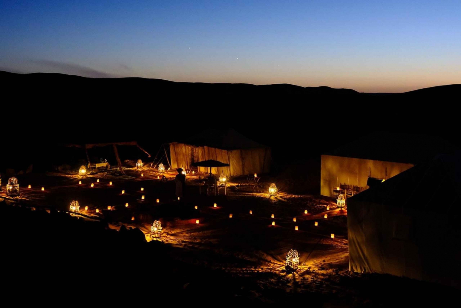 Nouto ja paluukuljetus hotellille. Opastettu kierros tärkeimmistä nähtävyyksistä. Ilmastoitu kuljetus mukavalla minibussilla tai -autolla. Wi-Fi-yhteys kyydissä 2 marokkolaista aamiaista 2 marokkolaista illallista (kasvisvaihtoehto saatavilla) Yksi yö Maison d'hôtes Chez L'habitant Amazighissa tai vastaavassa. Yksi yö ylellisessä leirissä Merzougassa (yksityinen kylpyhuone, suihku ja lämmin vesi ovat saatavilla Luxury-vaihtoehdossa) uima-allas ensimmäisenä päivänä hotellissa uima-allas lounaan jälkeen toisena päivänä Kameliratsastus Saharan aavikon kultaisilla dyynien leirille ja sieltä eteenpäin. turvallinen matkatavarasäilytys ja -käsittely Hiekkalautailua Saharan kultaisilla dyynillä. perinteinen berberimusiikkiesitys mönkijäajelu Saharan autiomaassa (valinnainen aktiviteetti) Ammattimainen monikielinen kuljettaja ja opas. mahdollisuus kokeilla perinteisiä berberivaatteita ja hennatatuointiaImportant Information