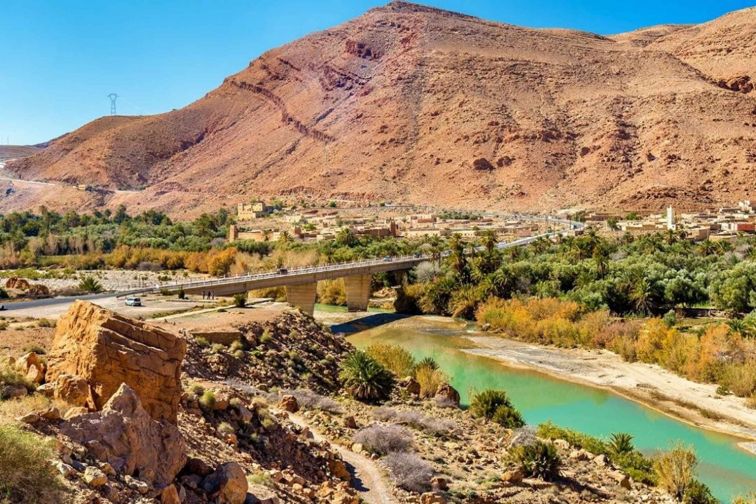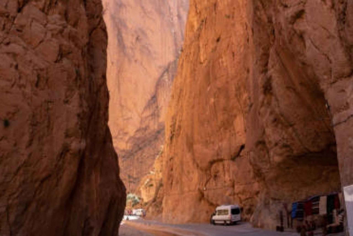 Päivä 1 Marrakech - Ouarzazate - Skoura - Dadesin laakso Matka-aika: noin 5h 30min Aloita matkasi vilkkaasta Marrakechin kaupungista. Ylität majesteettisen High Atlas -vuoriston Tizi n'Tichkan solan kautta, josta avautuvat upeat panoraamanäkymät. Vieraile Unescon luettelossa olevassa Ait Ben Haddou Kasbahissa, joka on kuuluisa kulissi monille elokuville. Jatka Ouarzazateen, joka tunnetaan 'Afrikan Hollywoodina', ja kulje Skouran palmutarhojen läpi. Illalla saavut Boumalne Dadesiin, jossa vietät yön perinteisessä Amazigh-majoituksessa. Nauti rauhallisesta ilmapiiristä ja aidosta paikallisesta vieraanvaraisuudesta. 2. päivä Dadesin laakso - Todran rotko - Merzougan autiomaa Matka-aika: noin 4h 45min Virkistävän aamiaisen jälkeen suuntaat kohti upeaa Todran rotkoa, jossa korkeat kalliot kohtaavat kristallinkirkkaat vedet. Jatka matkaa Merzougaan, jossa aavikko odottaa. Koe maaginen kameliratsastus kultaisten dyynien halki auringonlaskun aikaan, mikä on todella unohtumaton hetki. Yösi vietät ylellisessä aavikkoleirissä, jossa nautit perinteisestä marokkolaisesta illallisesta, paikallisesta musiikista ja tähtien katselusta nuotion äärellä Saharan valtavan taivaan alla. Päivä 3 Merzouga - Erfoud - Midelt - Azrou - Ifrane - Fes. Matka-aika: noin 7h 15min Aloita päiväsi lumoavalla aavikkoauringonnousulla ennen Merzougasta lähtöä. Kulje fossiileistaan tunnetun Erfoudin läpi ja jatka palmuviljelmien ympäröimän viehättävän Ziz-laakson läpi. Matkusta Lähi-Atlas-vuoriston läpi, pysähdy Azroun setrimetsissä ja bongaa barbaarimakakkeja ja vieraile viehättävässä Ifranen kaupungissa, jota kutsutaan usein 'pikku Sveitsiksi'. Saavu lopuksi Fesiin, jossa matkasi päättyy.Includes