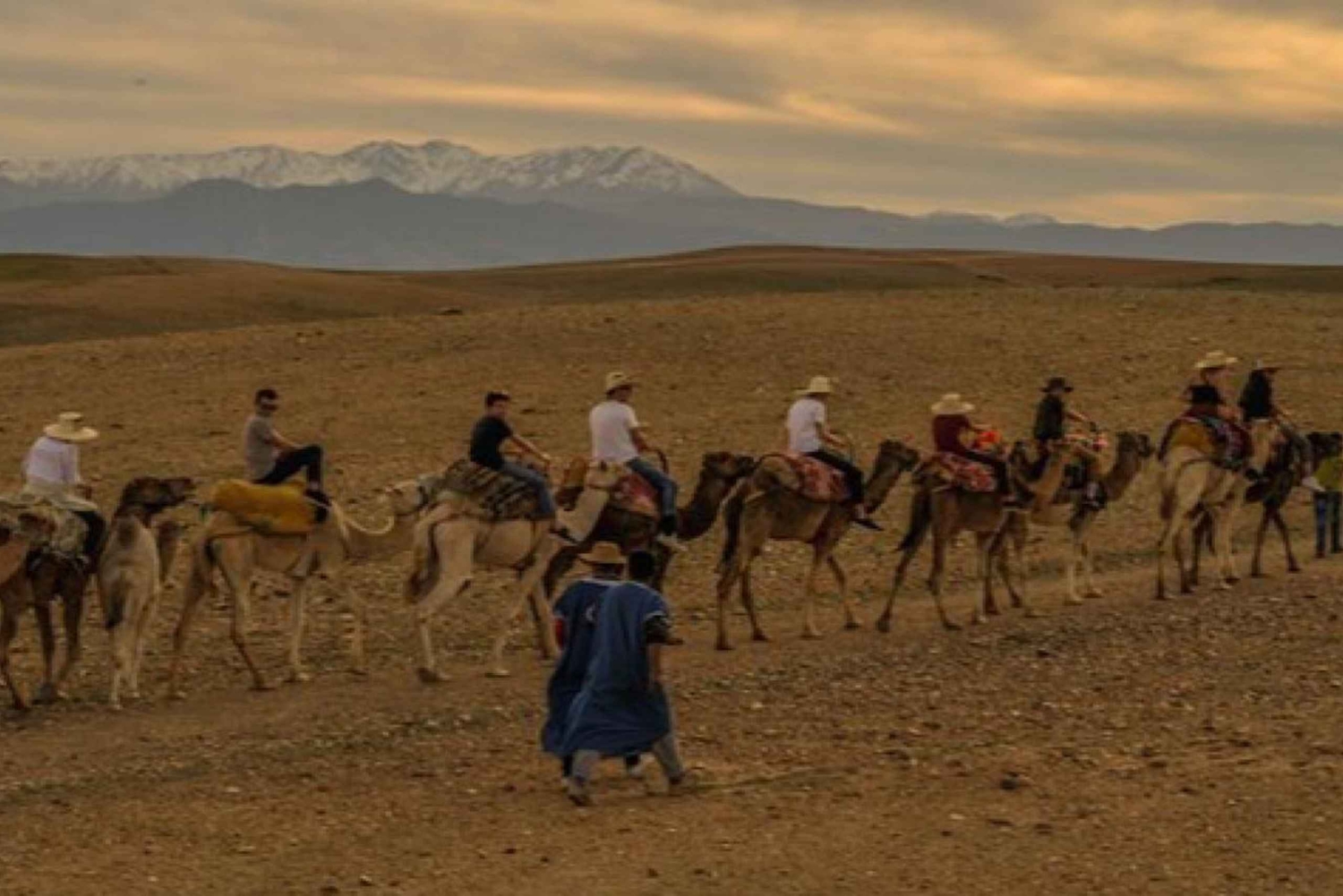 Pakene Marrakechin kiireisiä katuja ja uppoudu Agafayn aavikon rauhalliseen kauneuteen. Iltasi alkaa sujuvalla kuljetuksella viehättävään aavikkoleiriin, jota ympäröivät kultaiset kukkulat. Auringonlaskun aikaan voit nauttia rauhallisesta tunnelmasta, ottaa kuvia ja rentoutua lämpimässä marokkolaisessa tervetuliaisessa. Asetu kauniille berberityyliselle oleskelualueelle, jossa tarjoillaan perinteinen marokkolainen illallinen. Maistele paikallisia makuja, kuten tuoreita salaatteja, tagineja, grillattuja ruokia ja makeaa marokkolaista teetä. Lyhtyjen pehmeä hehku ja yötaivas luovat täydelliset puitteet unohtumattomalle aavikkokokemukselle. Nauti koko illan ajan live-viihteestä, johon kuuluu perinteistä musiikkia, rumpuja ja kiehtova tuliesitys, joka valaisee aavikon yön. Voit kävellä leirissä, istua nuotion äärellä tai vain nauttia aavikon rauhallisesta hiljaisuudesta. Taianomaisen tähtiyön jälkeen kuljettaja vie sinut mukavasti takaisin Marrakeshiin.Includes