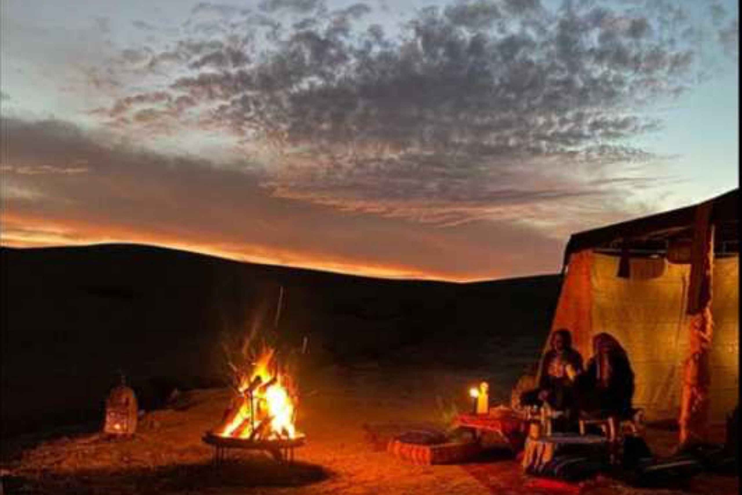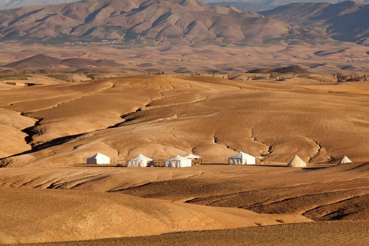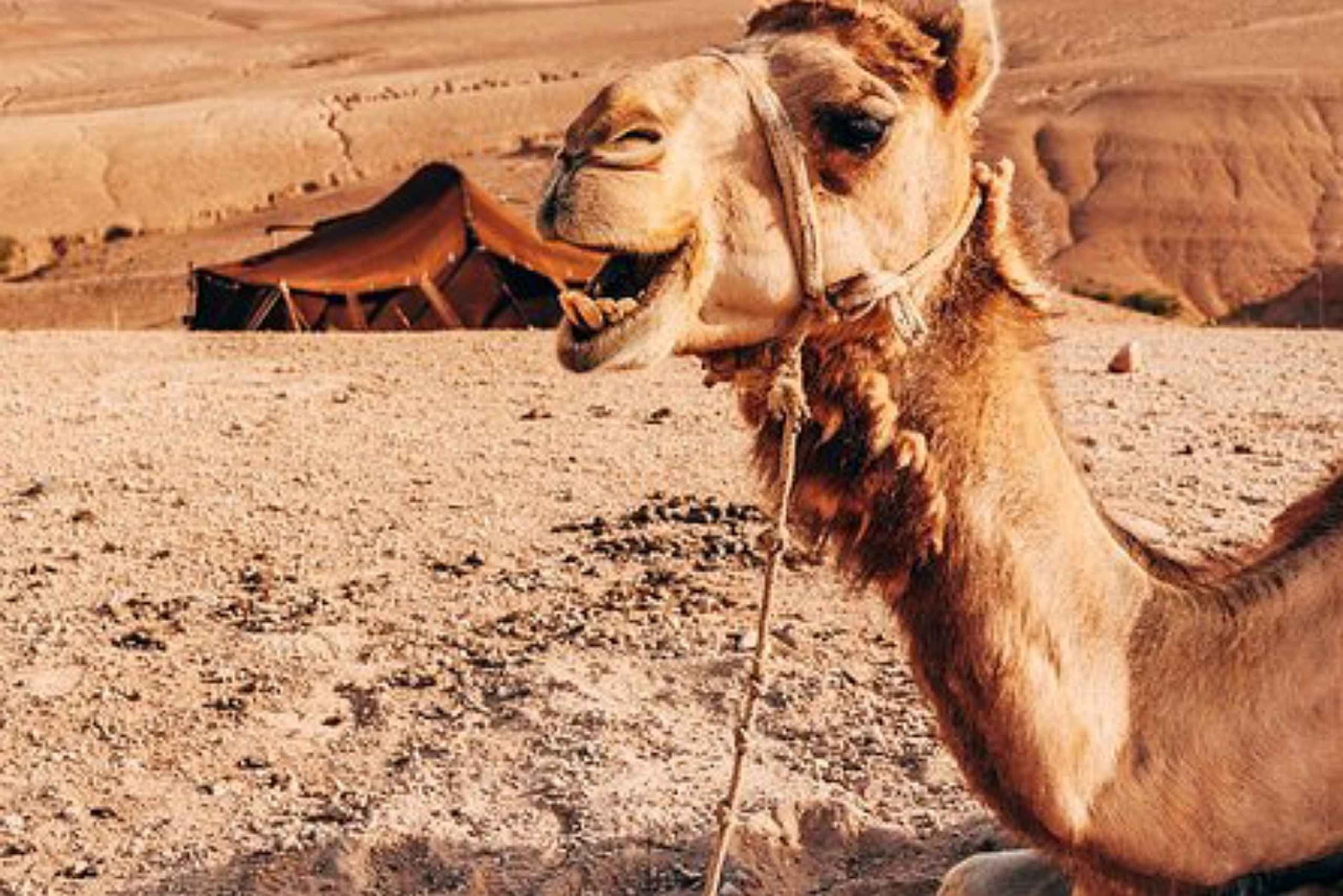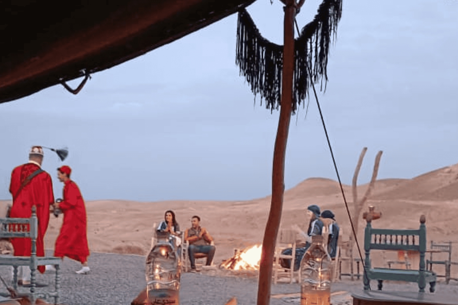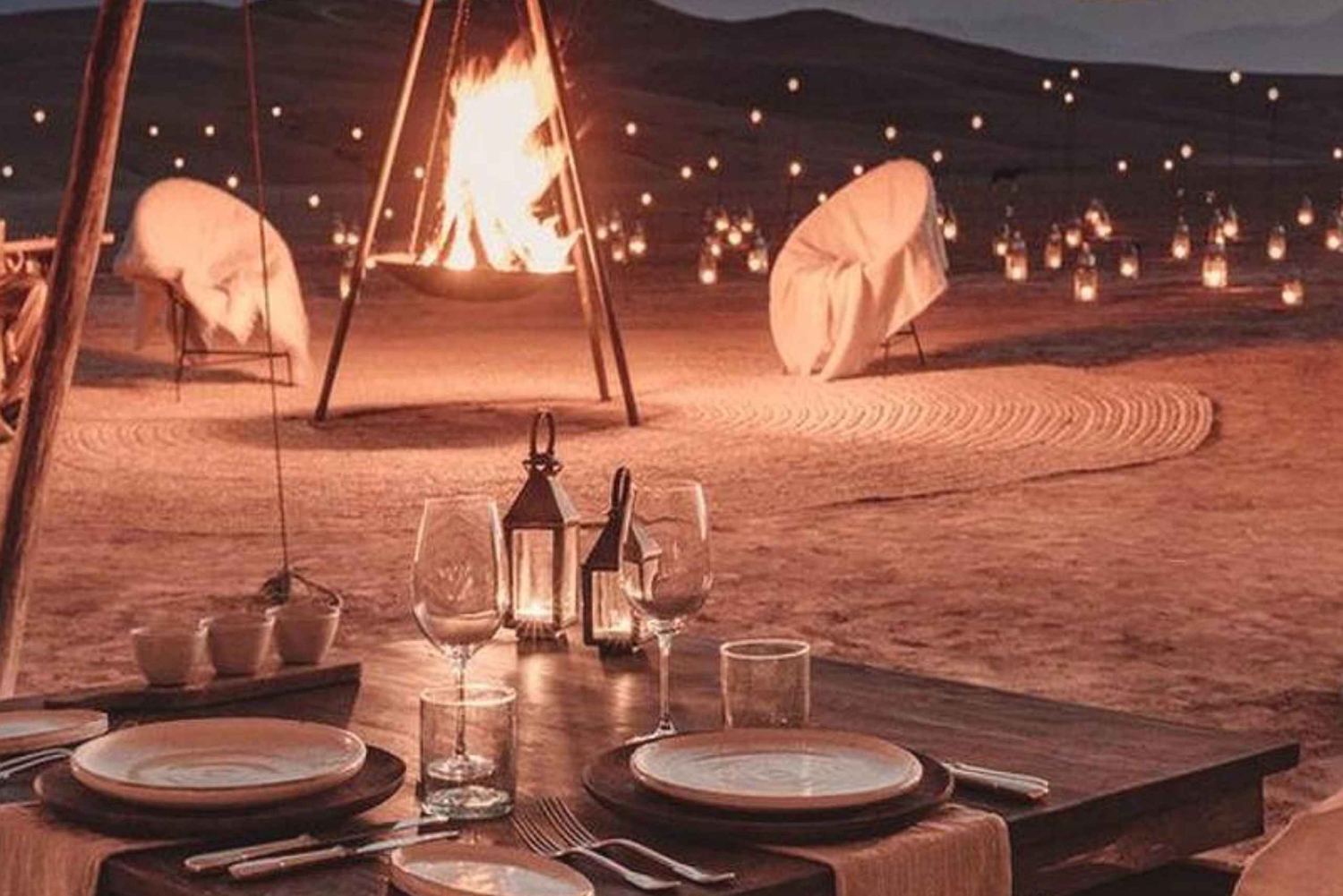 Tutustu berberikulttuurin ihanuuteen, kun lähdet Marrakechista Agafayn autiomaahan yöpymään tähtien alla. Ihaile upeita aavikkonäkymiä ja nauti ympäristön tyyneydestä nauttiessasi perinteisen musiikin, ruoan ja viihteen illasta. Marrakechin hotellin noutamisen jälkeen lähdet Agafayn autiomaahan. Saapuessasi nauti lämpimästä, perinteisestä vastaanotosta ja aromaattisesta marokkolaisesta teestä, joka on vieraanvaraisuuden symboli, ja asetu viihtyisälle istuinalueelle. Kun aurinko alkaa laskeutua, voit seurata auringonlaskun eläviä sävyjä, jotka maalaavat aavikon näkymät. Valmistaudu seuraavaksi gastronomiseen seikkailuun, kun sinulle tarjoillaan runsas perinteinen illallinen. Nauti herkullisesta ateriasta, joka sisältää aitoja marokkolaisia ruokia, jotka on valmistettu huolellisesti aistejasi kiusaamaan. Maut, aromit ja koostumukset vievät sinut marokkolaisen keittiön sydämeen. Kun nautit ateriastasi, muusikot nousevat lavalle ja täyttävät yöilman lumoavilla berberimelodioilla. Sitten voit seurata, kuinka taitavat esiintyjät manipuloivat tulisia liekkejä yön tummaa samettia vasten. Ihmettele, kun he luovat uuden maailman spektaakkelia, tanssivia valoja ja mystistä taituruutta. Illan päätteeksi voit palata majapaikkaasi Marrakechissa ja päättää seikkailusi.Includes