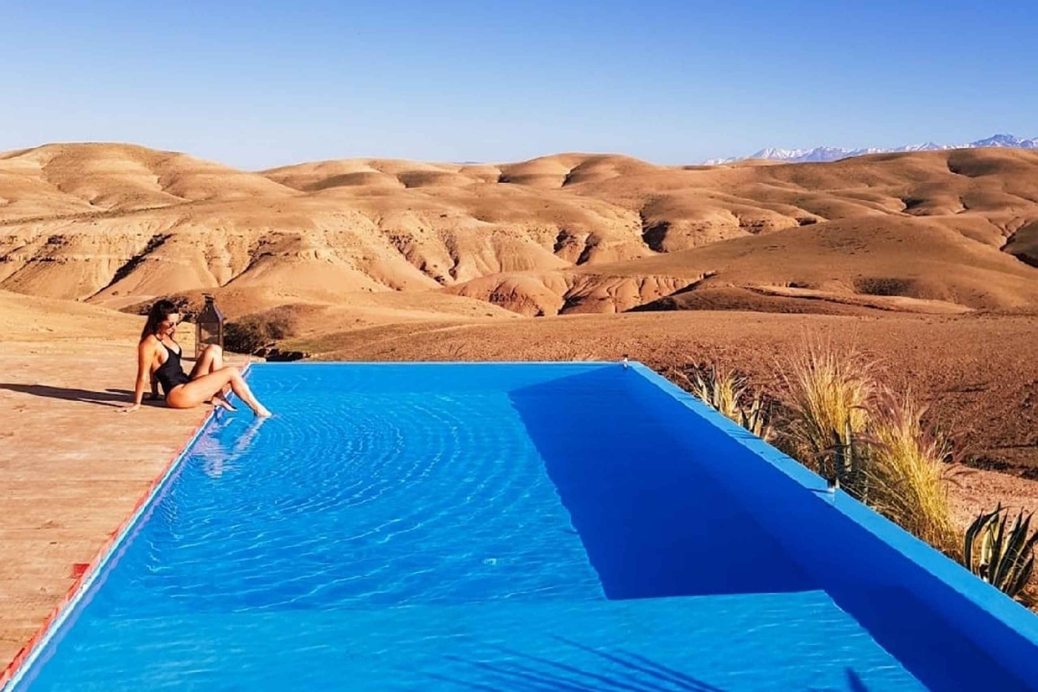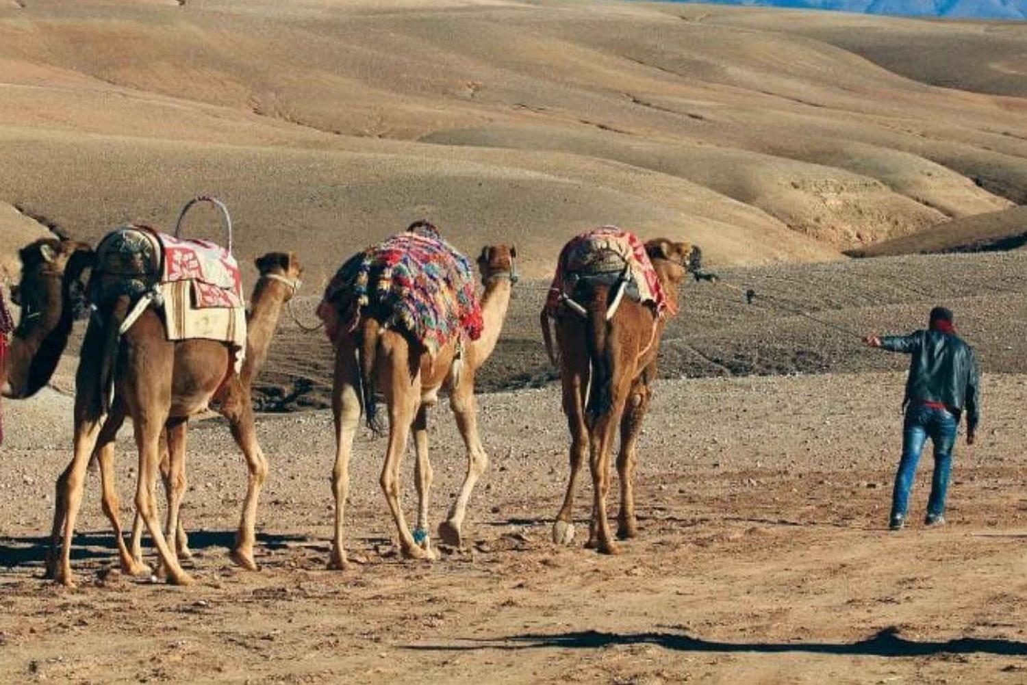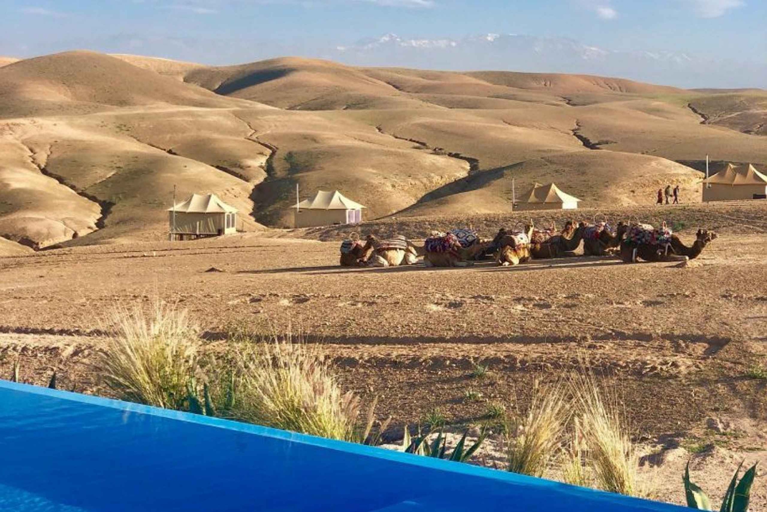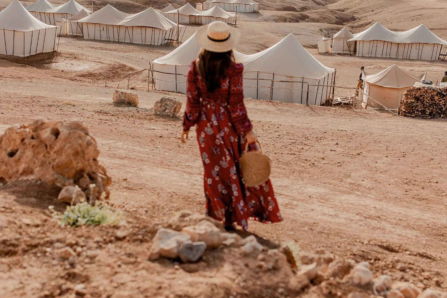 Tutustu berberikulttuurin ihanuuteen, kun lähdet Marrakechista Agafayn autiomaahan yöpymään tähtien alla. Ihaile upeita aavikkonäkymiä ja nauti ympäristön tyyneydestä nauttiessasi perinteisen musiikin, ruoan ja viihteen illasta. Marrakechin hotellin noutamisen jälkeen lähdet Agafayn autiomaahan. Saapuessasi nauti lämpimästä, perinteisestä vastaanotosta ja aromaattisesta marokkolaisesta teestä, joka on vieraanvaraisuuden symboli, ja asetu viihtyisälle istuinalueelle. Kun aurinko alkaa laskeutua, voit seurata auringonlaskun eläviä sävyjä, jotka maalaavat aavikon näkymät. Valmistaudu seuraavaksi gastronomiseen seikkailuun, kun sinulle tarjoillaan runsas perinteinen illallinen. Nauti herkullisesta ateriasta, joka sisältää aitoja marokkolaisia ruokia, jotka on valmistettu huolellisesti aistejasi kiusaamaan. Maut, aromit ja koostumukset vievät sinut marokkolaisen keittiön sydämeen. Kun nautit ateriastasi, muusikot nousevat lavalle ja täyttävät yöilman lumoavilla berberimelodioilla. Sitten voit seurata, kuinka taitavat esiintyjät manipuloivat tulisia liekkejä yön tummaa samettia vasten. Ihmettele, kun he luovat uuden maailman spektaakkelia, tanssivia valoja ja mystistä taituruutta. Illan päätteeksi voit palata majapaikkaasi Marrakechissa ja päättää seikkailusi.Includes