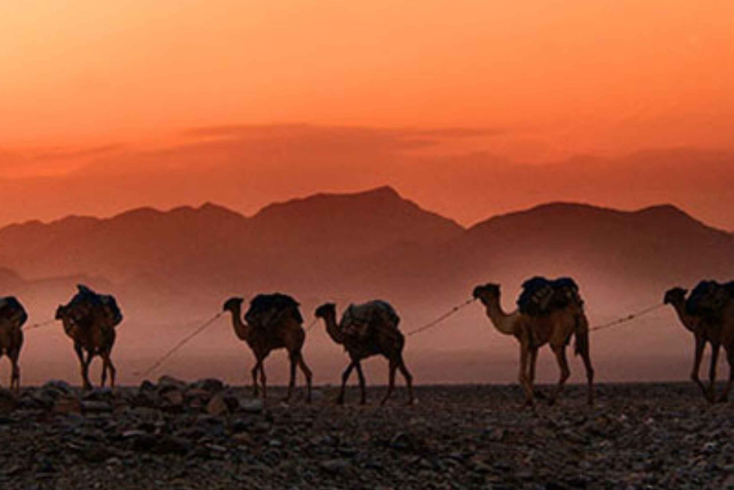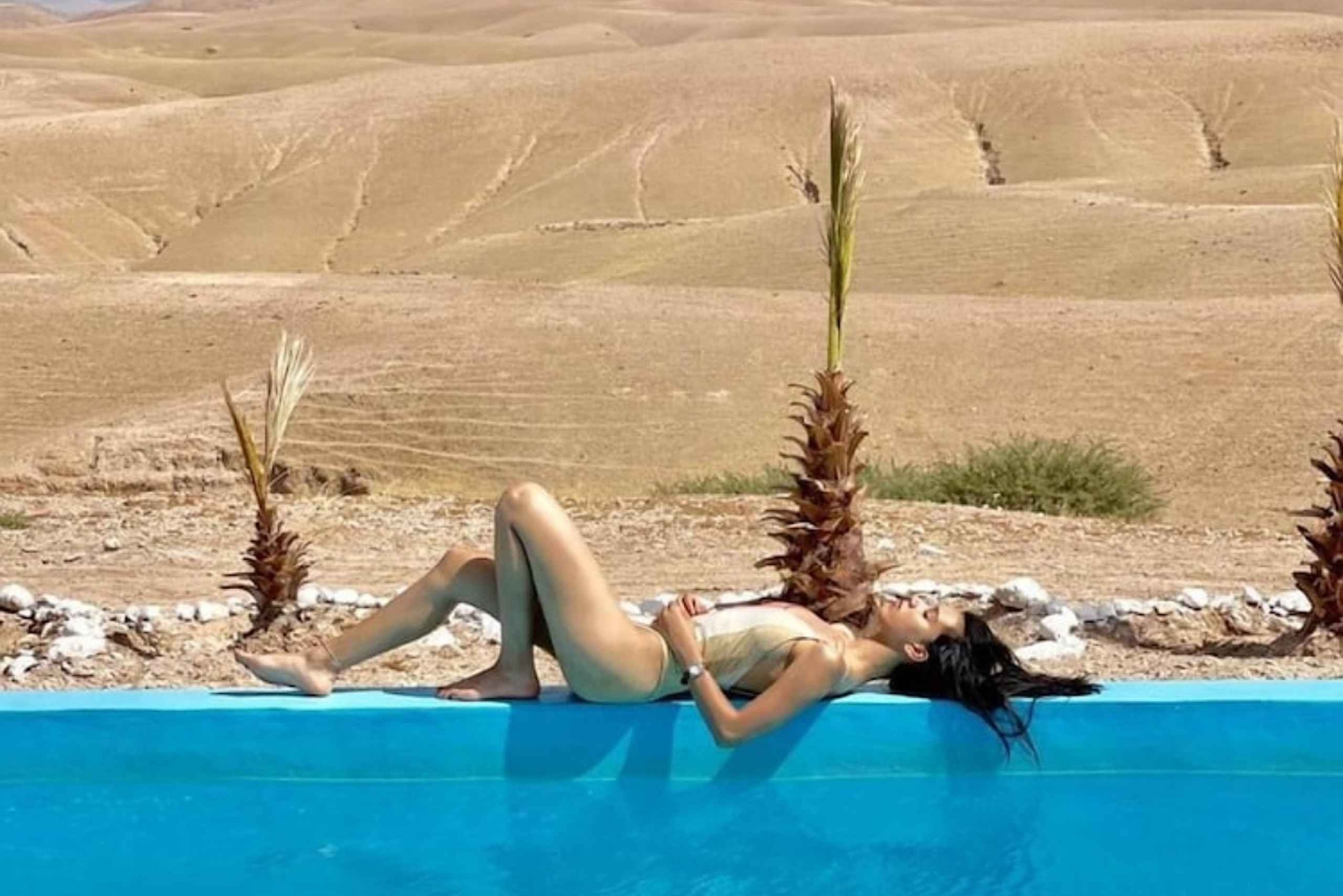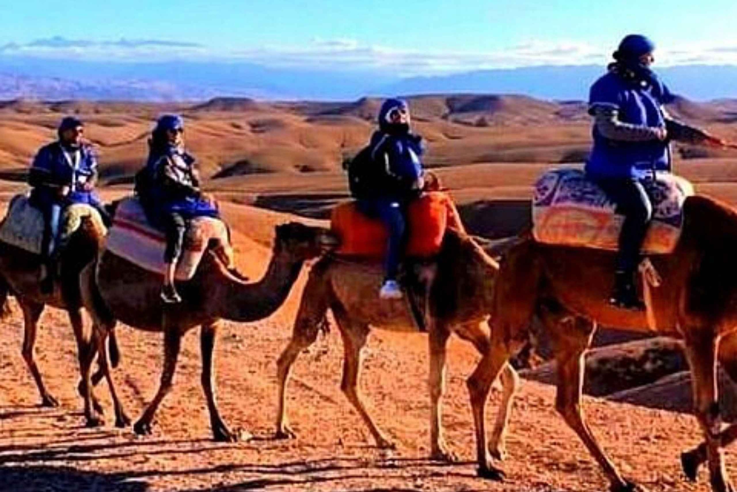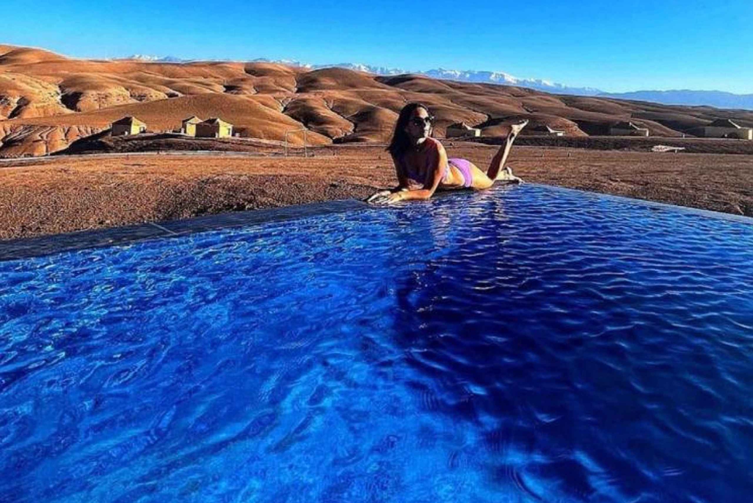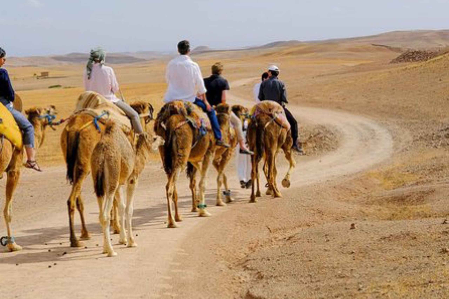 Tutustu berberikulttuurin ihanuuteen, kun lähdet Marrakechista Agafayn autiomaahan yöpymään tähtien alla. Ihaile upeita aavikkonäkymiä ja nauti ympäristön tyyneydestä nauttiessasi perinteisen musiikin, ruoan ja viihteen illasta. Marrakechin hotellin noutamisen jälkeen lähdet Agafayn autiomaahan. Saapuessasi nauti lämpimästä, perinteisestä vastaanotosta ja aromaattisesta marokkolaisesta teestä, joka on vieraanvaraisuuden symboli, ja asetu viihtyisälle istuinalueelle. Kun aurinko alkaa laskeutua, voit seurata auringonlaskun eläviä sävyjä, jotka maalaavat aavikon näkymät. Valmistaudu seuraavaksi gastronomiseen seikkailuun, kun sinulle tarjoillaan runsas perinteinen illallinen. Nauti herkullisesta ateriasta, joka sisältää aitoja marokkolaisia ruokia, jotka on valmistettu huolellisesti aistejasi kiusaamaan. Maut, aromit ja koostumukset vievät sinut marokkolaisen keittiön sydämeen. Kun nautit ateriastasi, muusikot nousevat lavalle ja täyttävät yöilman lumoavilla berberimelodioilla. Sitten voit seurata, kuinka taitavat esiintyjät manipuloivat tulisia liekkejä yön tummaa samettia vasten. Ihmettele, kun he luovat uuden maailman spektaakkelia, tanssivia valoja ja mystistä taituruutta. Illan päätteeksi voit palata majapaikkaasi Marrakechissa ja päättää seikkailusi.Includes
