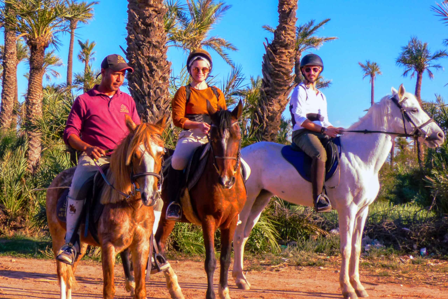Löydä Palmeraie, alue, jossa on yli 100 000 palmuja. Se on yksi alueen tärkeimmistä nähtävyyksistä ja täydellinen kohde ratsastukseen sekä perinteisten berberikylien katseluun. Nauti ikimuistoisesta tunnin ratsastuksesta tässä kauniissa ympäristössä. Kun olet ottanut aikaa valokuvien ottamiseen ja tutustumiseen paikalliseen alueeseen hevosesi selästä, voit nauttia ansaitun tauon istuen ja rentoutuen varjossa virkistävän minttuteen kera. Paluu Marrakechiin retken lopussa.Includes