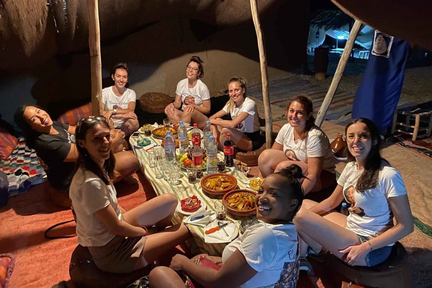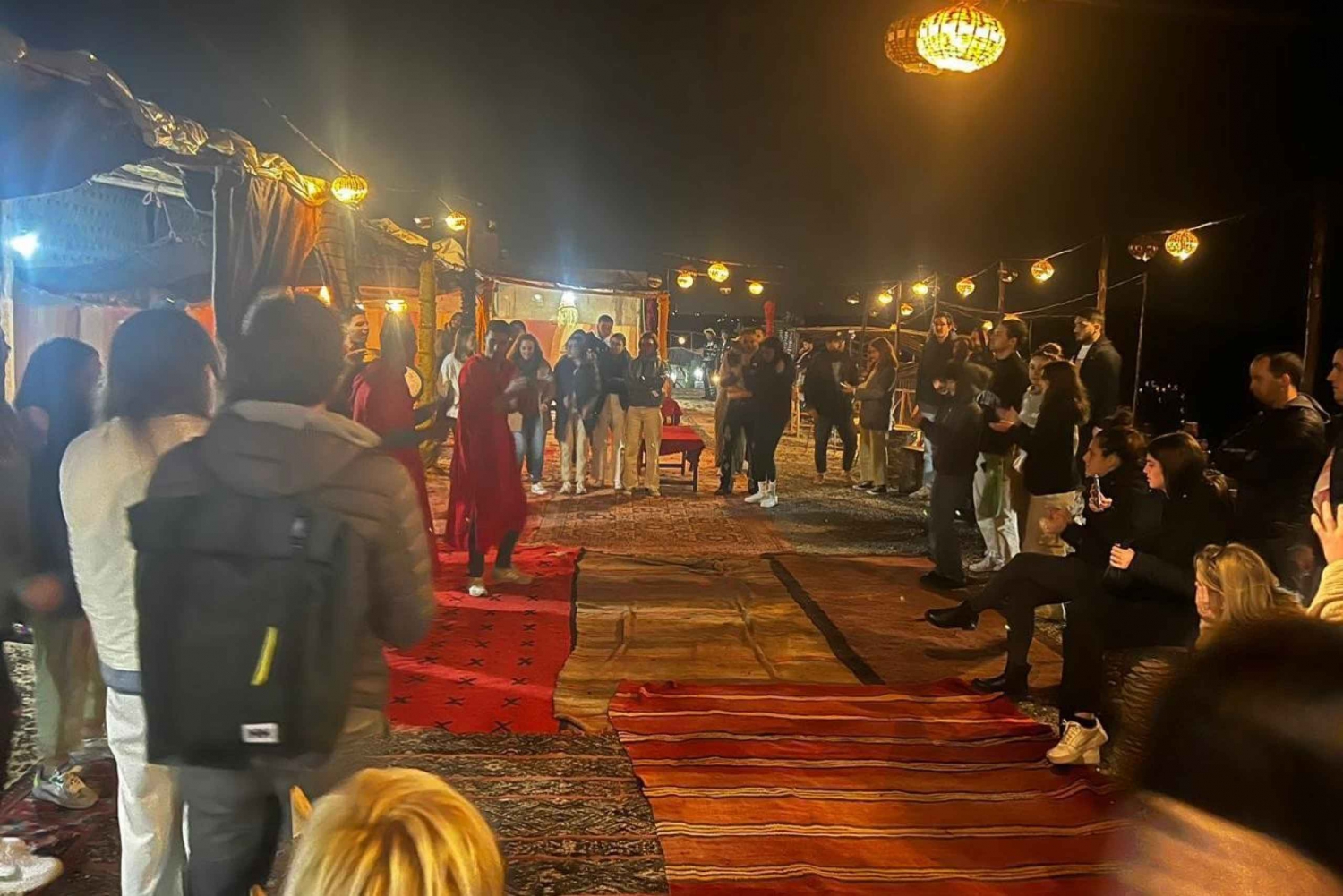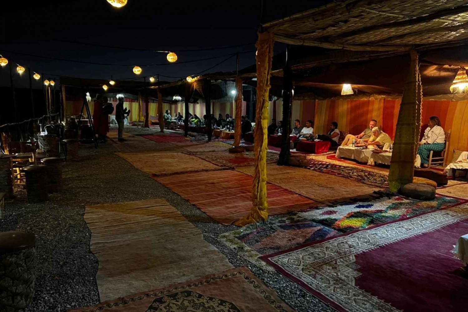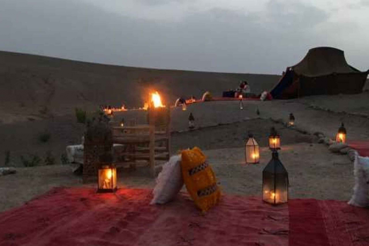 Hotellin nouto ja kyyditys . Illallinen perinteisessä teltassa aavikolla . Juomat, vesi, tee ja sooda . Paikallinen kansanmusiikkiryhmä . Marokkolaista menth-teetä nuotion ympärillä .Easy cancellation
