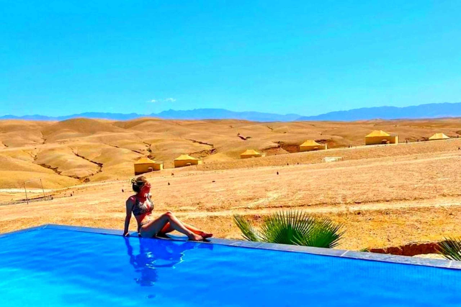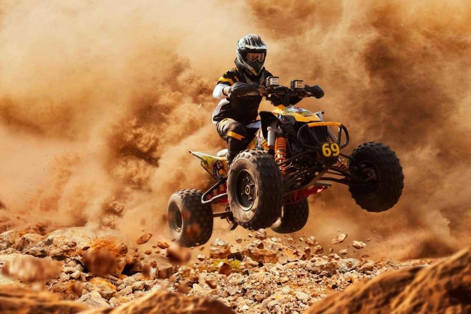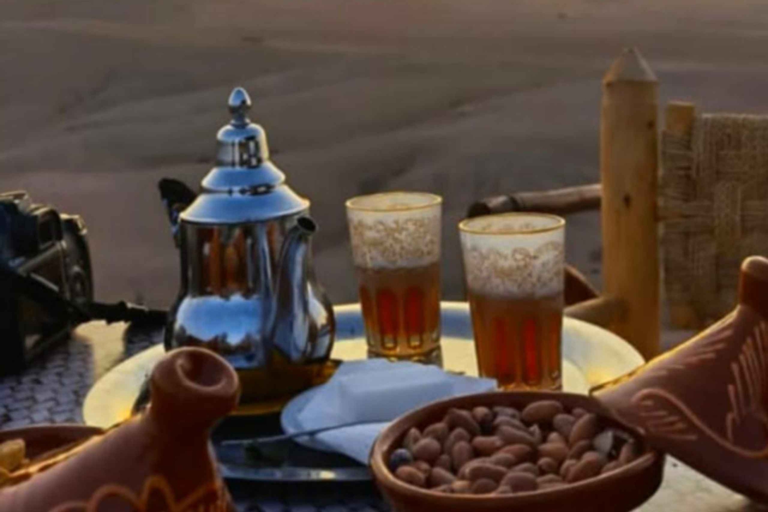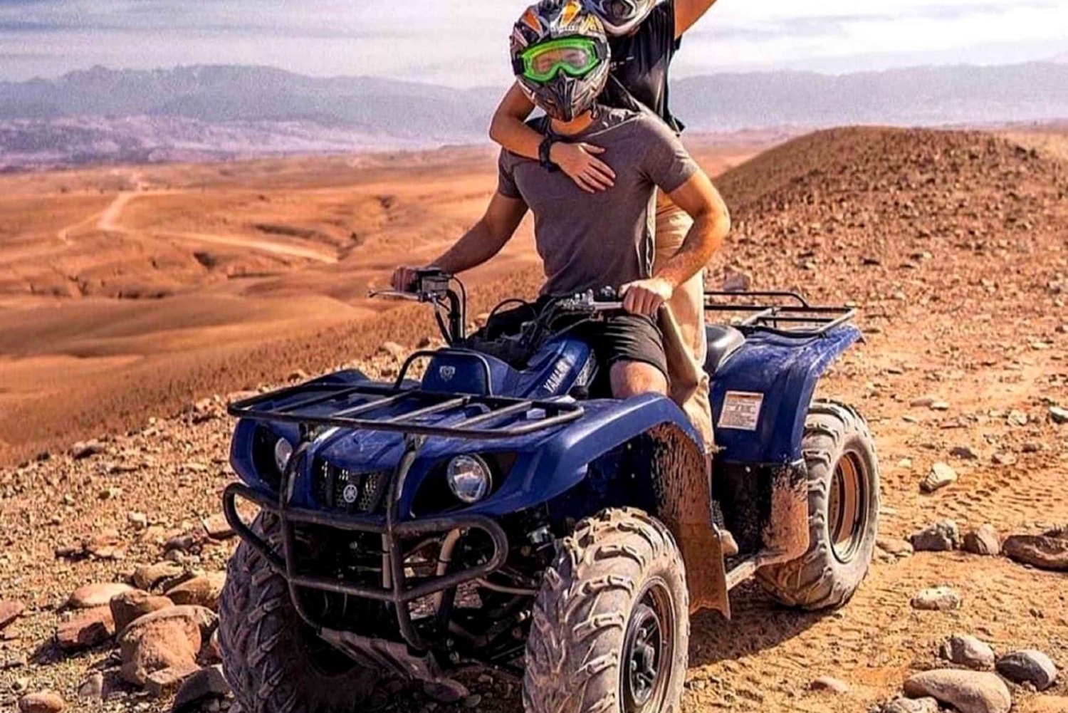 Tehosta matkaasi Marrakechiin seikkailullisella AtV-mönkijäajelulla. Hotellin edestakaiset kuljetukset katetaan, ja sinut viedään Quad Biking -tukikohtaan, joka sijaitsee 45 minuutin ajomatkan päässä Marrakechista, Saavuttuasi Agafayn autiomaahan, jossa kaikki Quadit säilytetään, kaikki osallistujat saavat perehdytyksen siitä, miten Quadia ajetaan turvallisuuden vuoksi, kaikki varusteet tarjotaan, ja sitten seikkailu voi alkaa. Nauti 1 tunnin Quad-ajelusta Agafayn autiomaan läpi ja ihaile henkeäsalpaavia panoraamoja, voit nauttia kävelystä tauolla paikallisten kanssa ja nauttia minttuteetä viehättävässä berberileirissä. Quad-kierroksen jälkeen sinulla on mahdollisuus juoda minttuteetä ja maistella herkullista Tajinea sekä salaattia ja hedelmiä berberileirissä, joka toivottaa sinut lämpimästi tervetulleeksi, Tutustut asukkaiden perinteiseen elämäntapaan, ja lounaan jälkeen sinulla on aikaa rentoutua tai uida uima-altaassa. Sitten kuljettaja vie sinut takaisin hotelliisi/riadiin Marrakechissa.Includes