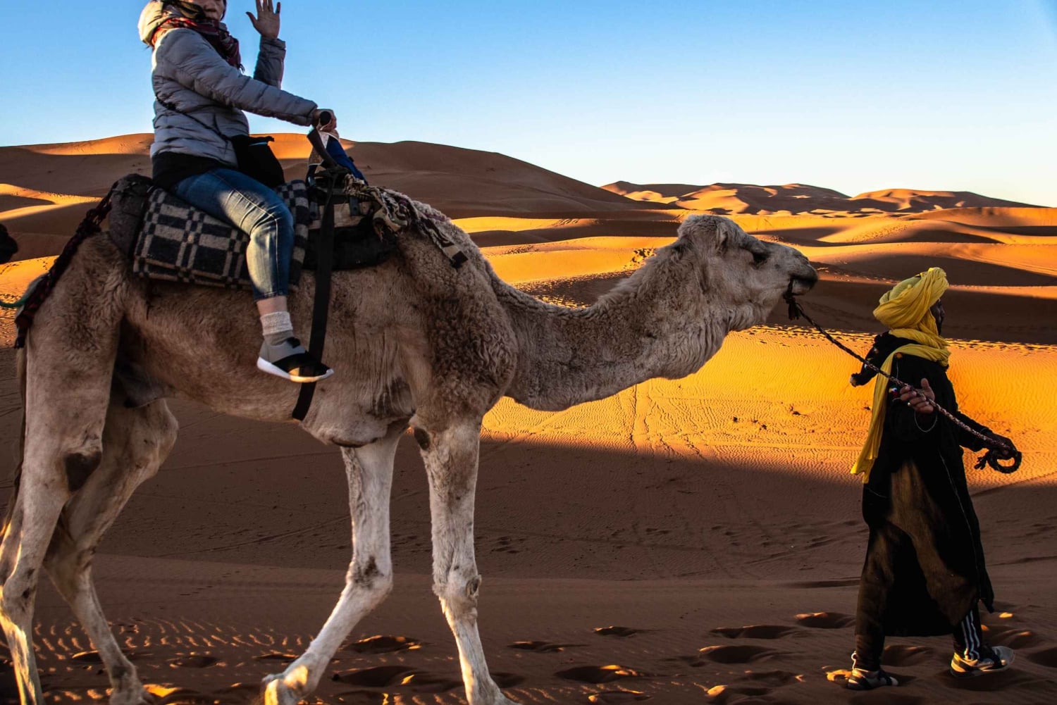 Jour 1 : Fès / Ifrane / Medilt / Merzouga Départ de Fès. Nous traversons Ifrane, une station de ski d'hiver au style totalement non marocain, construite par les Français dans les années 1930 pour ressembler à un village suisse. Poursuivez votre route à travers la forêt de cèdres d'Azrou et arrêtez-vous 10 à 20 minutes dans un endroit où vous pourrez observer des singes de près. Traversez les montagnes du Moyen Atlas et commencez à descendre vers le désert du Sahara. À mi-chemin, vous vous arrêterez pour déjeuner dans la ville de Midelt, célèbre pour ses fossiles et ses rochers, puis vous poursuivrez votre route vers Merzouga. En chemin, vous ferez une halte pour profiter d'une vue panoramique sur une immense oasis de palmiers. Vous arriverez à Merzouga, où vous dînerez et passerez la nuit à l'hôtel. Hébergement : Kasbah Mohayut ou similaire... Jour 2 : Merzouga / Erg Chebbi Dans la matinée, visite d'environ une demi-journée dans le désert pour découvrir les différents visages du désert, les villages, arrêt pour écouter de la musique saharienne à El Khamlia, l'oasis. Vous aurez une petite visite de Rissani, la première capitale de la dynastie alouite, y compris quelques Kasbahs historiques, et le célèbre marché. Vous aurez l'occasion de goûter à la nourriture locale de la région, la Pizza Berber. Nous continuons vers Merzouga. Le guide et le chameau vous attendront pour vous transporter à travers les dunes de sable de l'erg-chebbi. Vous profiterez de la beauté du coucher de soleil sur le chameau, après 1 heure de route jusqu'au camp au pied des dunes. Après un merveilleux dîner, vous observerez les étoiles et passerez la nuit sous la tente. Hébergement : Campement standard dans le désert (tente privée avec salle de bain attenante) Jour 3 : Merzouga / Gorges Todra / Ouarzazate Levez-vous tôt le matin pour observer le lever du soleil près du camp sur les dunes. Après le petit-déjeuner et la douche, vous partirez pour Ouarzazate, en empruntant la route accidentée des Mille Kasbahs qui se dressent comme des châteaux de sable le long de cet ancien itinéraire commercial des caravanes. Cette région a longtemps été un lieu de prédilection pour les films hollywoodiens tels que La Dernière Tentation du Christ, Le Diamant du Nil et, plus récemment, Hideous Kinky. La région centrale est l'une des destinations les plus passionnantes et romantiques du Maroc, nichée le long de riches vallées fluviales, de palmeraies et de maisons en briques de terre cuite aux couleurs vives sous le ciel bleu du désert. Nous nous arrêterons pour déjeuner et nous nous promènerons dans les gorges du Toudra. Nous voyagerons ensuite à travers la vallée du Dadès et ses escarpements spectaculaires. Dîner et nuit. Hébergement : Hôtel La Perle Du Sud ou similaire Jour 4 : Ouarzazate / Ait ben haddou / Marrakech : Après le petit-déjeuner, nous visiterons Ouarzazate, y compris les studios de cinéma Atlas, les plus grands et les plus célèbres de toute l'Afrique. De là, nous nous rendrons à la célèbre Kasbah, déclarée patrimoine mondial de l'UNESCO et qui a servi de décor à des films tels que Le Gladiateur, Babel, Lawrence d'Arabie. Nous continuerons en traversant le Haut Atlas et le col de Tizi-n-Tichka, le long d'une route qui grimpe des plaines jusqu'à 2260 m au-dessus du niveau de la mer en passant par de petits villages et des vues panoramiques. Nous vous déposerons à votre hôtel à Marrakech pour la fin de la visite vers 18h00.Includes