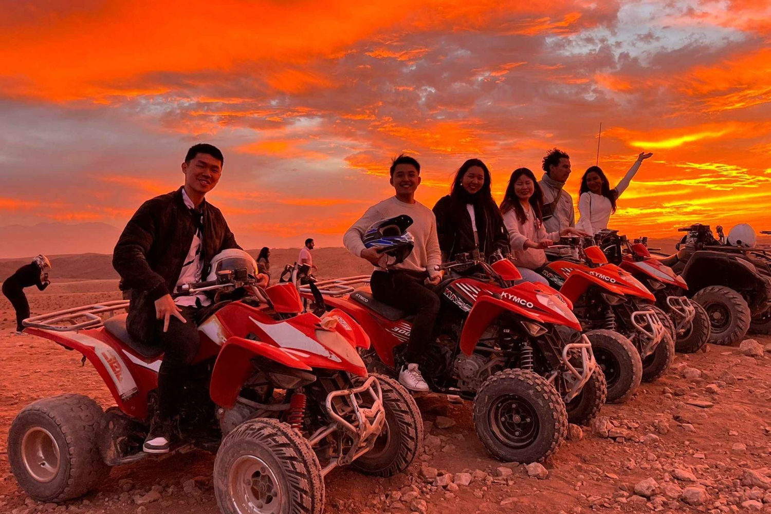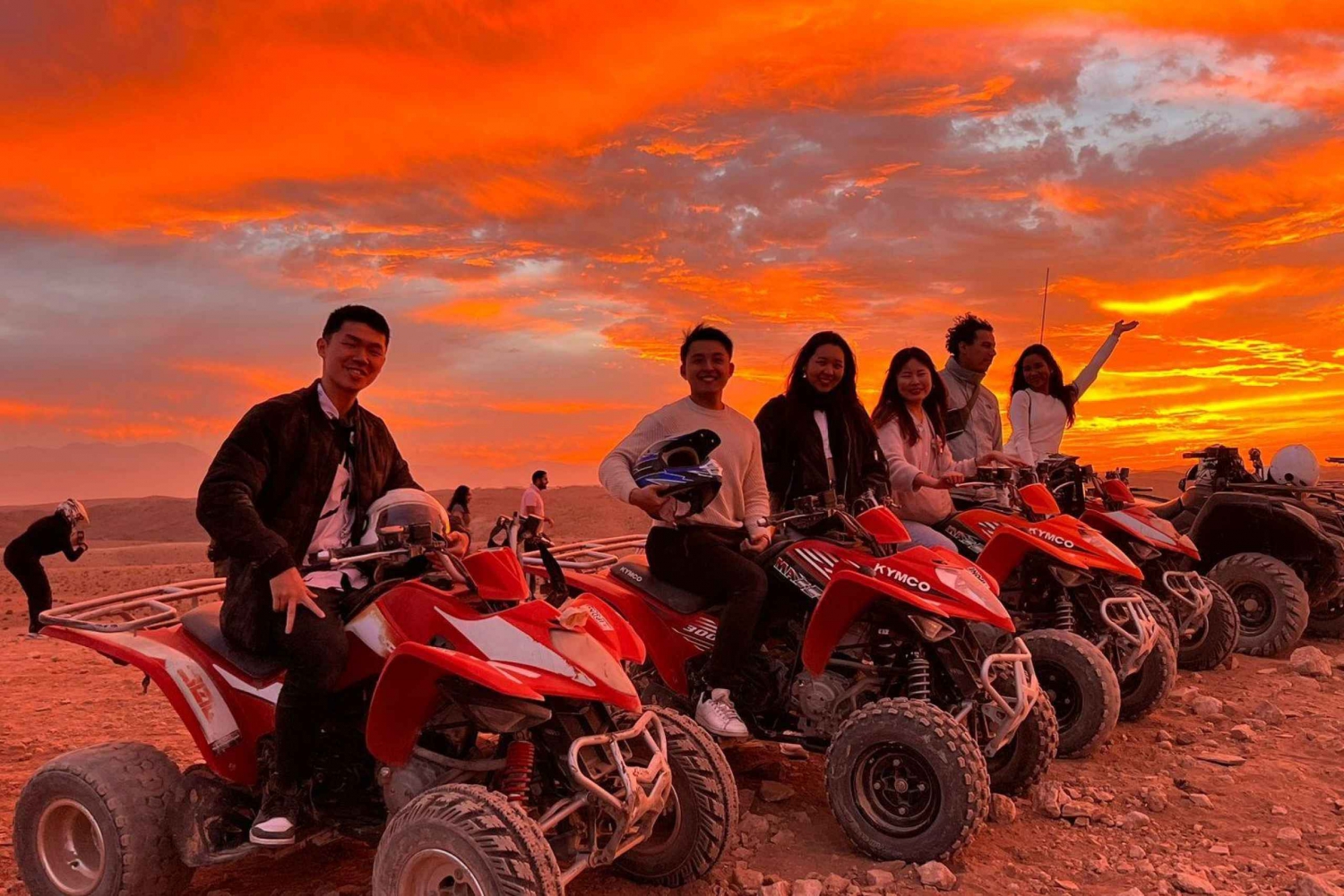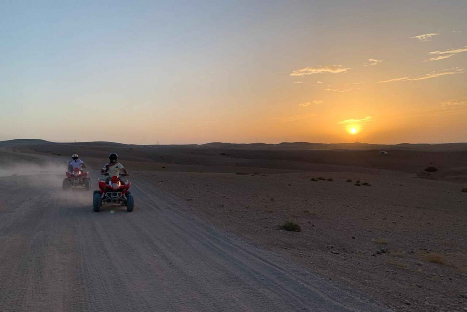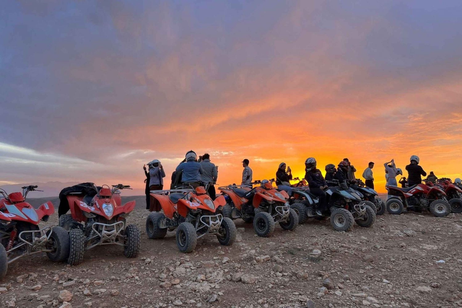 Vivez une aventure inoubliable dans le désert d'Agafay avec une passionnante balade en quad, une randonnée mémorable à dos de chameau et un dîner étoilé magique. Votre aventure commence par une prise en charge pratique à votre hôtel. Vous rencontrerez votre sympathique chauffeur qui vous guidera vers le désert. Une fois sur place, profitez d'une séance de quad palpitante à travers les dunes. Ensuite, montez à dos de chameau pour une balade traditionnelle dans le désert. À la tombée de la nuit, savourez un délicieux dîner sous les étoiles, entouré par la beauté sereine du désert. Enfin, détendez-vous pendant que votre chauffeur vous ramène à votre hôtel, clôturant ainsi une journée parfaite d'aventure et d'émerveillement.Includes