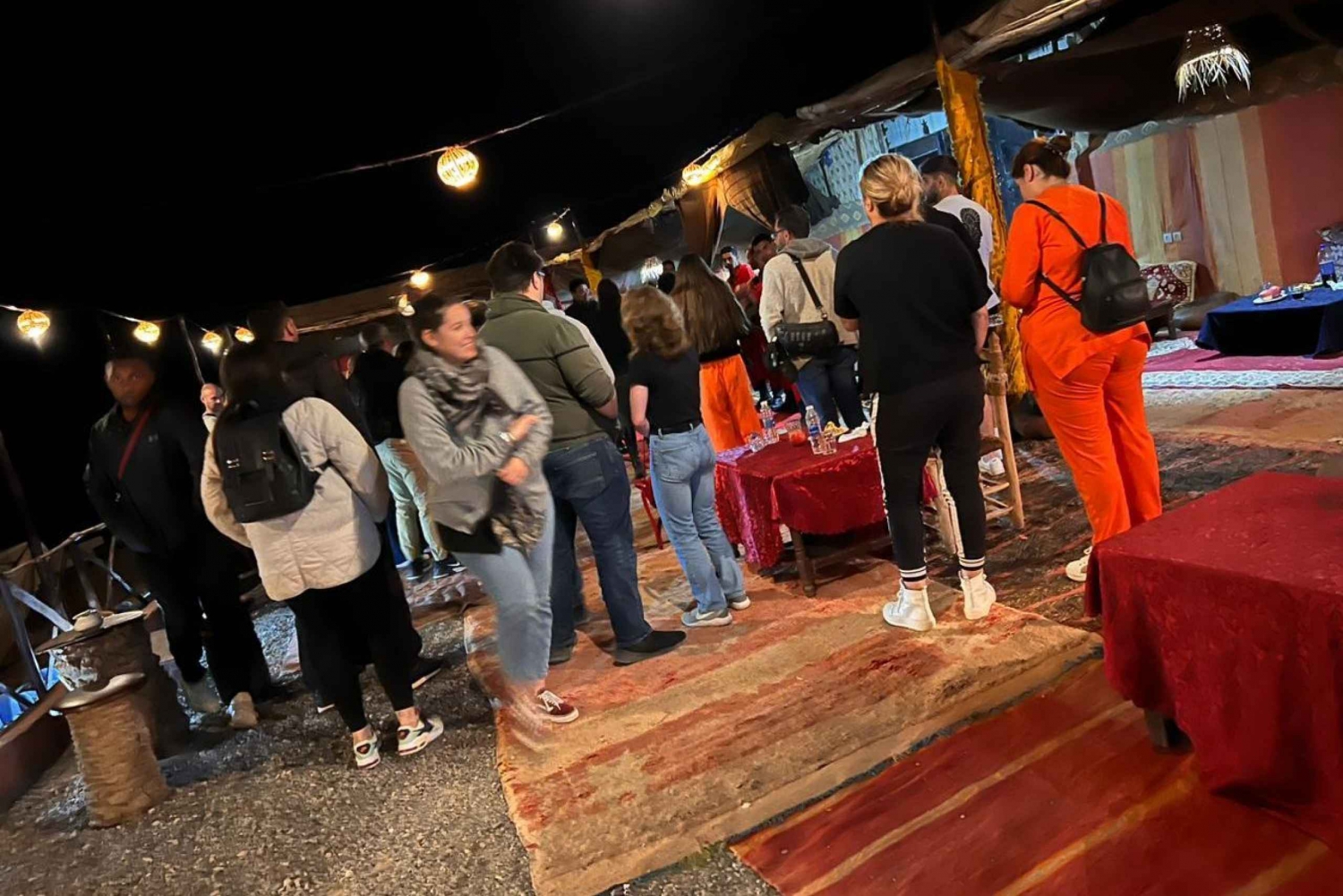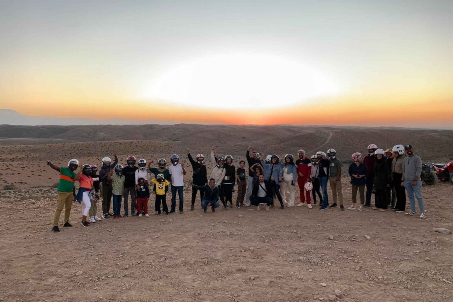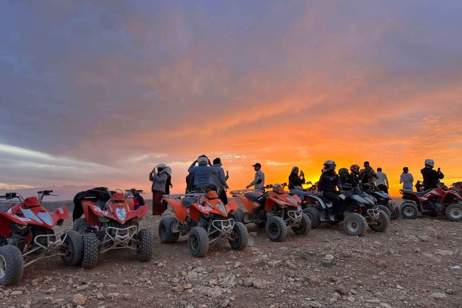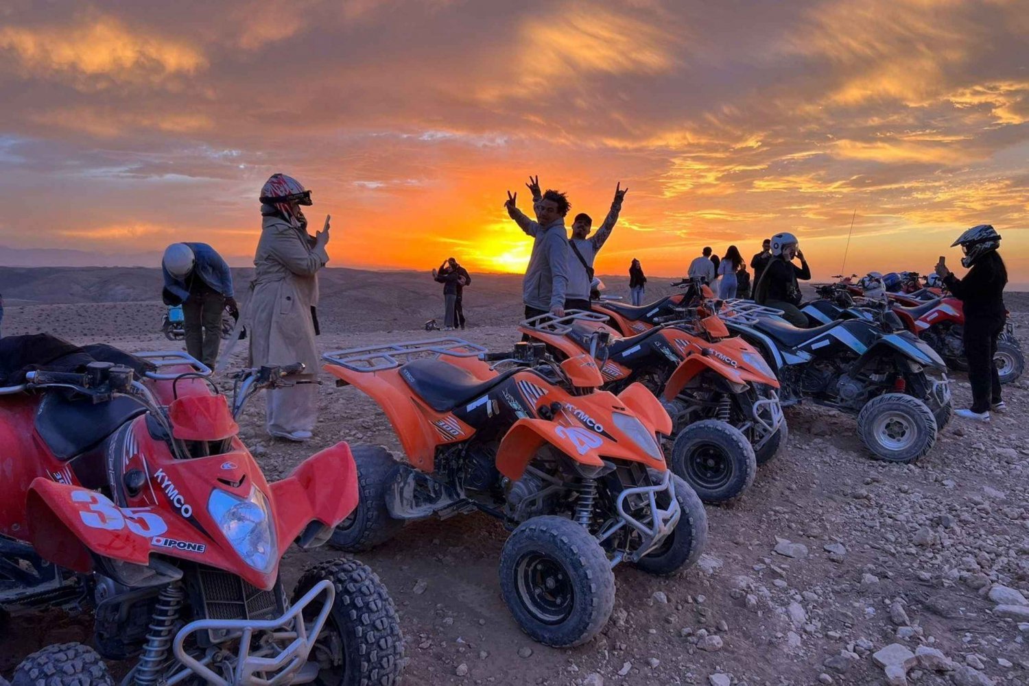 Vivez une aventure inoubliable dans le désert d'Agafay avec une passionnante balade en quad, une randonnée mémorable à dos de chameau et un dîner étoilé magique. Votre aventure commence par une prise en charge pratique à votre hôtel. Vous rencontrerez votre sympathique chauffeur qui vous guidera vers le désert. Une fois sur place, profitez d'une séance de quad palpitante à travers les dunes. Ensuite, montez à dos de chameau pour une balade traditionnelle dans le désert. À la tombée de la nuit, savourez un délicieux dîner sous les étoiles, entouré par la beauté sereine du désert. Enfin, détendez-vous pendant que votre chauffeur vous ramène à votre hôtel, clôturant ainsi une journée parfaite d'aventure et d'émerveillement.Includes