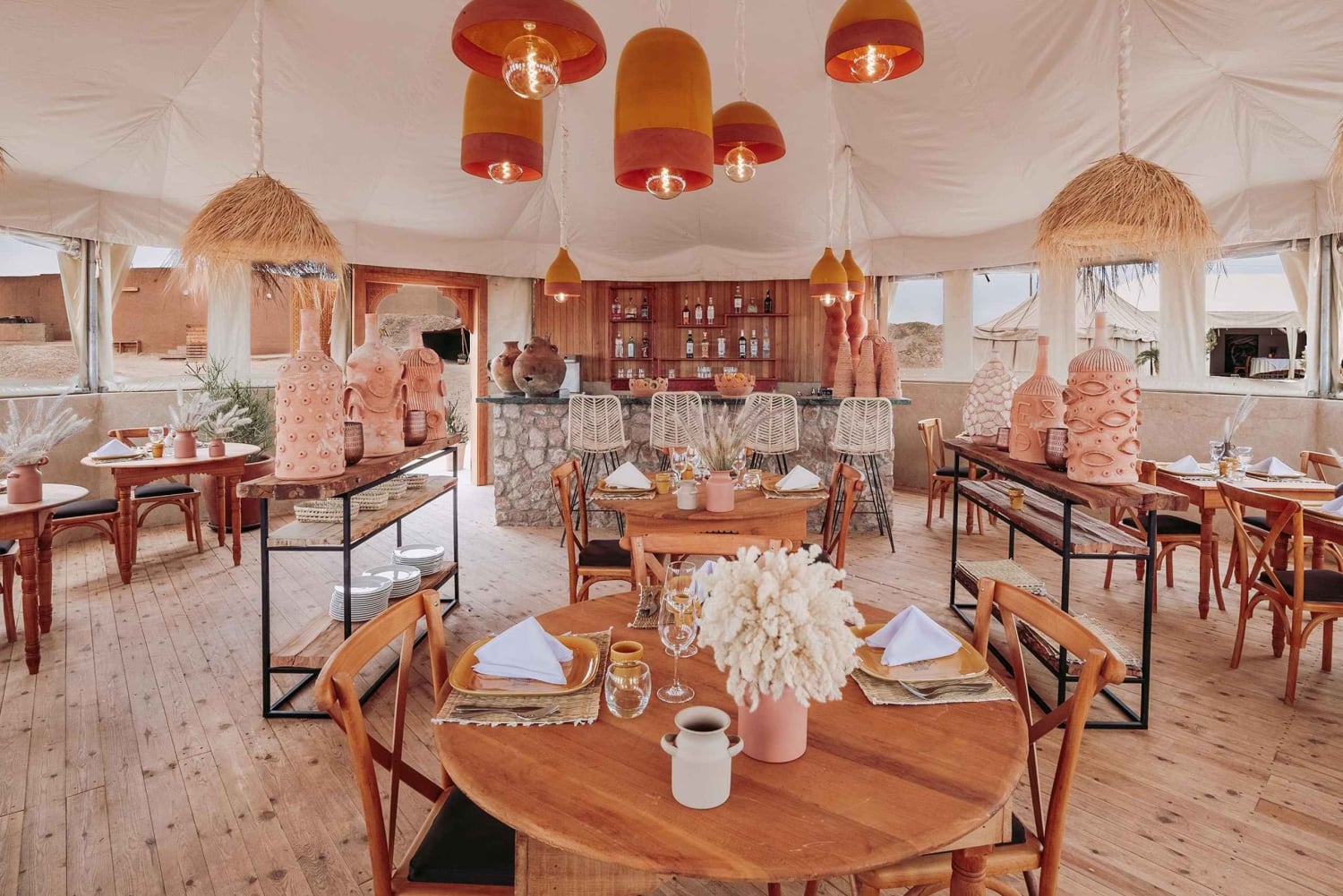 Dîner 3 plats Dîner dans une tente avec un bel espace extérieur (hors boissons) Transfert aller-retour en navette (heure de départ et de retour fixes) Animation locale commune (gnaoua, tatouage au henné, ...)Easy cancellation