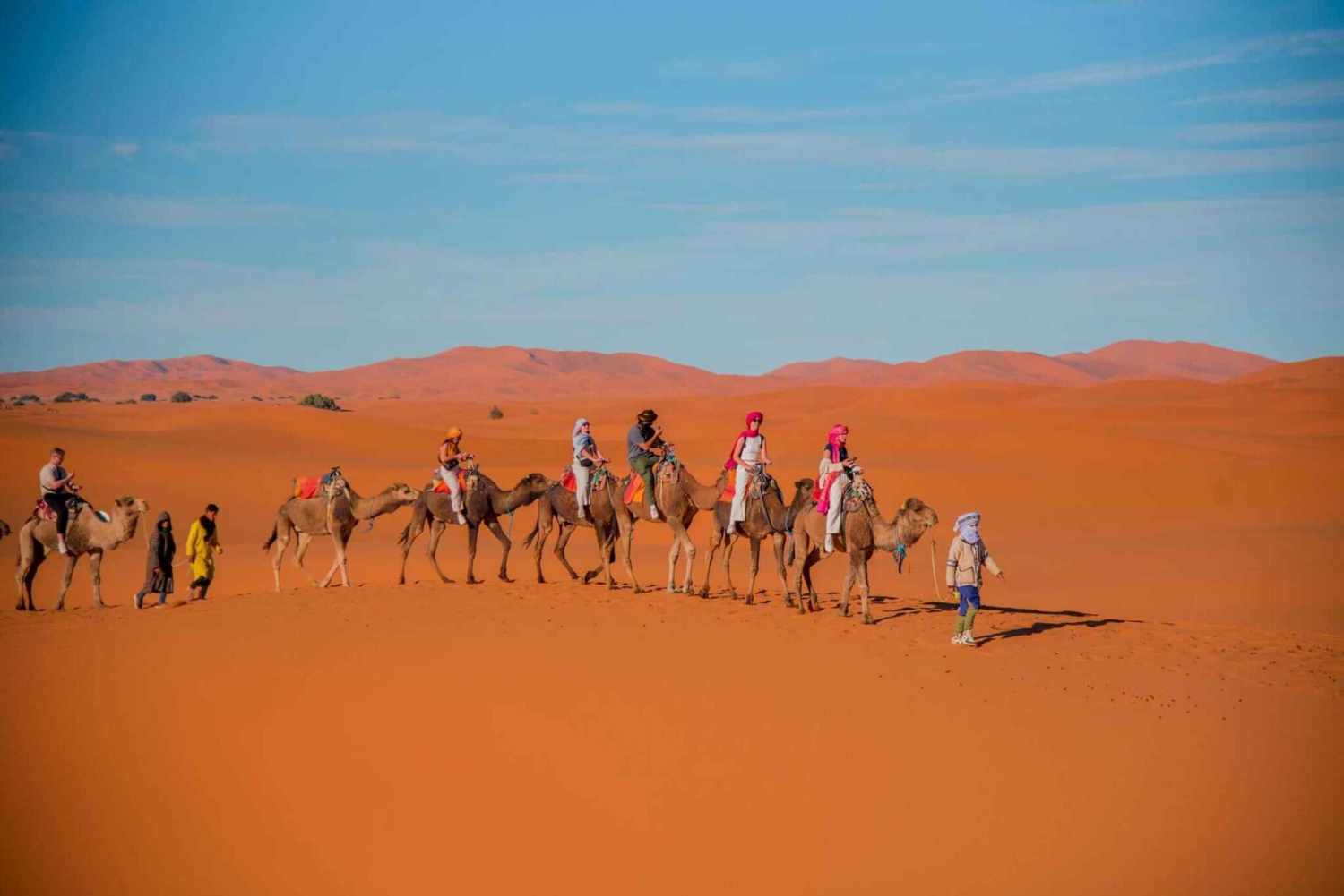 Jour 1 Commencez votre aventure par une prise en charge matinale à votre hôtel de Fès. Traversez le Moyen Atlas, en passant par Ifrane, une station de ski d'hiver construite par les Français pour ressembler à un village suisse pittoresque. Arrêtez-vous dans la forêt de cèdres d'Azrou pour profiter de la nature et nourrir les singes. Passez le reste de la journée à serpenter à travers les forêts, les sources, les parois rocheuses déchiquetées et les villages berbères, en traversant les montagnes de l'Atlas et en descendant vers le désert du Sahara. À mi-chemin, arrêtez-vous pour déjeuner dans la ville de Midelt, célèbre pour ses fossiles et ses roches. Continuez jusqu'à Merzouga, en vous arrêtant pour profiter des vues panoramiques de la vaste oasis de palmiers. Après votre arrivée, dirigez-vous directement vers la Kasbah traditionnelle au pied des dunes de l'Erg-Chebbi. Rafraîchissez-vous avec un thé à la menthe avant de monter à dos de chameau à travers les dunes de sable au coucher du soleil. Passez la nuit dans une tente berbère dans un camp. Dînez autour d'un feu de camp, écoutez de la musique berbère traditionnelle et détendez-vous sous les étoiles. Deuxième jour Profitez d'un délicieux petit-déjeuner au campement avant de vous rendre à Ouarzazate en empruntant la route accidentée des mille kasbahs. Pendant le trajet, admirez les kasbahs qui s'élèvent comme des châteaux de sable surmontés de tourelles le long de cette ancienne route commerciale pour les caravanes. Arrêtez-vous pour déjeuner avant de faire une courte randonnée dans les gorges de Todra. Ensuite, vous traversez la vallée du Dadès en passant par des escarpements spectaculaires avant d'arriver à votre hôtel. Savourez un délicieux dîner avant de vous endormir. Troisième jour Après le petit-déjeuner, visite de la ville de Ouarzazate et de ses monuments, de la Kasbah de Taourirt et des studios de cinéma Atlas Studios, les plus grands et les plus célèbres d'Afrique. Déjeunez à Ait Ben Haddou avant de visiter la célèbre Kasbah de la région, classée au patrimoine mondial de l'UNESCO. Au cours de votre exploration, vous verrez où ont été tournés des films tels que Le Gladiateur, Babel et Lawrence d'Arabie. Poursuivez ensuite votre voyage à travers les montagnes du Haut Atlas et le col de Tizi-n-Tichka, le plus haut sentier de montagne d'Afrique du Nord. Montez des plaines jusqu'à 7 500 pieds au-dessus du niveau de la mer, en traversant de petits villages et en passant devant de pittoresques petites chutes d'eau. Terminez votre voyage à Marrakech.Includes