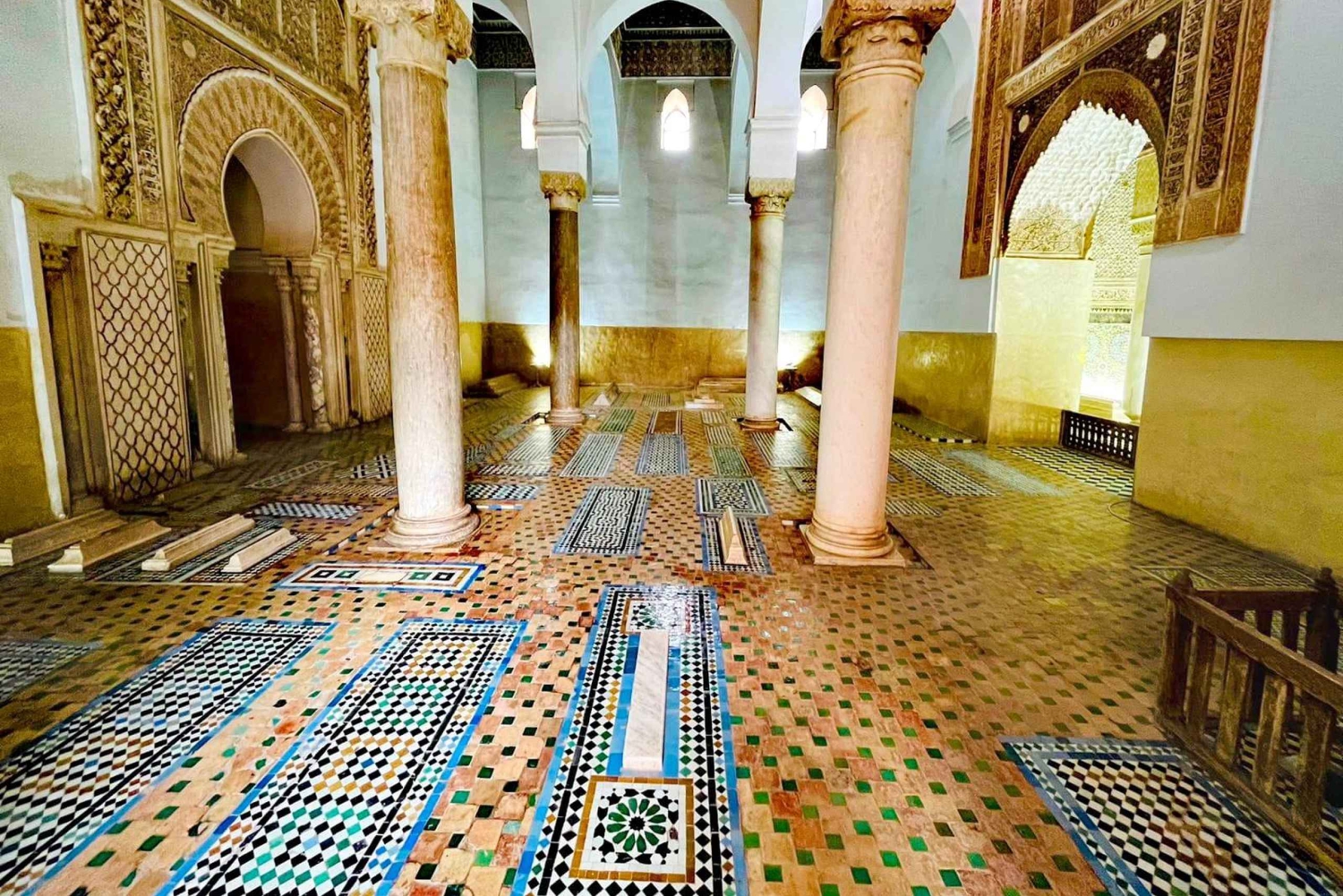 Cela fait longtemps que vous n'avez pas tenté quelque chose de spécial. Pourquoi ne pas vous traiter comme un aventurier et vous immerger dans la culture, les attractions et les coutumes marocaines ? Embarquez pour un circuit unique qui vous transportera dans l'histoire ancienne en visitant la Jemaa el-Fnaa, la mosquée de la Koutoubia, le quartier juif et le palais de la Bahia. Parallèlement à ces sites historiques, vous découvrirez la modernité vibrante de Marrakech. Découvrez les joyaux cachés de la ville, notamment les souks traditionnels où les artisans fabriquent des produits exquis, et profitez d'une visite d'ateliers locaux où vous pourrez observer l'artisanat marocain traditionnel en action. Votre guide professionnel vous révélera les secrets de Marrakech et vous fournira des histoires captivantes et des idées pendant que vous vous promènerez dans l'ancienne Médina. Vous découvrirez les ruelles étroites, les marchés animés et les sites emblématiques, et savourerez les riches saveurs de la cuisine marocaine dans les restaurants locaux. Nous vous proposerons une plongée en profondeur dans la culture marocaine, avec des détails sur le mariage et les traditions familiales, les pratiques religieuses et les croyances, les langues parlées, les habitudes alimentaires, la politique et l'éducation. Préparez-vous à un voyage enrichissant qui mêle les aspects historiques, culturels et modernes du Maroc, et qui vous laissera des souvenirs inoubliables et une perspective plus large de ce pays fascinant.Includes
