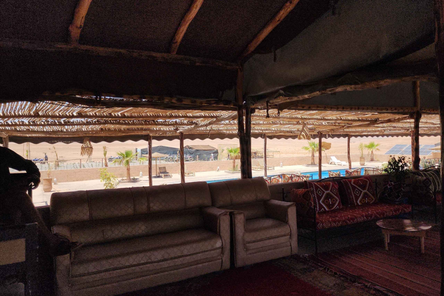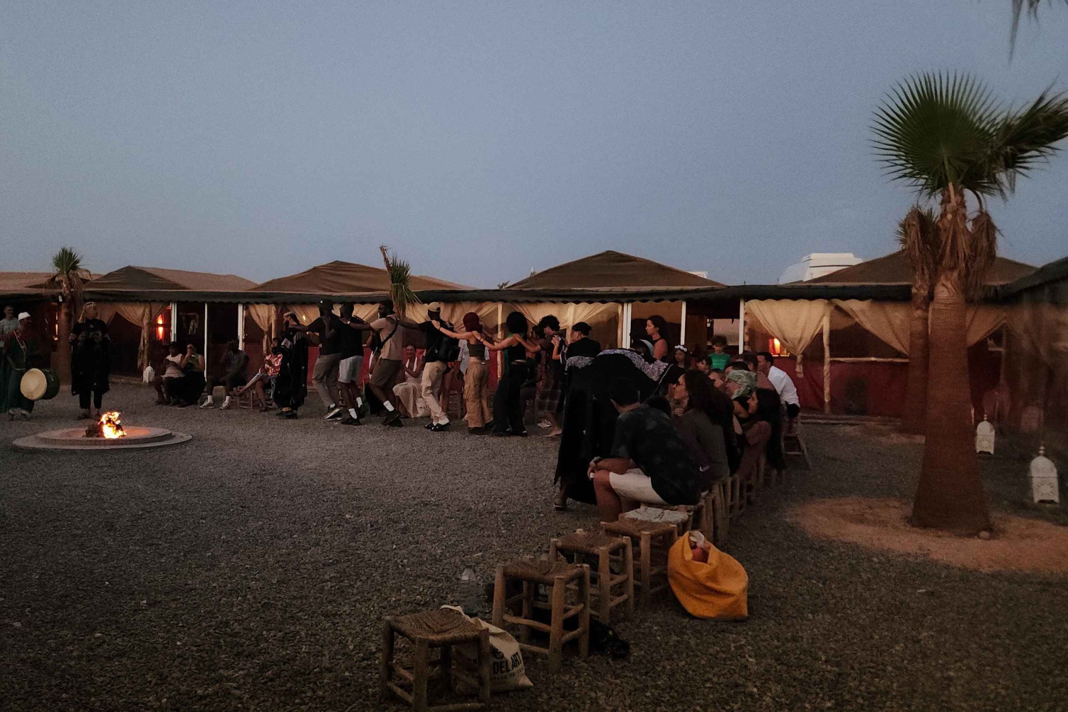 Balade à dos de chameau (20 min) Thé marocain traditionnel Piscine dans le désert Musique en direct Spectacle de feu Dîner marocain Transport gratuit dans la ville de Marrakech. Visite d'une coopérative d'huile d'arganEasy cancellation