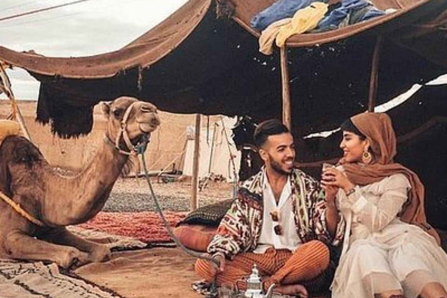 Marrakech Vivez une soirée spéciale avec nous lorsque nous vous emmenons de la ville animée de Marrakech au silence du désert d'Agafay. Départ de Marrakech à 16h00 en direction du désert d'Agafay, en chemin vous visiterez le barrage de Takerkoust (optionnel), vous prendrez un thé sur place puis vous vous rendrez dans le désert magique, dès votre arrivée vous serez invités à balader à dos de chameaux pour voir le coucher de soleil puis vous dégusterez un dîner local typique préparé par des cuisiniers locaux servi sous les départs en profitant de l'heure début du ciel, après le dîner de la musique locale jouée par une équipe locale pour finir l'aventure. Retour à Marrakech vers 22h00. Agafay : Nous nous dirigeons vers le camp du désert d'Agafay pour une expérience gastronomique unique. Admirez le coucher de soleil sur le désert et faites l'expérience de la véritable hospitalité berbère. Découvrez la cuisine marocaine traditionnelle sous un ciel étoilé. Dînez dans une tente nomade autour d'un feu de camp. Entendez le son inoubliable du silence du désert. Savourez un thé de bienvenue et des pâtisseries. Asseyez-vous pour un dîner composé de Harira (soupe traditionnelle), de salade, de tajine de bœuf et de poulet, et de fruits frais de saison avec du thé. Après cette soirée exceptionnelle, vous serez transféré à votre hébergement à Marrakech.Includes