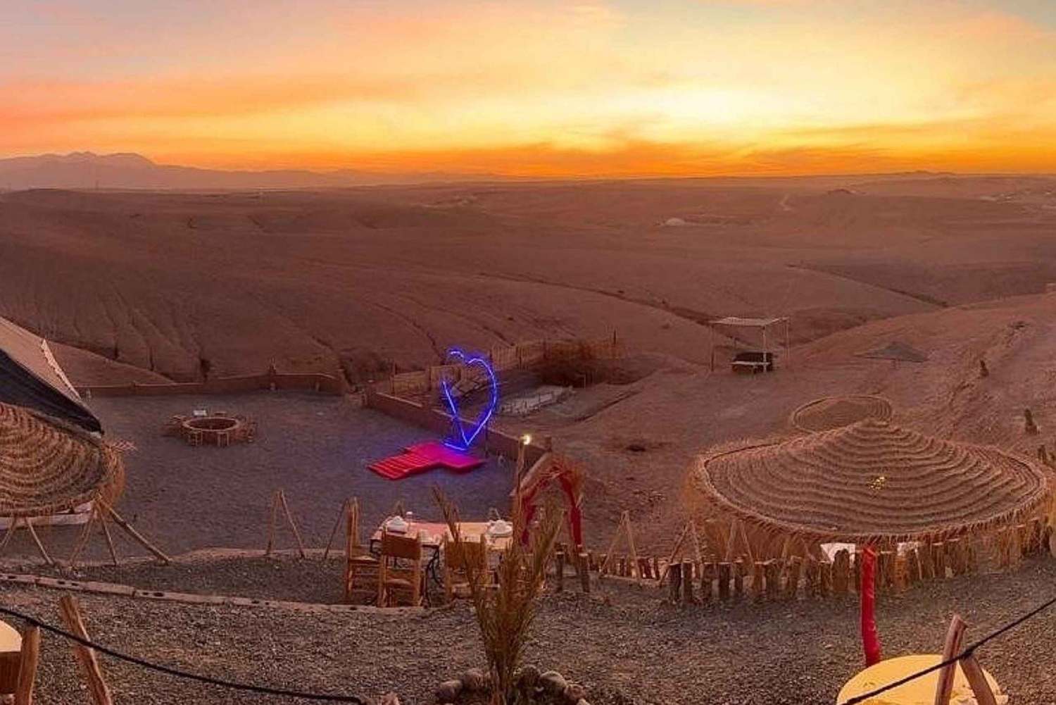 3089 AvisProfitez d'un dîner-spectacle magique dans le désert d'Agafay, juste à l'extérieur de Marrakech. Admirez le coucher du soleil à dos de chameau, puis savourez un délicieux repas sous une tente, suivi de musique locale et d'un spectacle de feu.