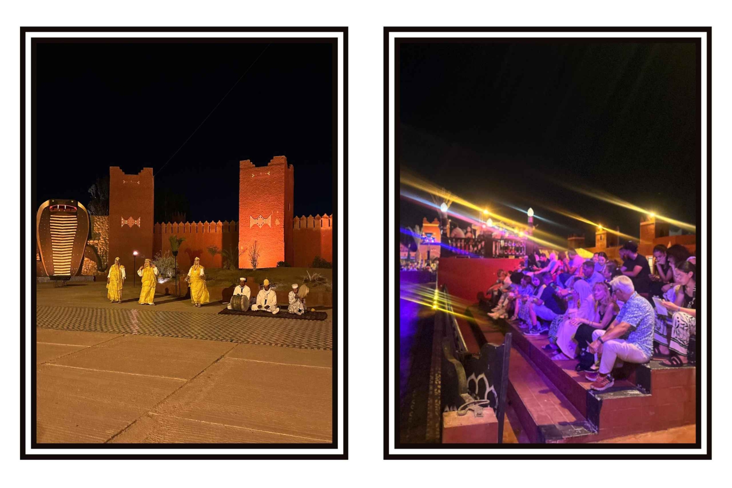 Départ chaque soir de votre hébergement à 20h f Profitez de l'entrée et explorez la Grotte d'Ali Baba. Dégustez un dîner marocain traditionnel et l'authentique tajine et couscous aux 7 légumes sous une tente et assistez à un spectacle mythique Chez Ali. Profitez d'un dîner traditionnel marocain en 4 services : Harira Accompagnée de Chebbakia + Dattes + Citron * Tajine d'agneau aux pruneaux ou Tajine de poulet au citron * Couscous aux 7 légumes * Jawhara (Pastilla au lait) * Fruits de saison * Thé à la menthe + pâtisseries marocaines Rejoignez le monde enchanteur de Chez Ali, un célèbre restaurant de luxe, avec un spectacle exceptionnel qui allie chants traditionnels, danses captivantes, équitation acrobatique et fantaisie palpitante. Le décor rappelle les Mille et une nuits, combinant palais royaux et tentes berbères ornées, pour une expérience gastronomique inoubliable.Includes