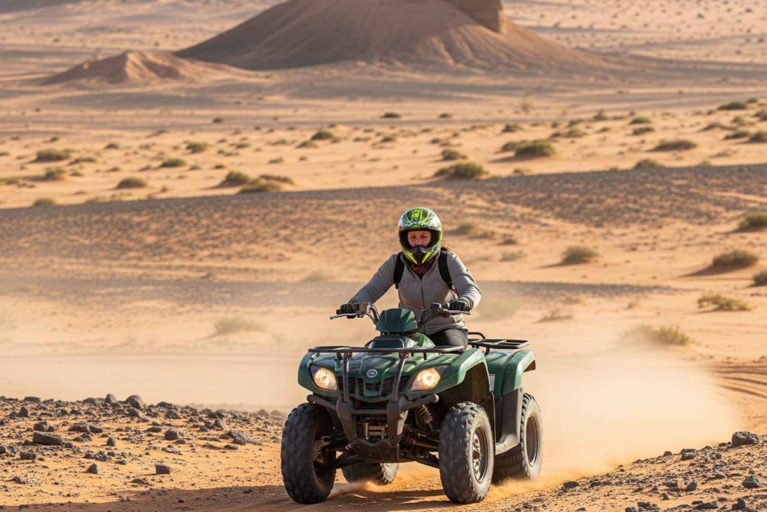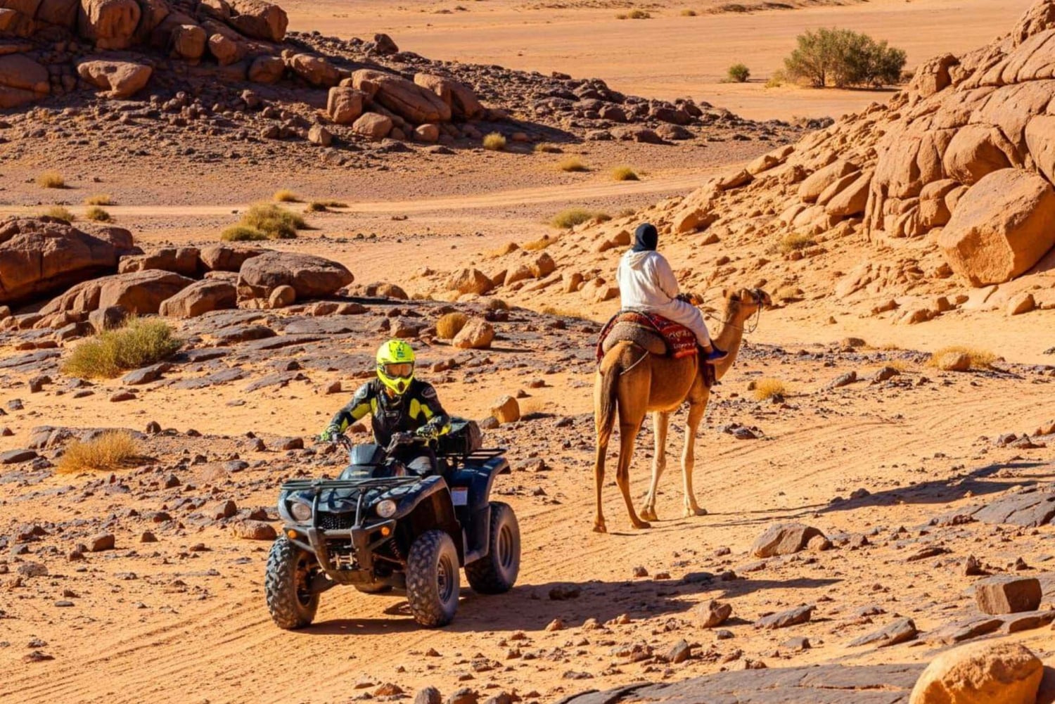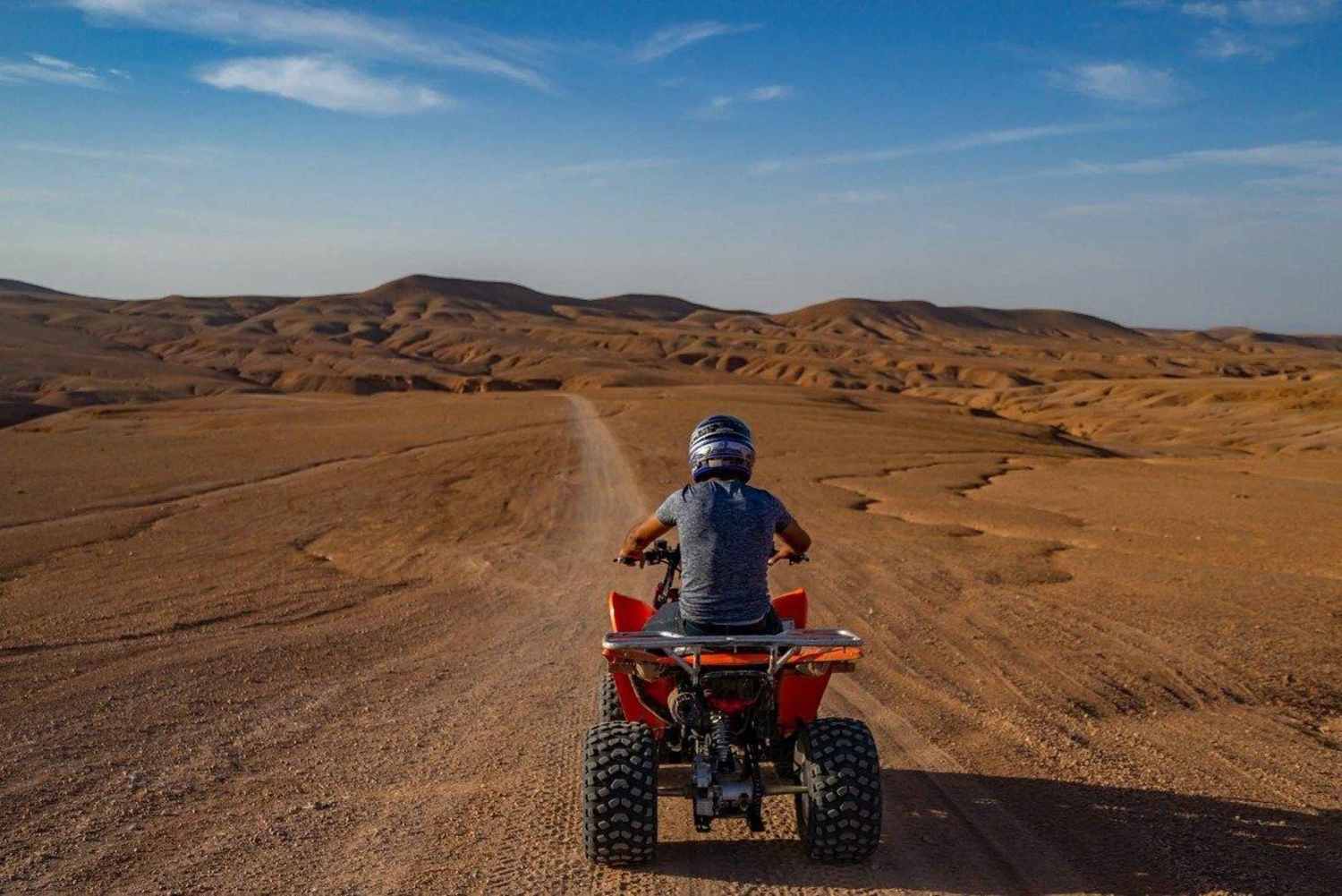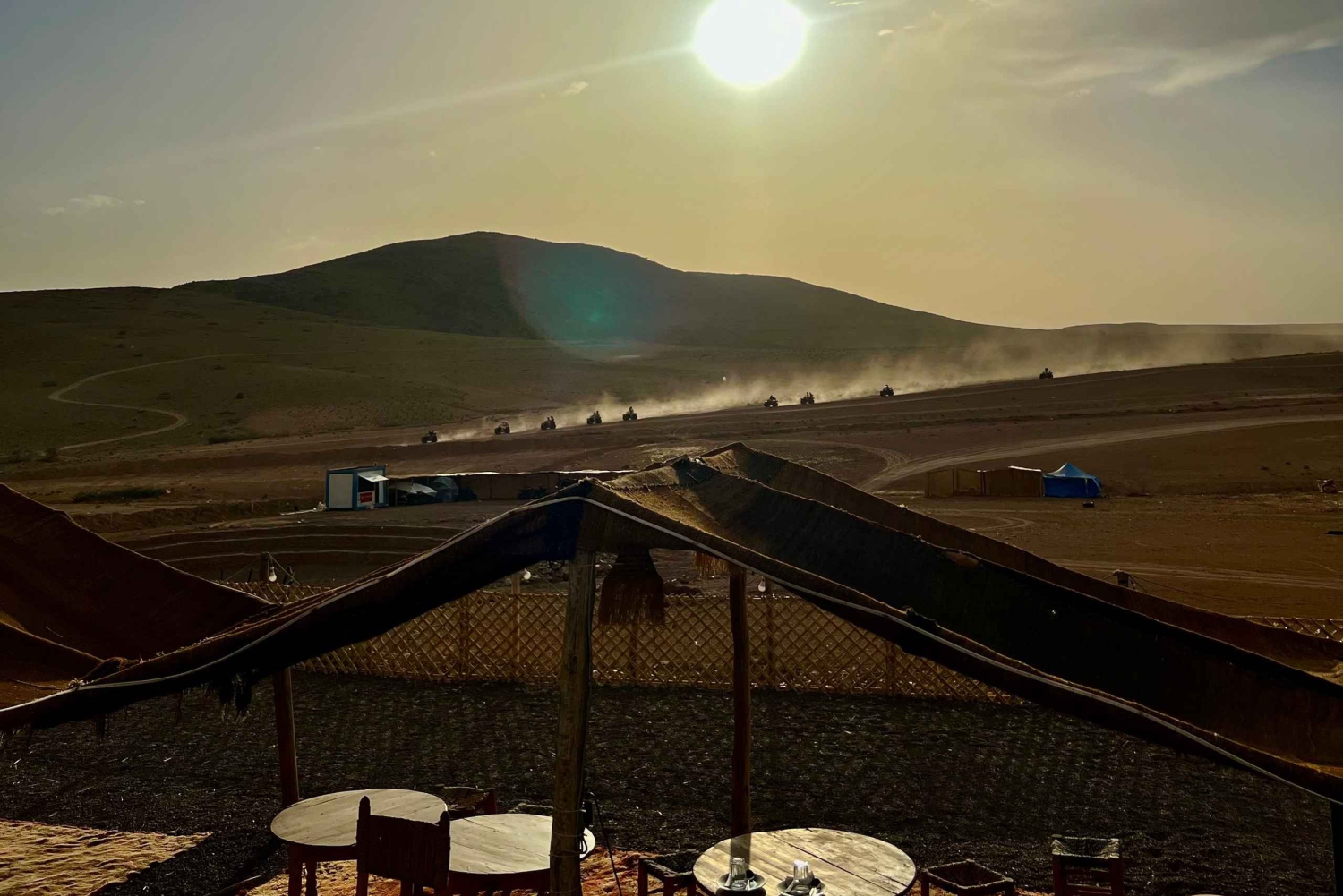 Échappez à l'agitation de Marrakech avec une excursion inoubliable dans le magnifique désert d'Agafay, où l'aventure, la culture et la détente se conjuguent pour une expérience unique. Ce voyage tout-en-un propose certains des meilleurs safaris dans le désert et des activités familiales que la région a à offrir. Commencez par une excursion en quad, partagez le frisson avec un ami ou un membre de votre famille sur un quad double, et explorez le terrain accidenté lors d'une promenade de 50 minutes. Ressentez l'adrénaline en parcourant les sentiers rocheux sous la direction d'un moniteur professionnel. Ralentissez le rythme avec une paisible balade à dos de chameau, en profitant d'une promenade de 30 minutes à travers les paysages dorés. C'est l'occasion idéale de prendre des photos et d'apprécier la beauté du désert tandis que le soleil se couche à l'horizon. Après l'action, laissez-vous tenter par une soirée luxueuse avec l'un de nos forfaits dîner authentiques. Installez-vous pour un dîner de luxe dans le désert sous les étoiles, en savourant la richesse de la cuisine marocaine. Des tajines au thé à la menthe, cette expérience est aussi savoureuse que pittoresque. La nuit se poursuit avec des spectacles captivants, comprenant de la musique en direct, une performance traditionnelle et un spectacle de feu éblouissant qui donne vie au désert. Pour ceux qui recherchent la sérénité, l'atmosphère paisible sous le ciel nocturne clair est idéale pour l'observation des étoiles ou simplement pour se détendre. Que vous soyez à la recherche d'aventure, d'immersion culturelle ou de bien-être et de spas pour vous détendre après votre voyage, cette expérience dans le désert d'Agafay a quelque chose pour tout le monde, y compris les couples, les amis et les familles. Vous pouvez même profiter d'un peu de paillettes avec des spectacles et des comédies musicales du désert qui célèbrent l'héritage marocain.Includes