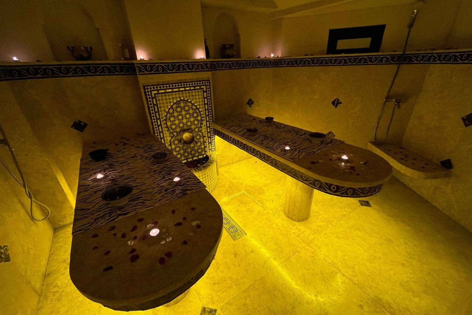Prova il ringiovanimento dell'hammam di Marrakech, guidato da terapisti esperti. Il viaggio inizia con una sessione di vapore per aprire i pori e rilassare i muscoli. In seguito, i terapisti esfoliano la pelle con una speciale miscela di ingredienti naturali, lasciandola liscia e luminosa. Goditi un trattamento rilassante che scioglie le tensioni e favorisce un profondo rilassamento. L'ambiente tranquillo della spa esalta l'esperienza di lusso, rendendola una fuga perfetta dallo stress quotidiano. Ogni fase del rituale dell'hammam è studiata meticolosamente per offrire un'esperienza profondamente rilassante e rinfrescante. Lasciati coccolare dall'ambiente sereno della spa. La combinazione di vapore, esfoliazione e insaponatura crea un processo di ringiovanimento completo. Questo rituale tradizionale dell'hammam marocchino assicura un benessere e una tranquillità totali.Includes