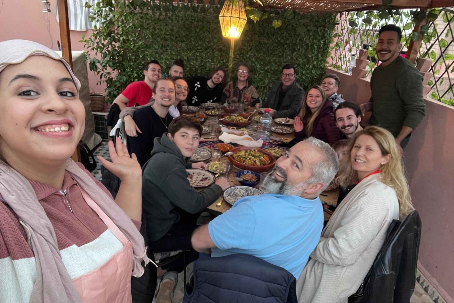 Lo chef ti aspetterà al punto di incontro 30 minuti prima dell'orario, Lo chef ti proporrà i menu e. Lo chef ti spiegherà i diversi ingredienti. Riceverai tutto il necessario per la ricetta e potrai anche scattare delle foto se lo desideri. Successivamente ti recherai in un'autentica casa marocchina nel cuore della Medina. Sarai accolto con tè, caffè o succo di frutta marocchini e con una conversazione aperta con la famiglia dello chef. Sarà un'occasione per conoscere meglio la cultura e il modo di vivere di una tipica famiglia marocchina. Il corso inizierà spiegandoti tutte le spezie che puoi assaggiare nel cibo marocchino, nel caso in cui tu voglia acquistarle nei souk, in modo da sapere come sceglierle. Cucinerai poi l'antipasto (insalate marocchine o briwat), il piatto principale (tajine, couscous, tanjya....) e il dessert marocchino. Vegetariani, vegani o eventuali allergie non saranno un problema. Consumerai poi il pasto cucinato con la famiglia. Dopo il miglior pasto che potrai mai fare a Marrakech, alla fine della lezione ti verrà offerto un regalo.Includes