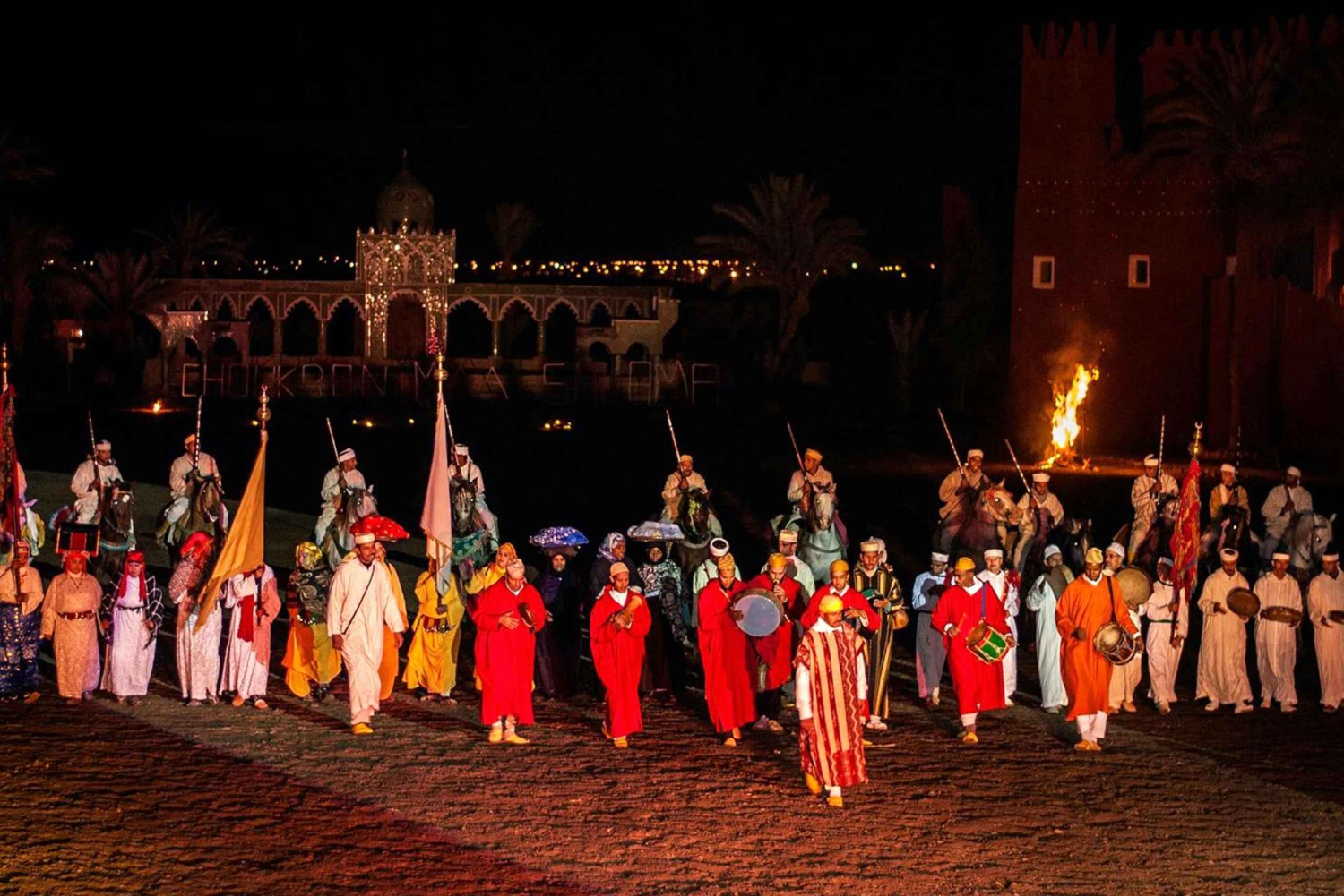 Immergetevi nel mondo della tradizione e dell'incanto marocchino con un'indimenticabile serata allo spettacolo Fantasia di Chez Ali a Marrakech. Situato appena fuori dalla vivace città, Chez Ali offre un'esperienza magica che unisce intrattenimento culturale, folklore e una cucina deliziosa in un ambiente davvero unico. La serata inizia con l'accoglienza in maestose tende caidali decorate con decorazioni tradizionali. Vi verrà servita una generosa cena marocchina, con piatti classici come la zuppa harira, il mechoui (agnello cotto lentamente), il couscous con verdure, frutta fresca e dolci tradizionali marocchini, il tutto accompagnato da tè alla menta. Durante la cena, lasciatevi intrattenere da spettacoli folcloristici dal vivo provenienti da diverse regioni del Marocco. Colorate compagnie di ballerini, musicisti e cantanti si spostano da un tavolo all'altro, mettendo in mostra il variegato patrimonio culturale del Marocco, tra cui le tradizioni berbere, arabe e Gnawa. Il momento clou della serata è lo spettacolare spettacolo Fantasia, che si tiene in un'arena all'aperto. Ammira abili cavalieri e amazzoni esibirsi in acrobazie emozionanti, tra cui cariche sincronizzate, acrobazie e battaglie simulate, ricreando scene della storia tribale del Marocco. Lo spettacolo si conclude con fuochi d'artificio e un suggestivo spettacolo di narrazioni, musica e luci. Una visita a Chez Ali è più di una semplice cena: è una celebrazione culturale e una serata memorabile per tutte le età.Includes
